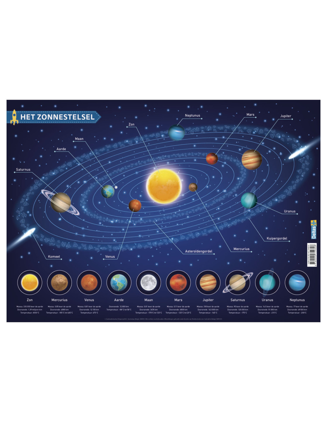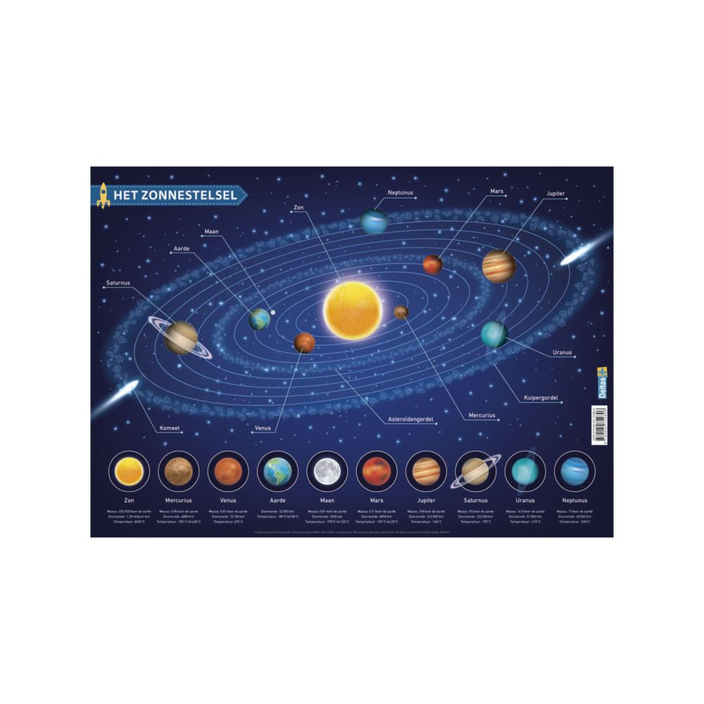 Op deze Educatieve onderlegger staat het zonnestelsel afgebeeld. Je hoeft maar 1 blik op de onderlegger te werpen en je weet wat de volgorde van de planeten is ten opzichte van de zon. De onderlegger is gemaakt van stevig pvc voor veelvuldig gebruik en door het overzichtelijke kleurrijke ontwerp wordt de belangrijkste leerstof gevisualiseerd, dit maakt het oefenen extra leuk!