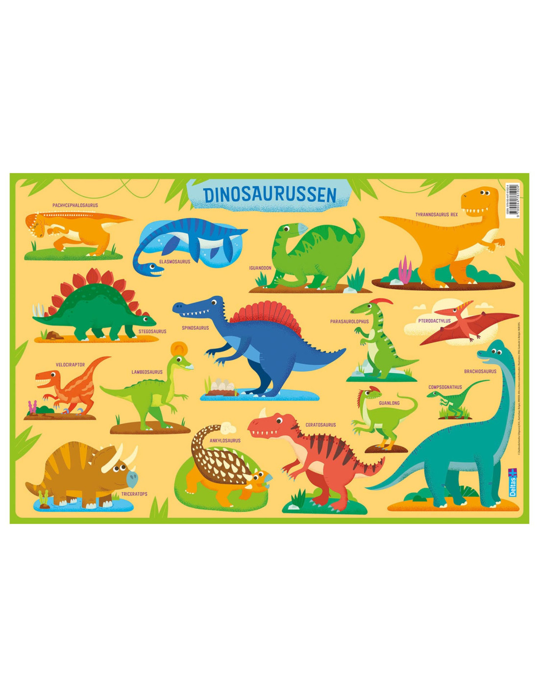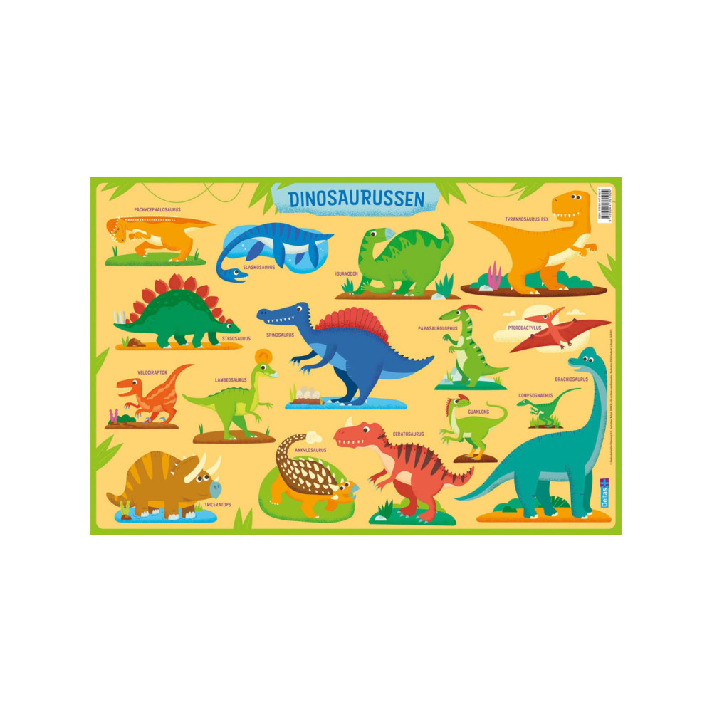 Deze onderlegger is speciaal voor kinderen die gek zijn op dinosaurussen. Dankzij de vrolijke en kleurrijke illustraties leert je kind op een speelse manier een heleboel dino's kennen: een tyrannosaurus rex, een iguanodon, een velociraptor, ... Makkelijk schoon te maken met een vochtige doek en geschikt voor contact met voedingswaren.
