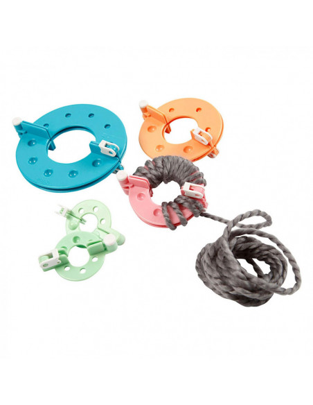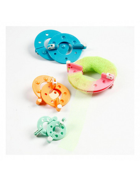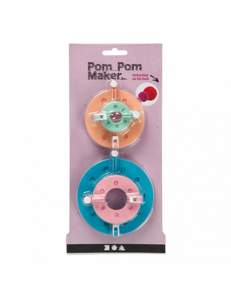 Praktisch hulpmiddel voor het maken van pom-poms in 4 maten. Instructies op de verpakking. Geschikt om een pompon te maken met een doorsnede van Ø: 3,5, 5,5, 7 en 9 centimeter.