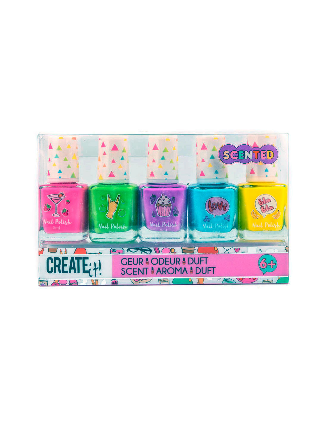 Vijf vrolijke potjes met nagellak met een lekker geurtje! De Create It! Nagellak Geur set ziet er niet alleen op je nagels, maar ook in de potjes mooi uit! De roze, paarse, groene, blauwe en gele nagellak potjes hebben een dop met een vrolijk driehoekpatroon. Ook zijn de 5 Create It! Nagellak Geur potjes voorzien van een kleurrijke afbeelding! Ook los van elkaar zijn ze leuk als traktatie of uitdeelcadeautje!