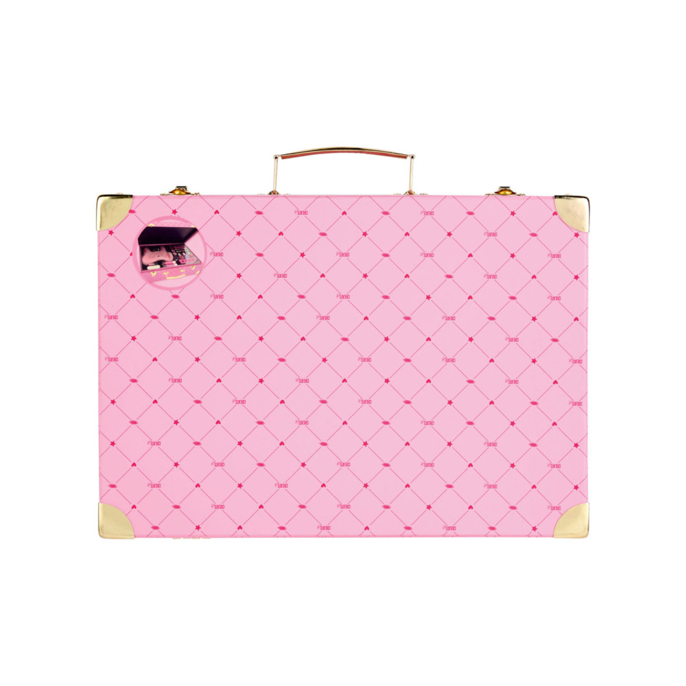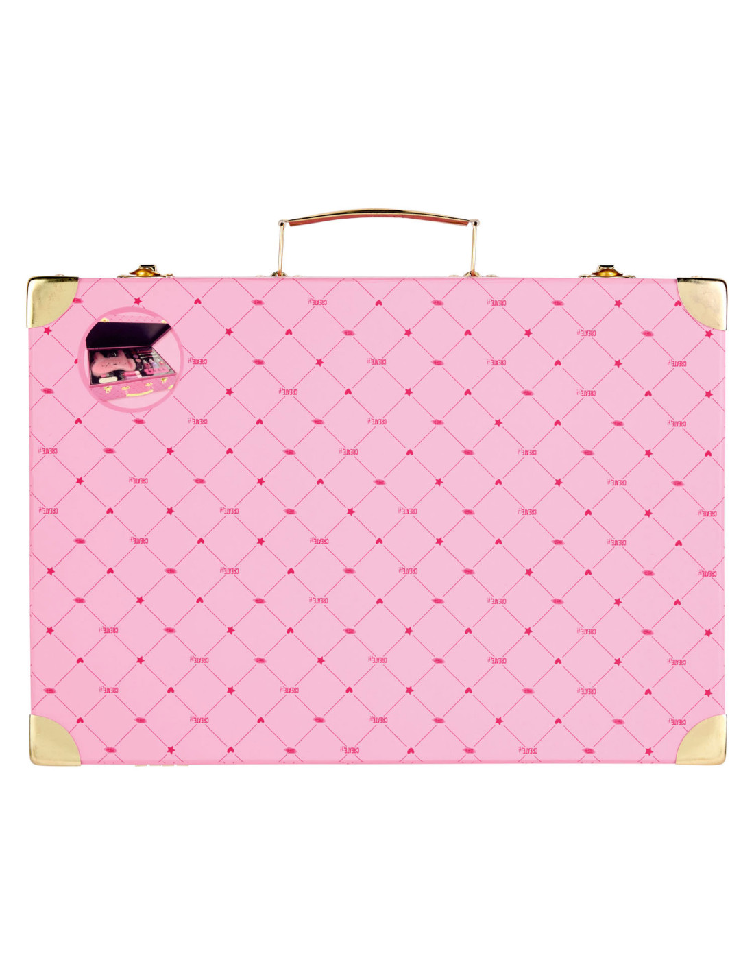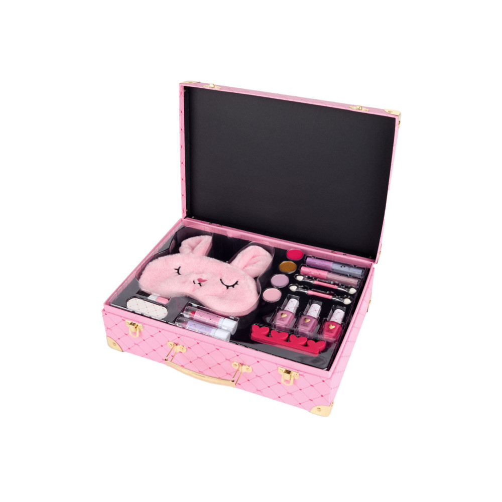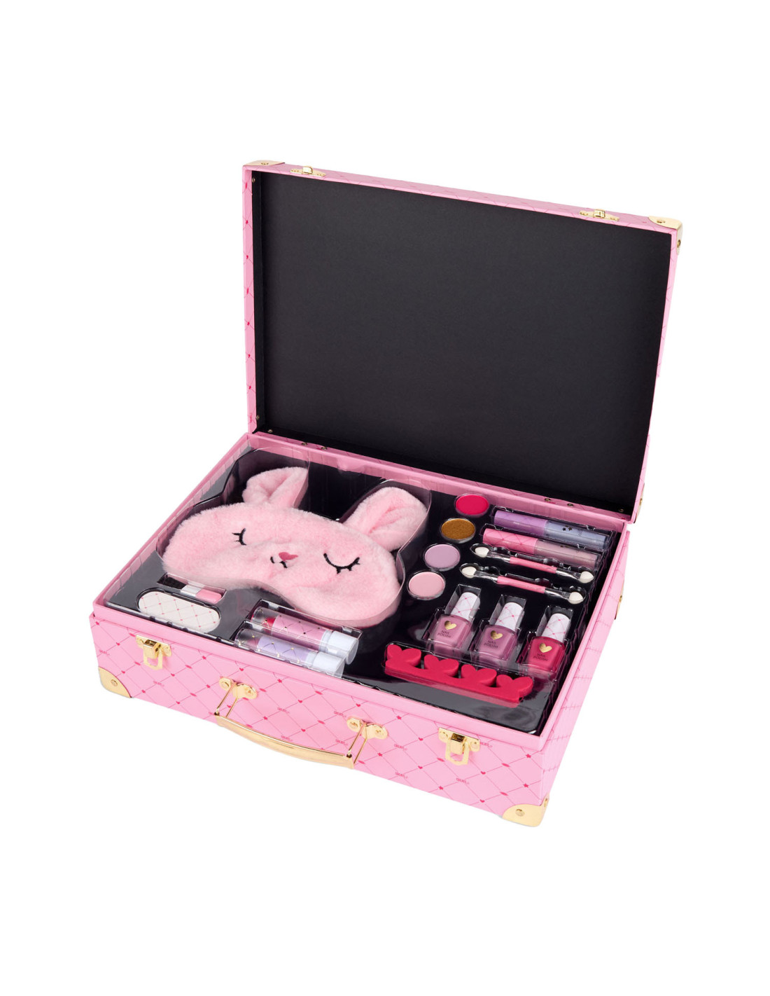 Maak je klaar voor een geweldige make-over met de Create it! Deluxe Make-up Case Goud! Deze stralende roze make-upkoffer met gouden accenten zit vol beauty essentials, waaronder een roze konijnenslaapmasker, een make-upborstel, een nagelvijl, 2 lippenstiften (roze en paars) met een vanillegeur, een teenspreider, 3 nagellakjes (2 roze en een paarse), 2 dubbelzijdige borsteltjes, 4 stralende oogschaduwkleuren (roze, pastelroze, paars en goud), en 2 lipglosses (roze met watermeloengeur en paars met bosbessengeur). Deze luxe set heeft alles wat je nodig hebt om fantastische looks te maken, waardoor het het perfecte cadeau is voor jonge beauty lovers die willen ontdekken en plezier willen hebben met make-up.