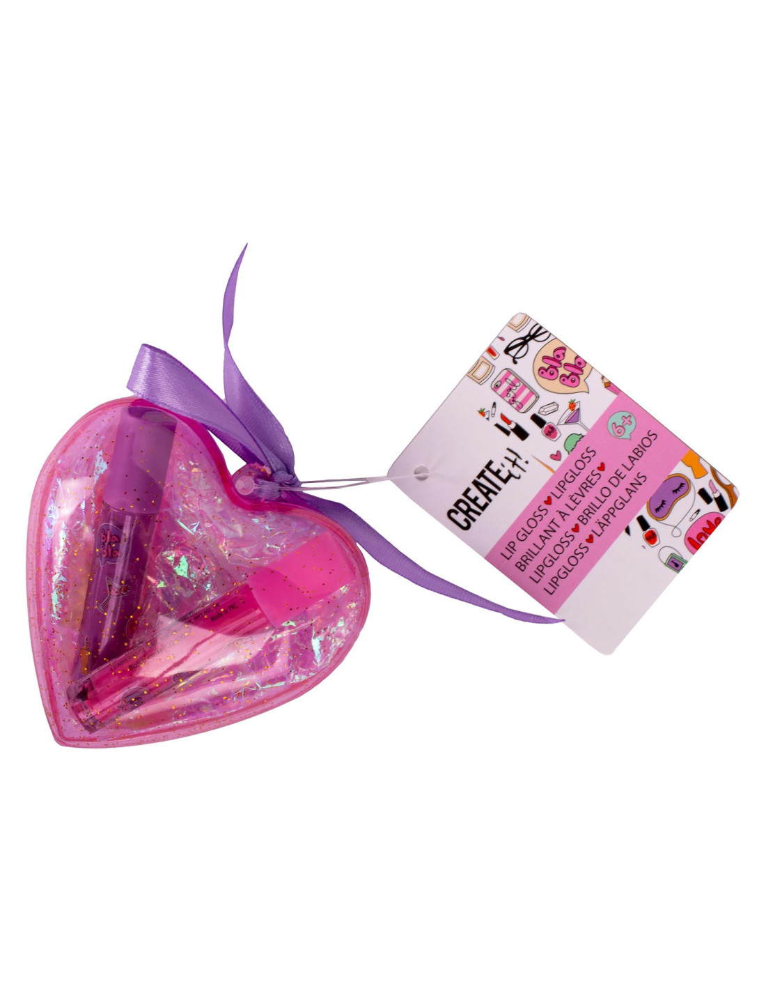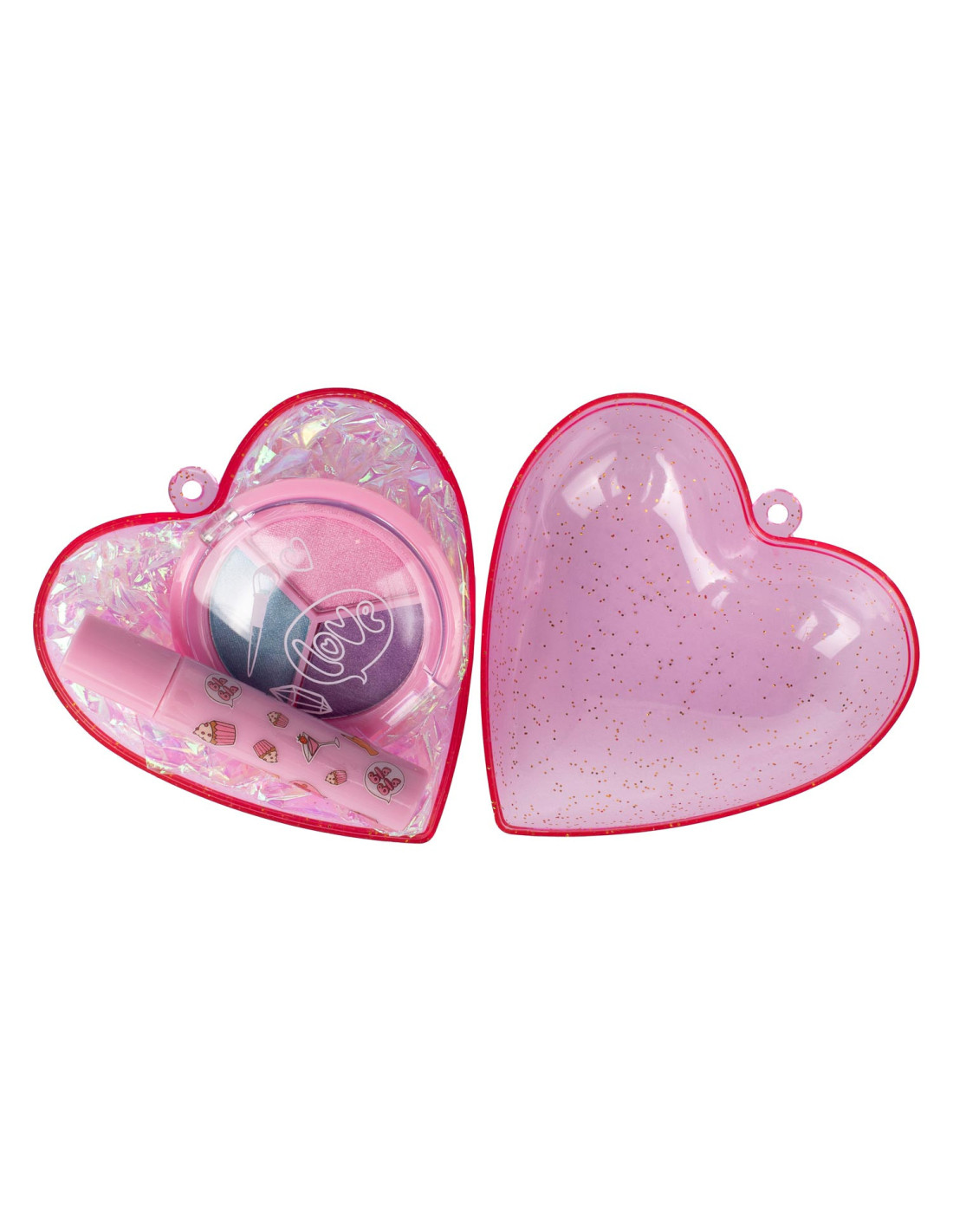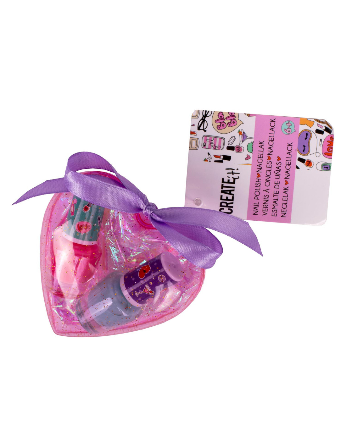 Kunststof hartje van Create It! gevuld met twee stuks speelgoedmake-up voor kinderen. Verkrijgbaar in drie setjes: 2 nagellakjes, oogschuw en mascara & 2 tinten lipgloss. Geschikt voor kinderen vanaf 6 jaar oud.