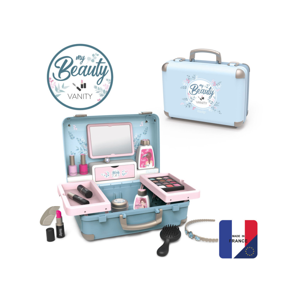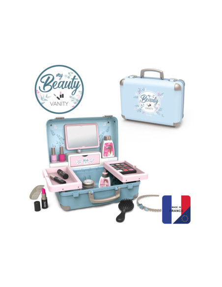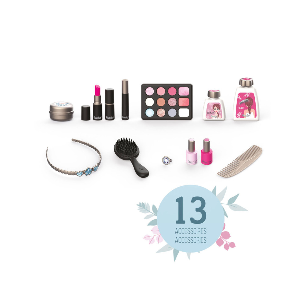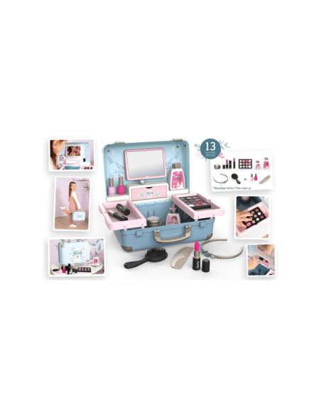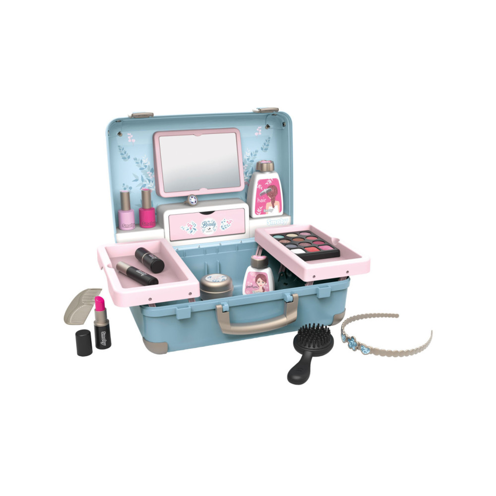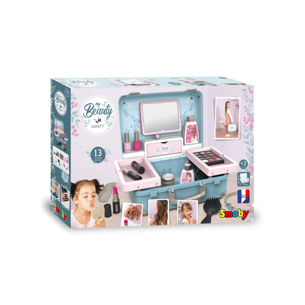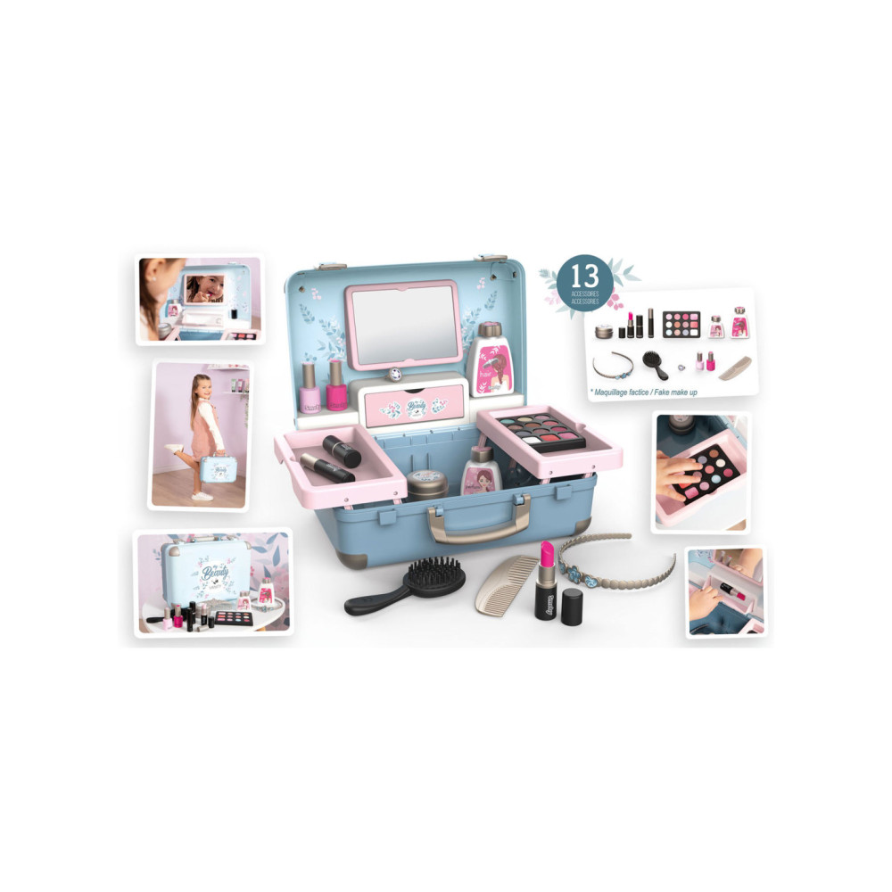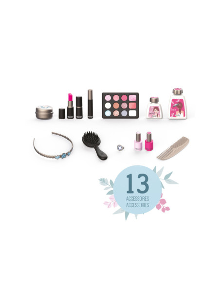 Met de Smoby My Beauty heeft je kind alles voor zich bereidheid om voor hem en zijn vrienden te zorgen! Hij is gemakkelijk mee te nemen en heeft 2 sluitingen en 1 handvat. In dit geval zijn 3 universums gegroepeerd: kapsel, nagelsalon, make-up. De 13 meegeleverde accessoires zijn perfecte replica's en beloven uren speelplezier: 2 poetsmiddelen, 2 lipsticks, 1 oogschaduwpalet, 1 mascara, 1 borstel, 1 kam, 1 haarband, 1 ring en verschillende flesjes. 1 echte spiegel en 1 geheim luik vormen ook het product. Uitschuifbare planken besparen optimale plaats en extra opslag. Geschikt vanaf 3 jaar.