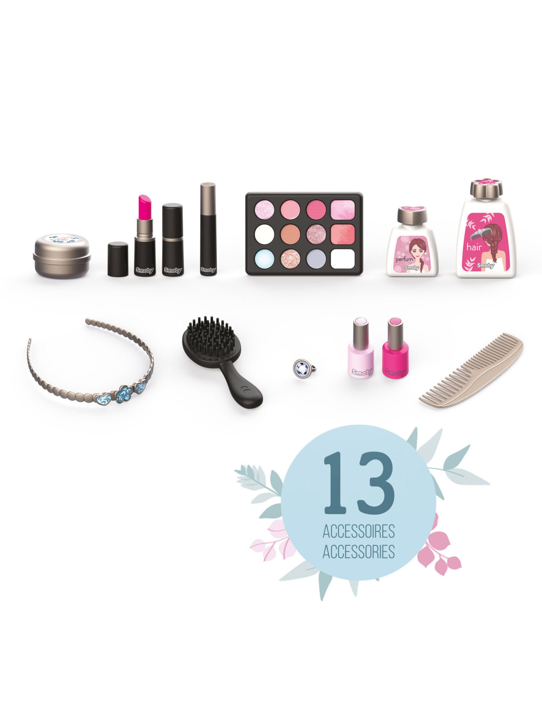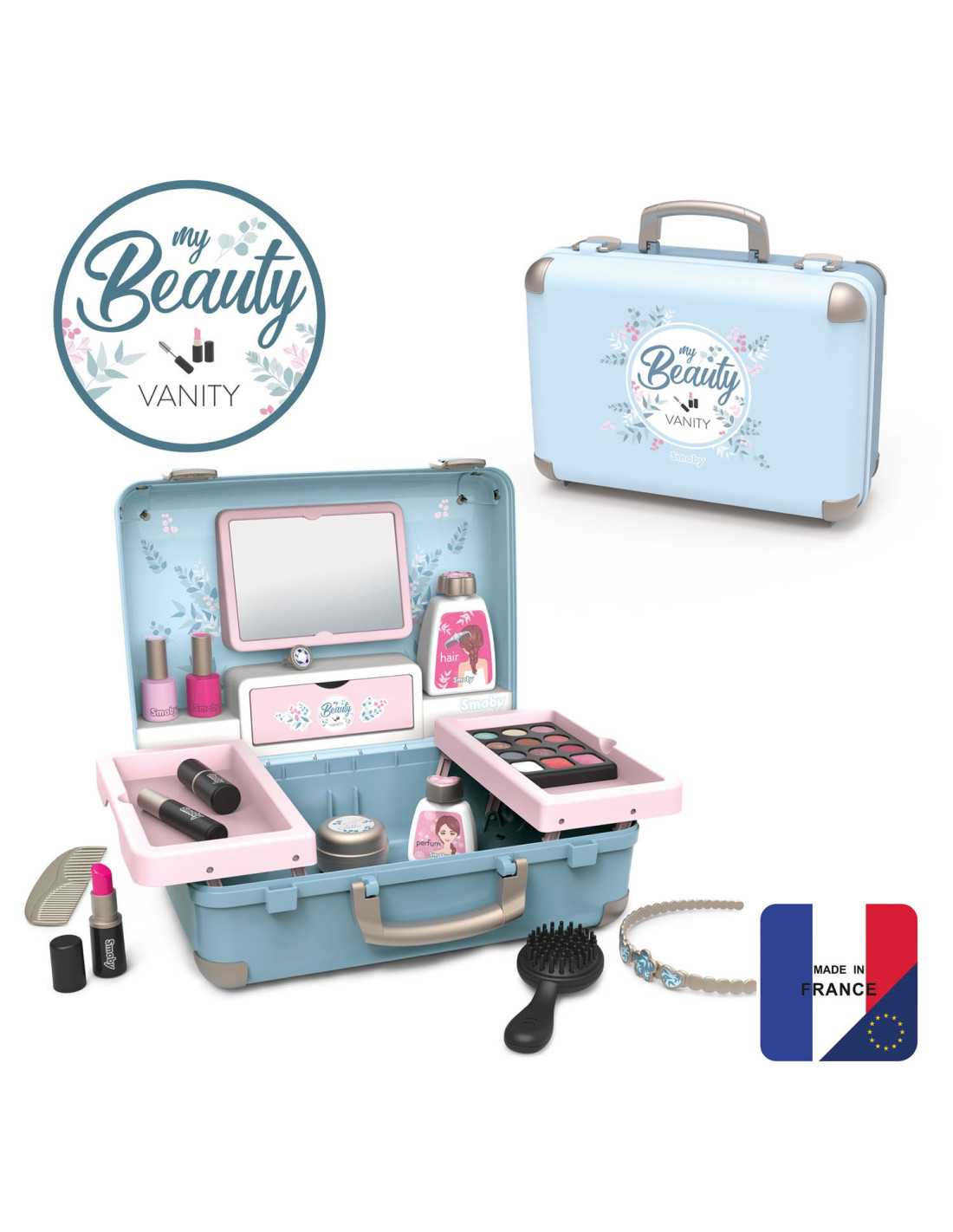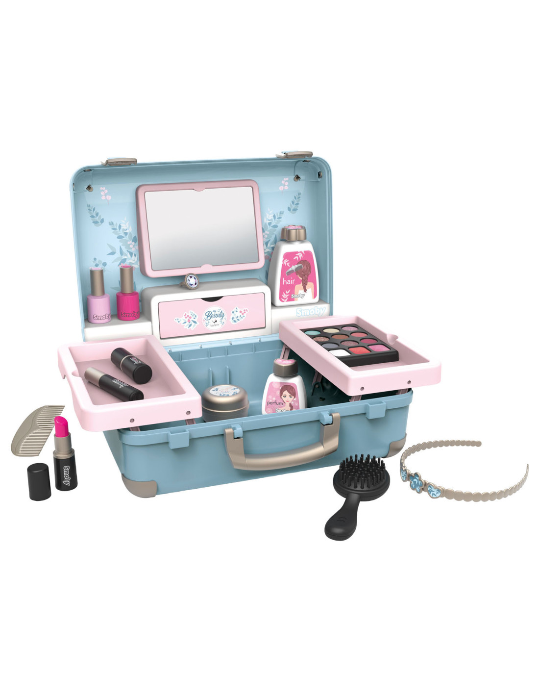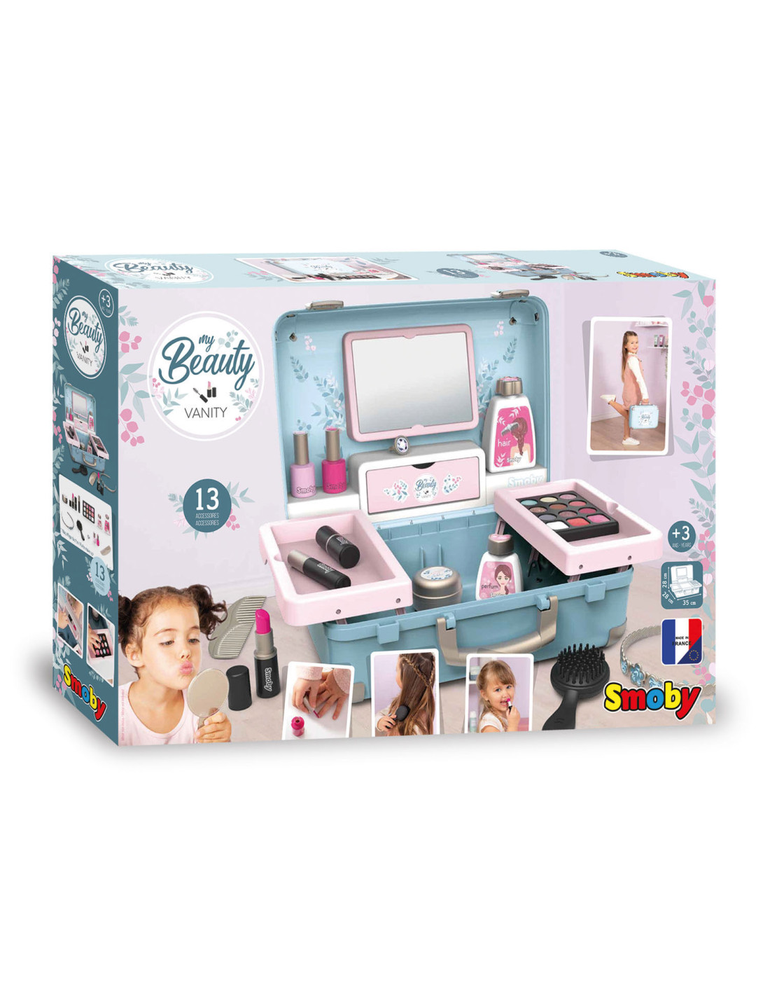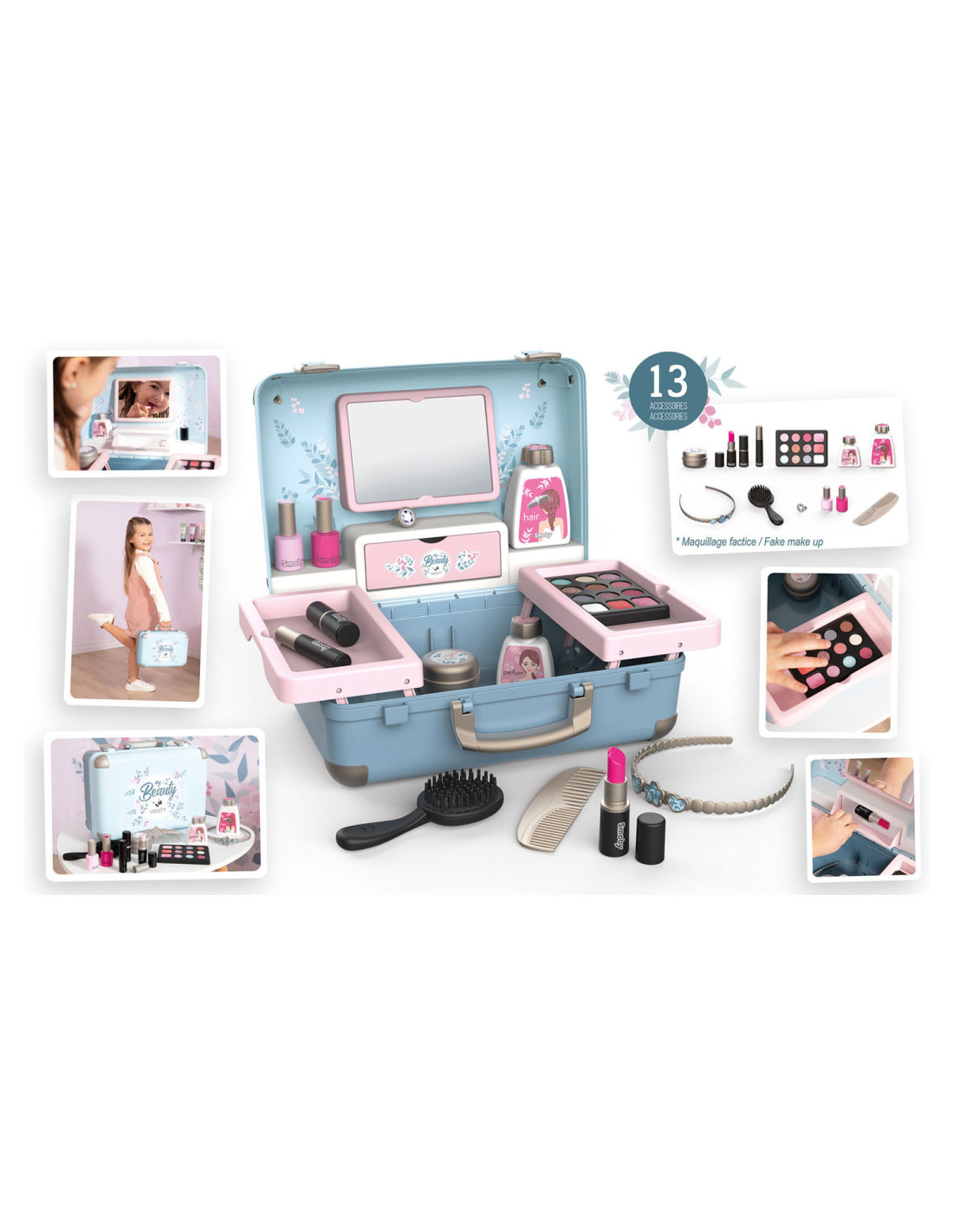 Met de Smoby My Beauty heeft je kind alles voor zich bereidheid om voor hem en zijn vrienden te zorgen! Hij is gemakkelijk mee te nemen en heeft 2 sluitingen en 1 handvat. In dit geval zijn 3 universums gegroepeerd: kapsel, nagelsalon, make-up. De 13 meegeleverde accessoires zijn perfecte replica's en beloven uren speelplezier: 2 poetsmiddelen, 2 lipsticks, 1 oogschaduwpalet, 1 mascara, 1 borstel, 1 kam, 1 haarband, 1 ring en verschillende flesjes. 1 echte spiegel en 1 geheim luik vormen ook het product. Uitschuifbare planken besparen optimale plaats en extra opslag. Geschikt vanaf 3 jaar.
