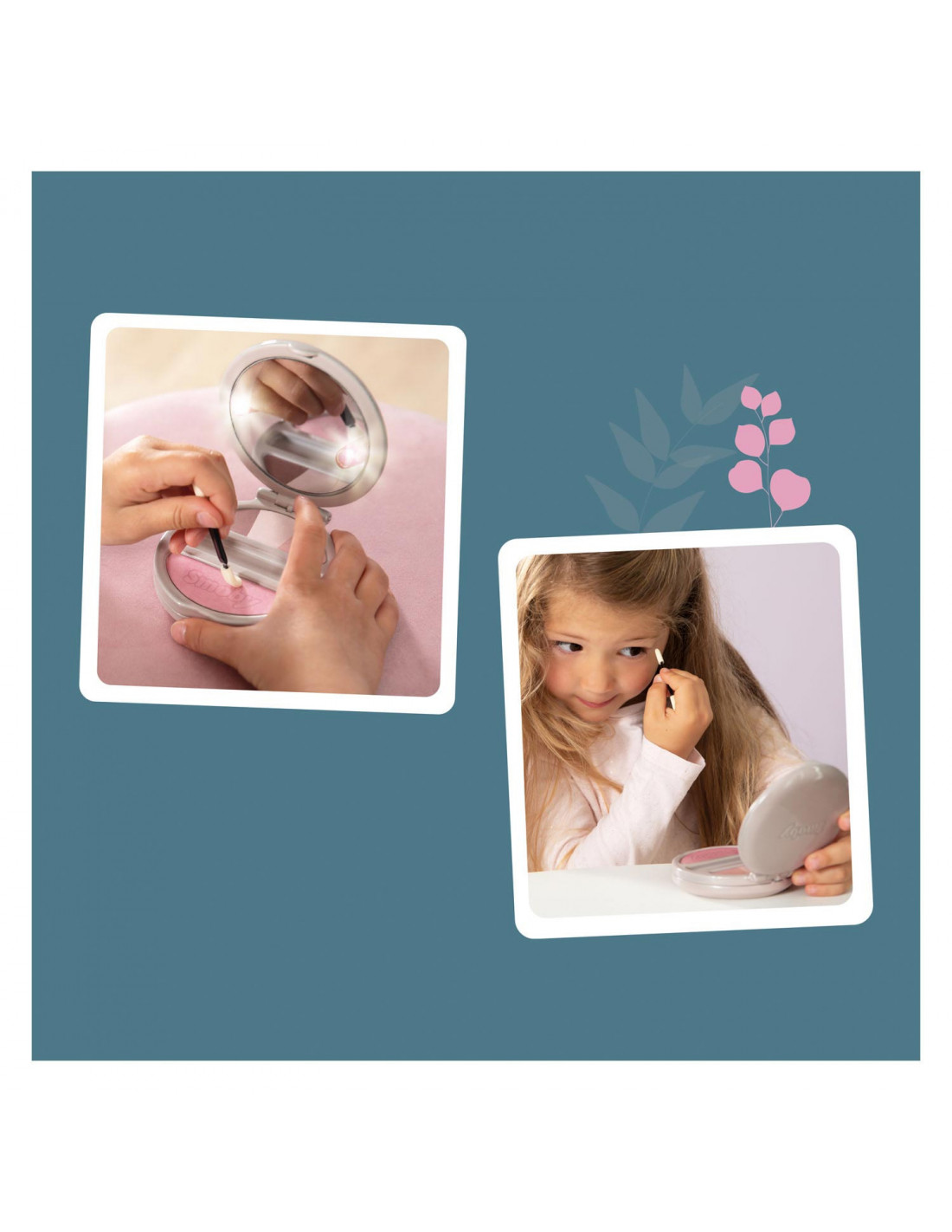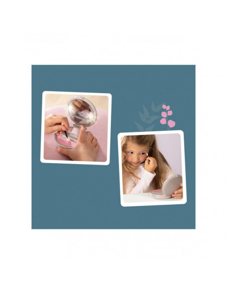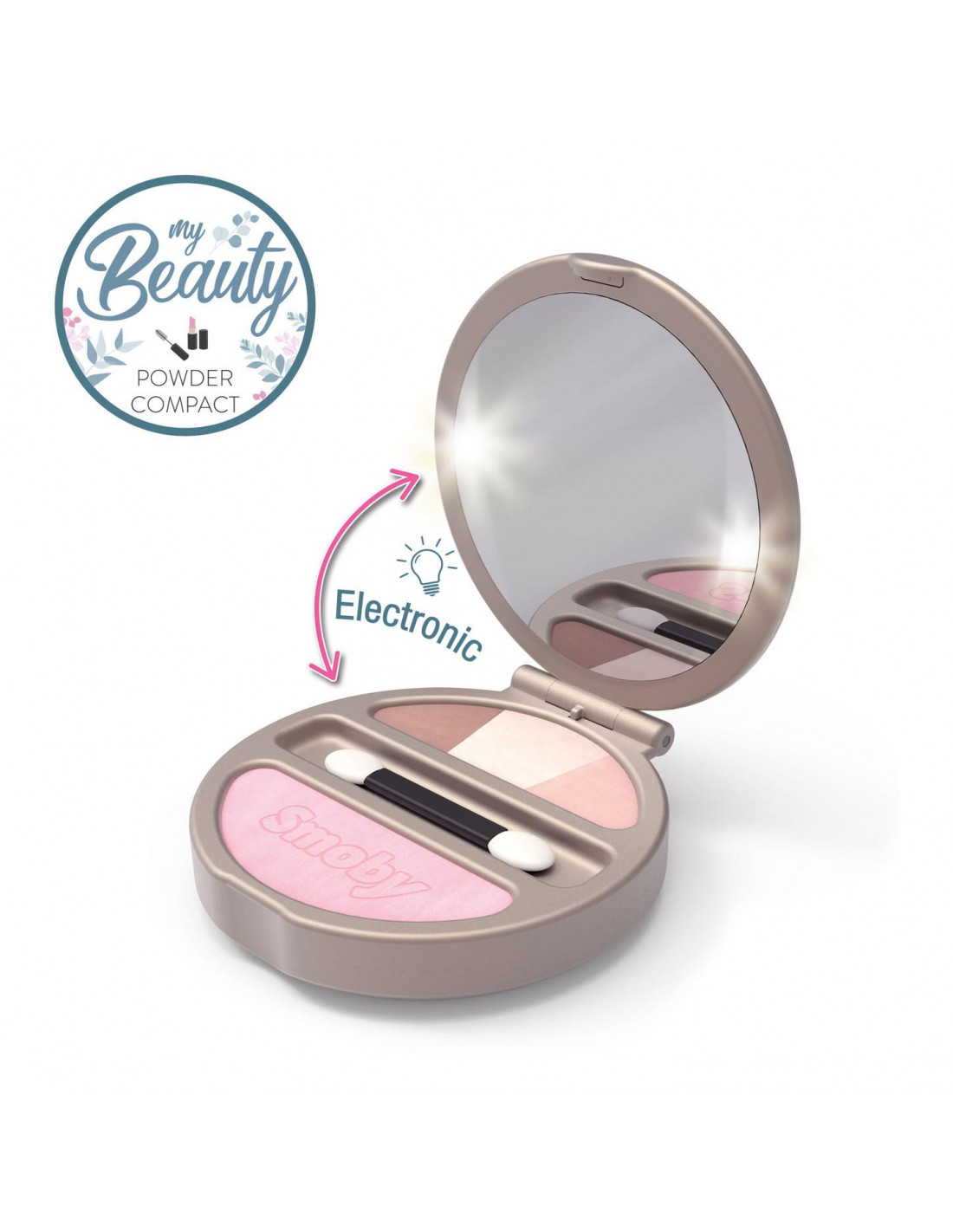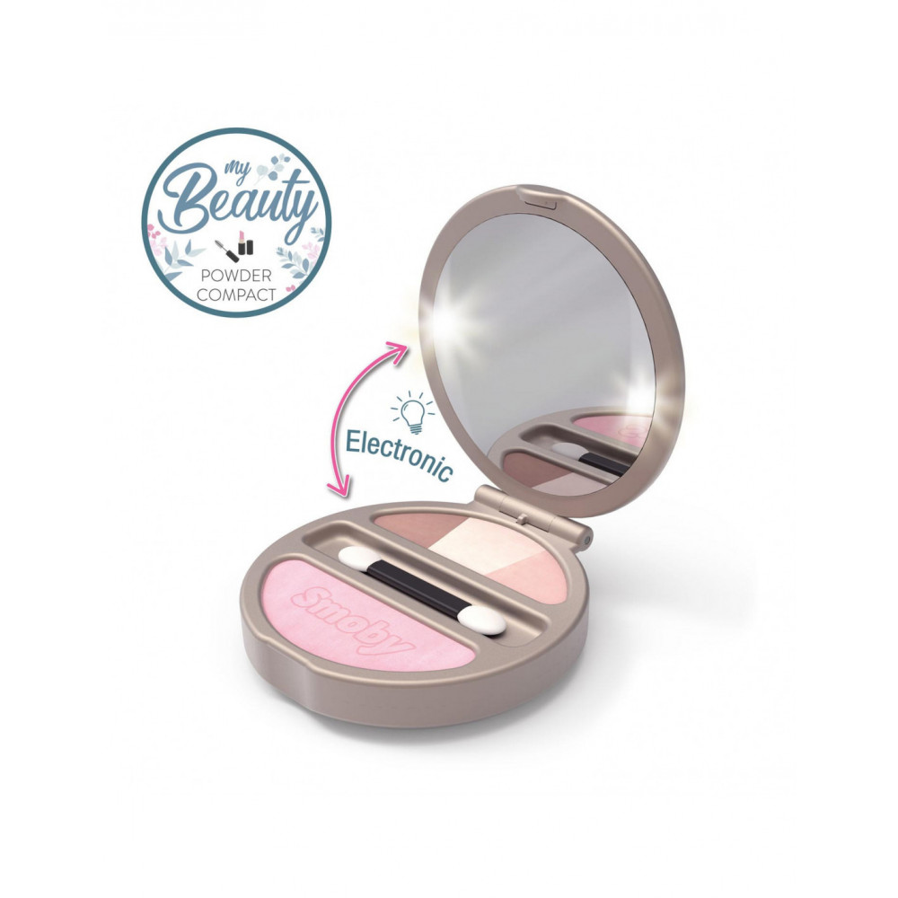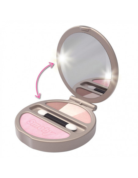 Speelgoed poederdoos van Smoby My Beauty, met spiegel en ingebouwd licht. Inclusief één kwastje en vier kleuren neppoeder. Werkt op 2 AAA-batterijen (niet inbegrepen) en geschikt voor kinderen vanaf 3 jaar.