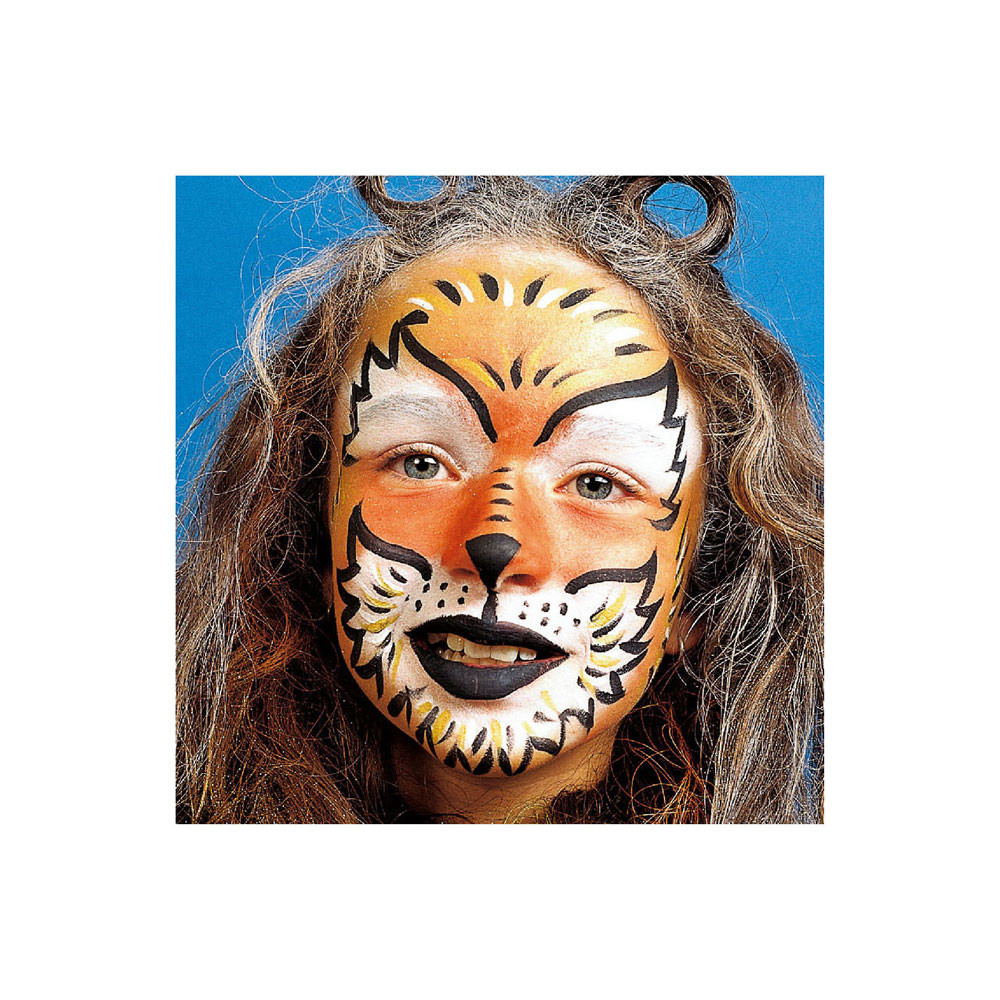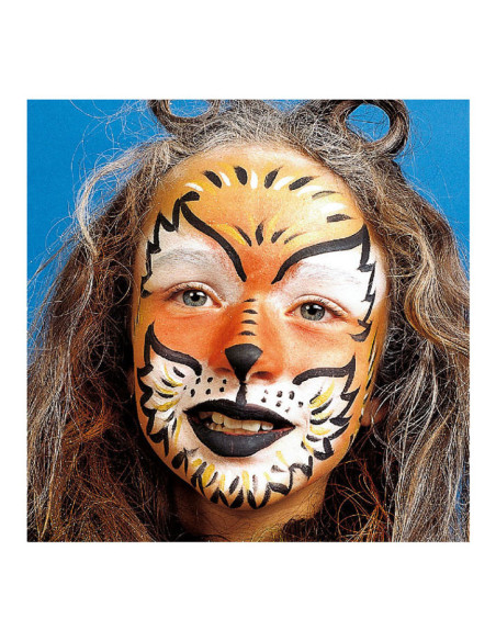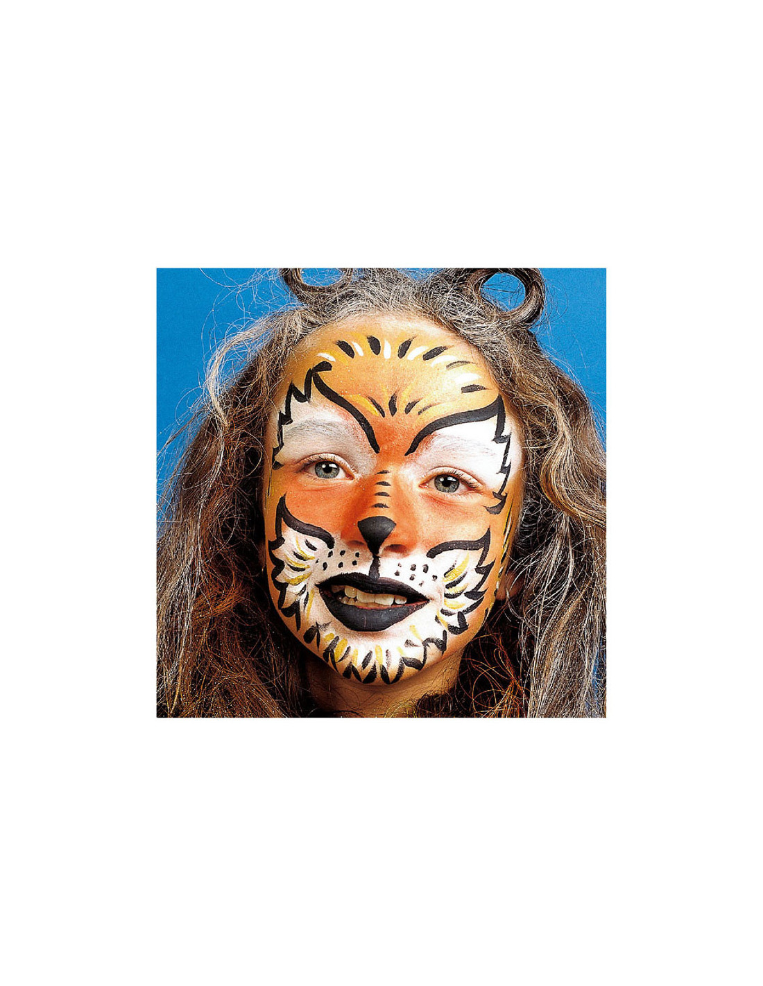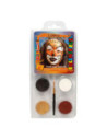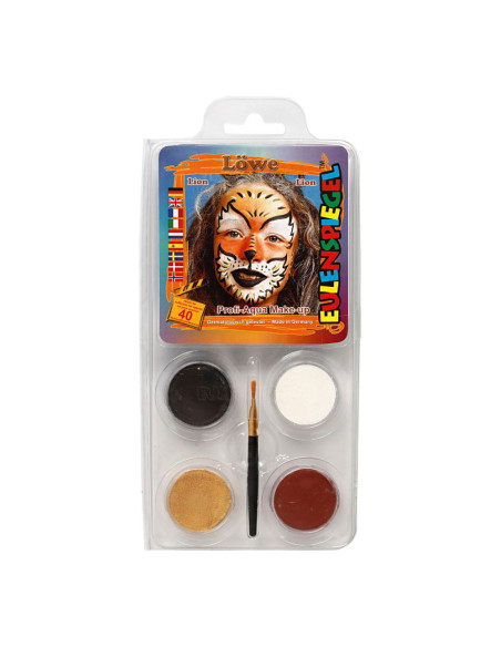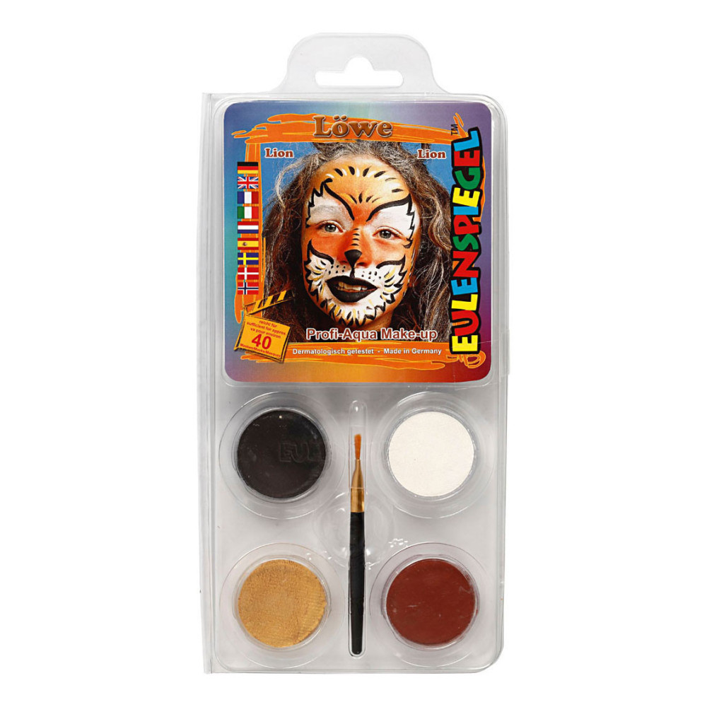 Starterset met schmink op waterbasis van Eulenspiegel voor circa 40 gezichten. Kleuren kunnen worden gemengd. Aanbrengen met een penseel of een spons. Afwassen met water en zeep.Inhoud: 4 kleuren van elk 3,5 ml, 1 penseel en uitleg