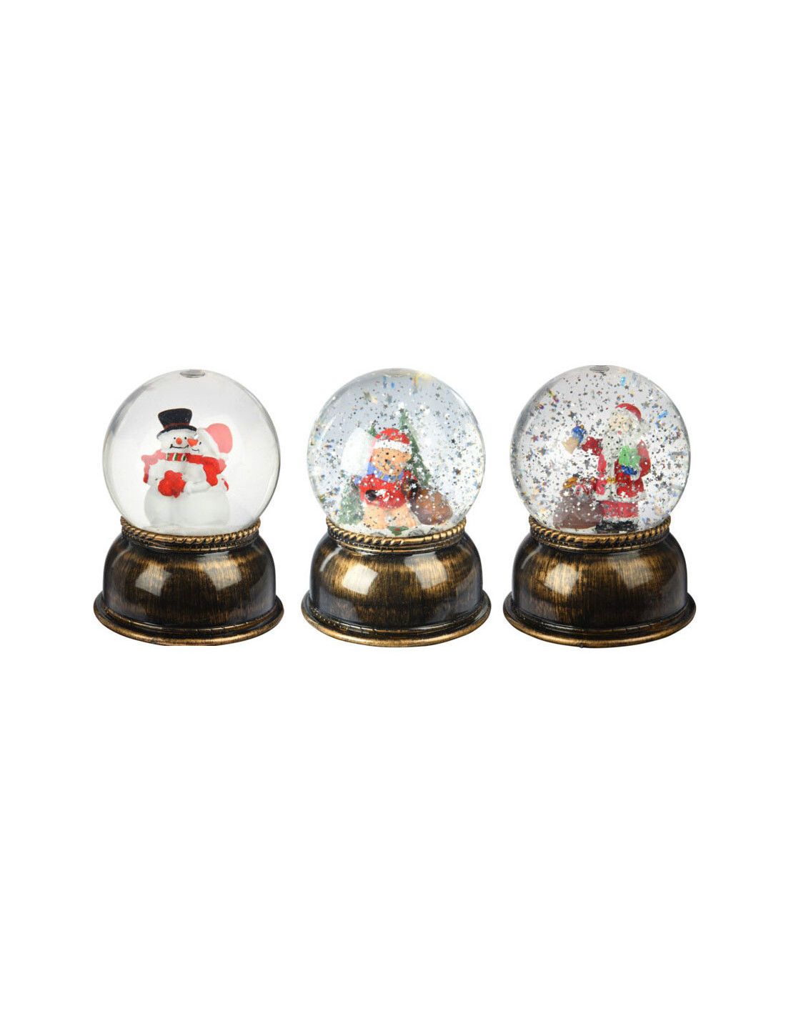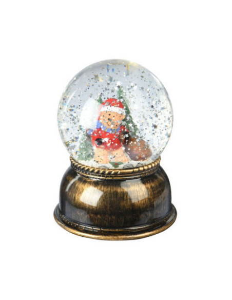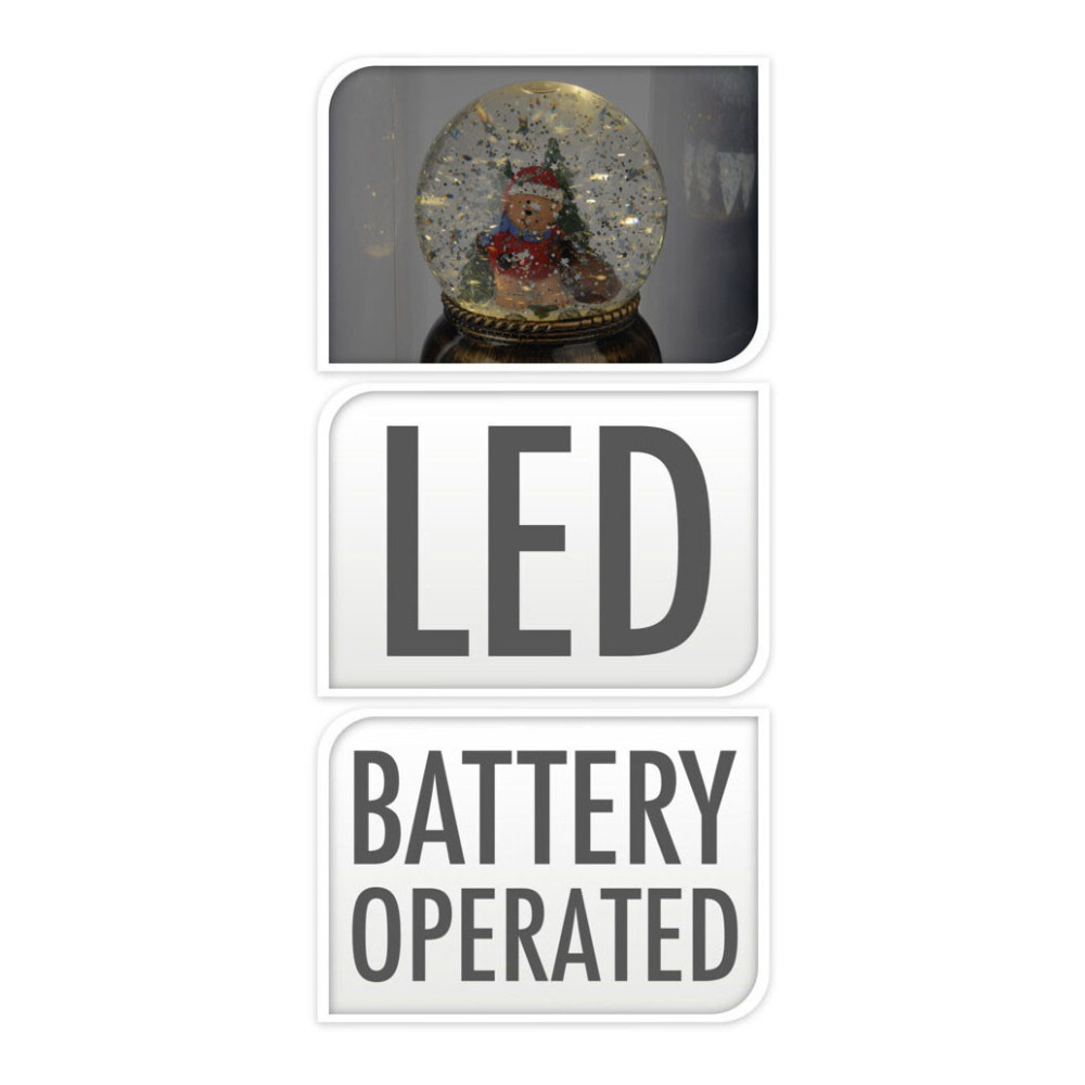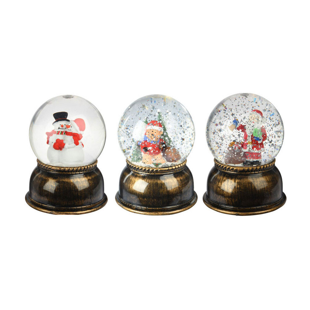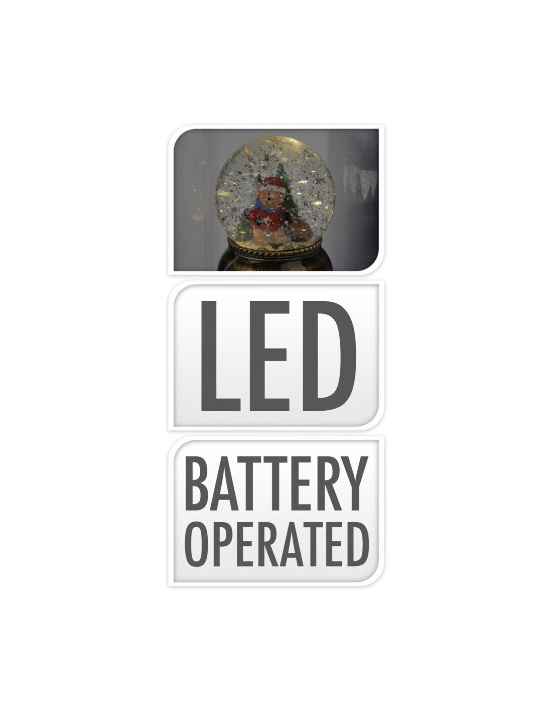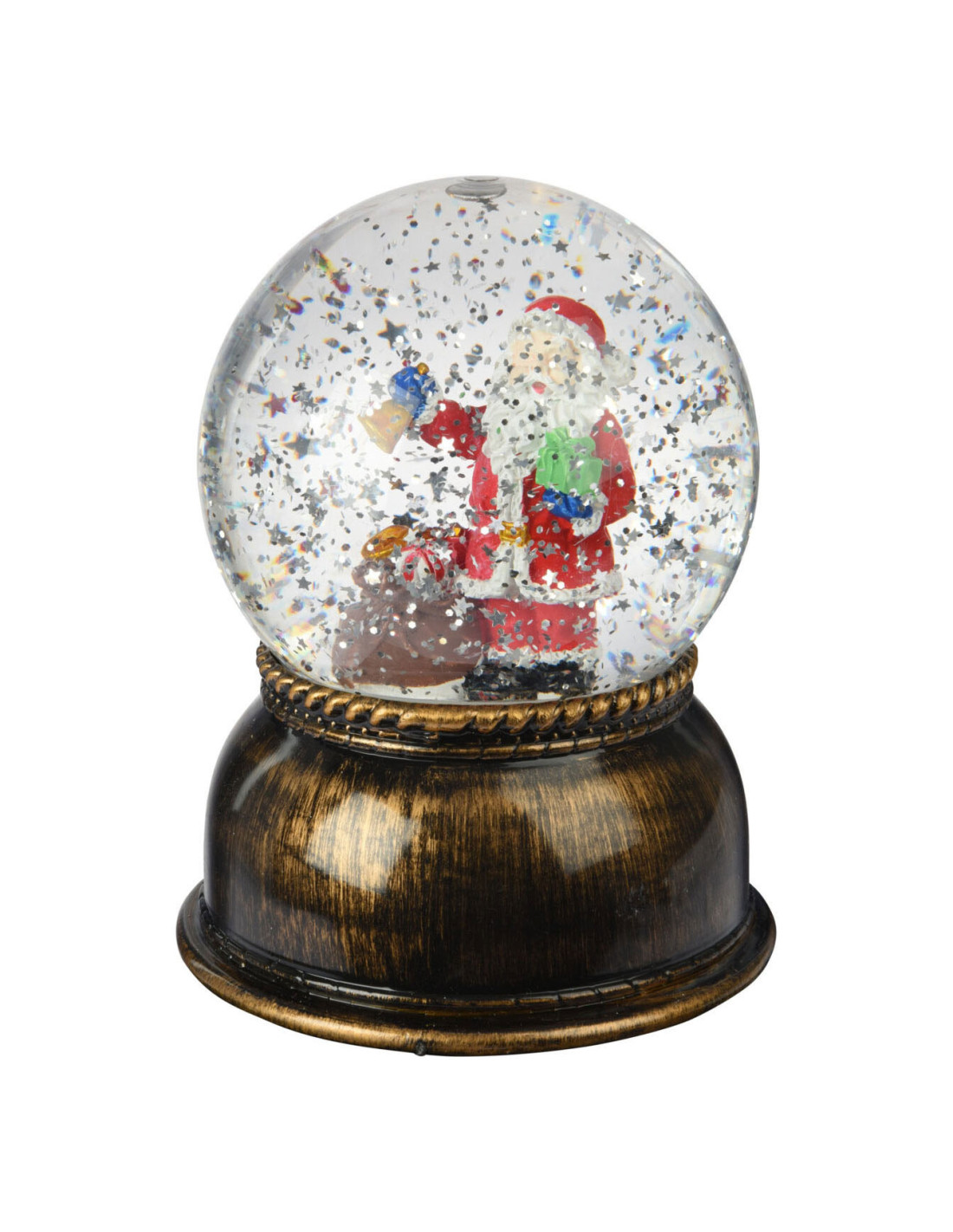 Water-/sneeuwschudbal met sterglitters, ledlicht en kerstfiguren. De schudbol is 14 centimeter groot en werkt op batterijen (niet inbegrepen). Niet geschikt voor kinderen jonger dan 3 jaar.