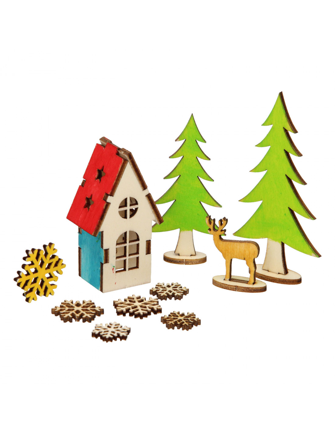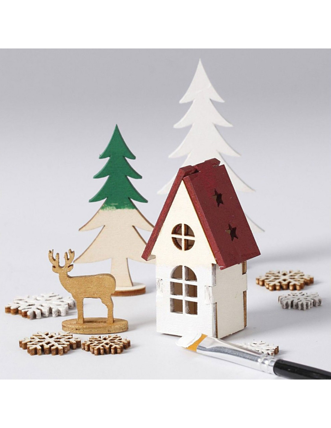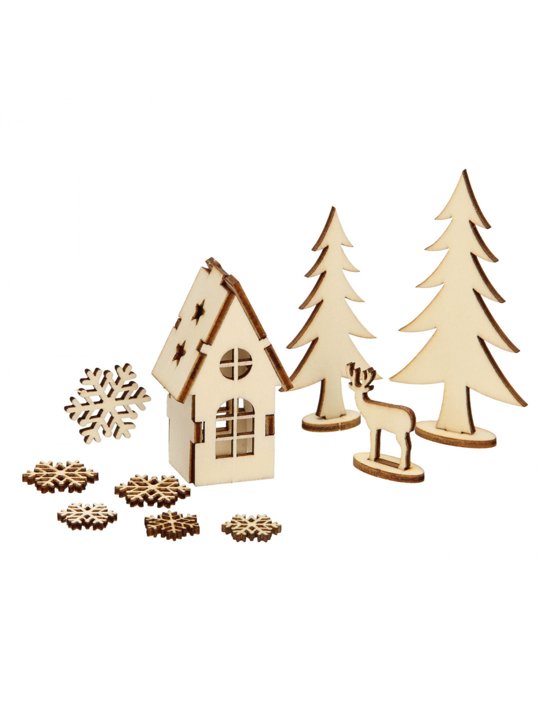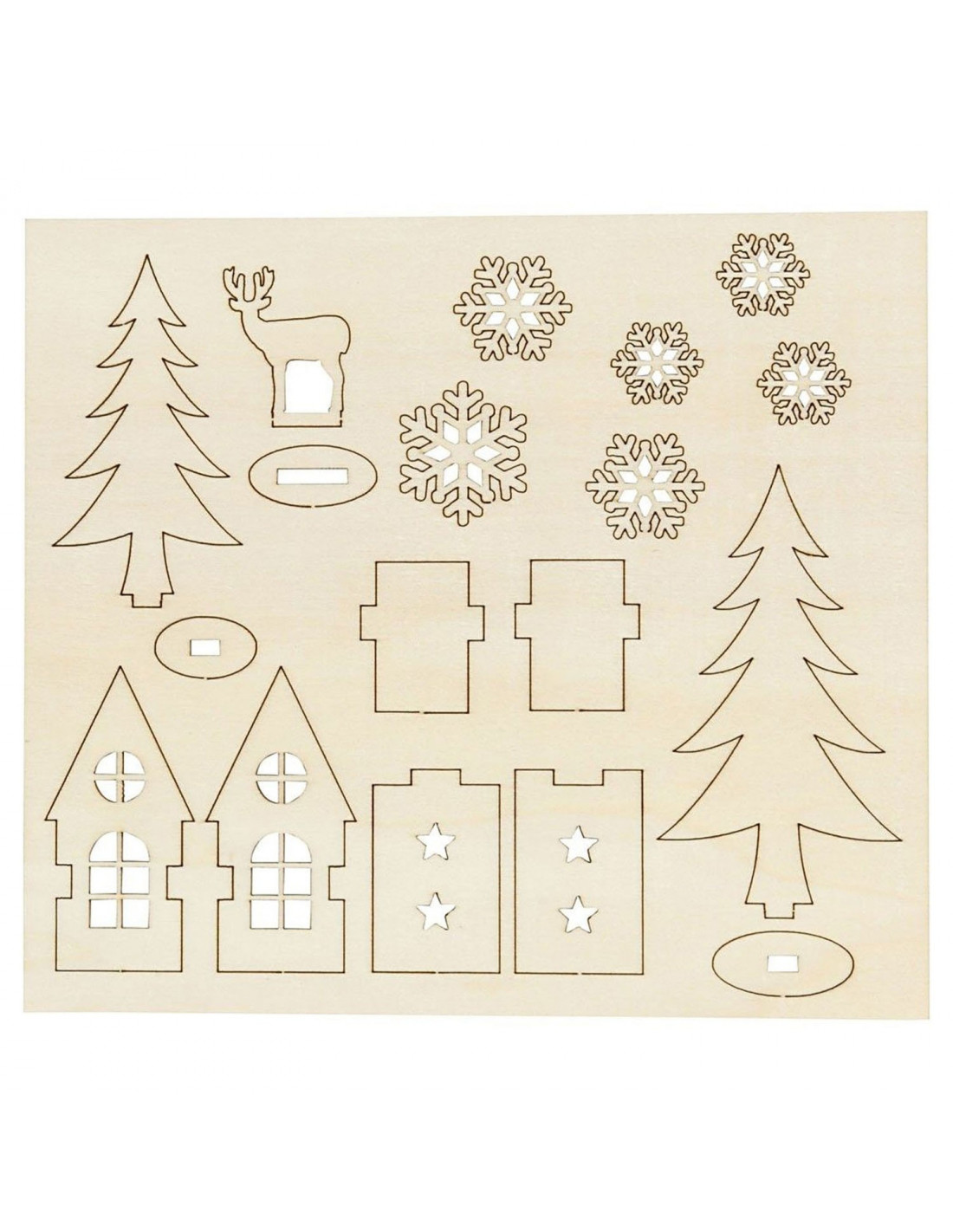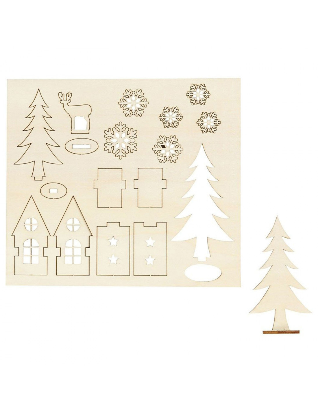 Gesneden figuren gemaakt van licht hout met fijne details en donkere randen, voorzien van een voet zodat ze zelfstandig kunnen staan. Geleverd met plaat en instructies.
