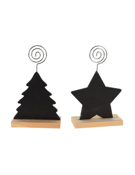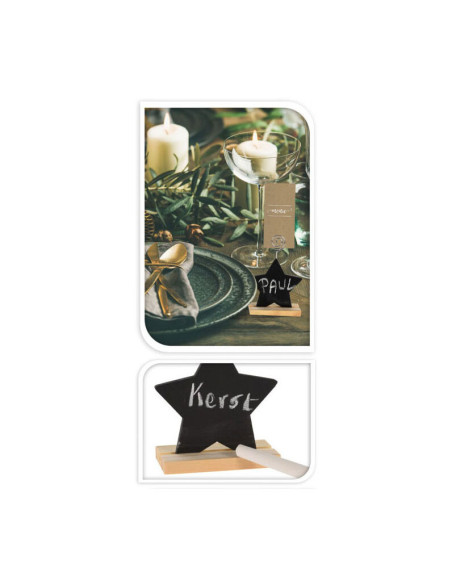 Naamkaarthouder in de vorm van een kerstboom of kerstster. De vorm is beschrijfbaar met krijt en daarbovenop is nog een los kaartje te plaatsen. Afmetingen: ca. 13 centimeter groot.