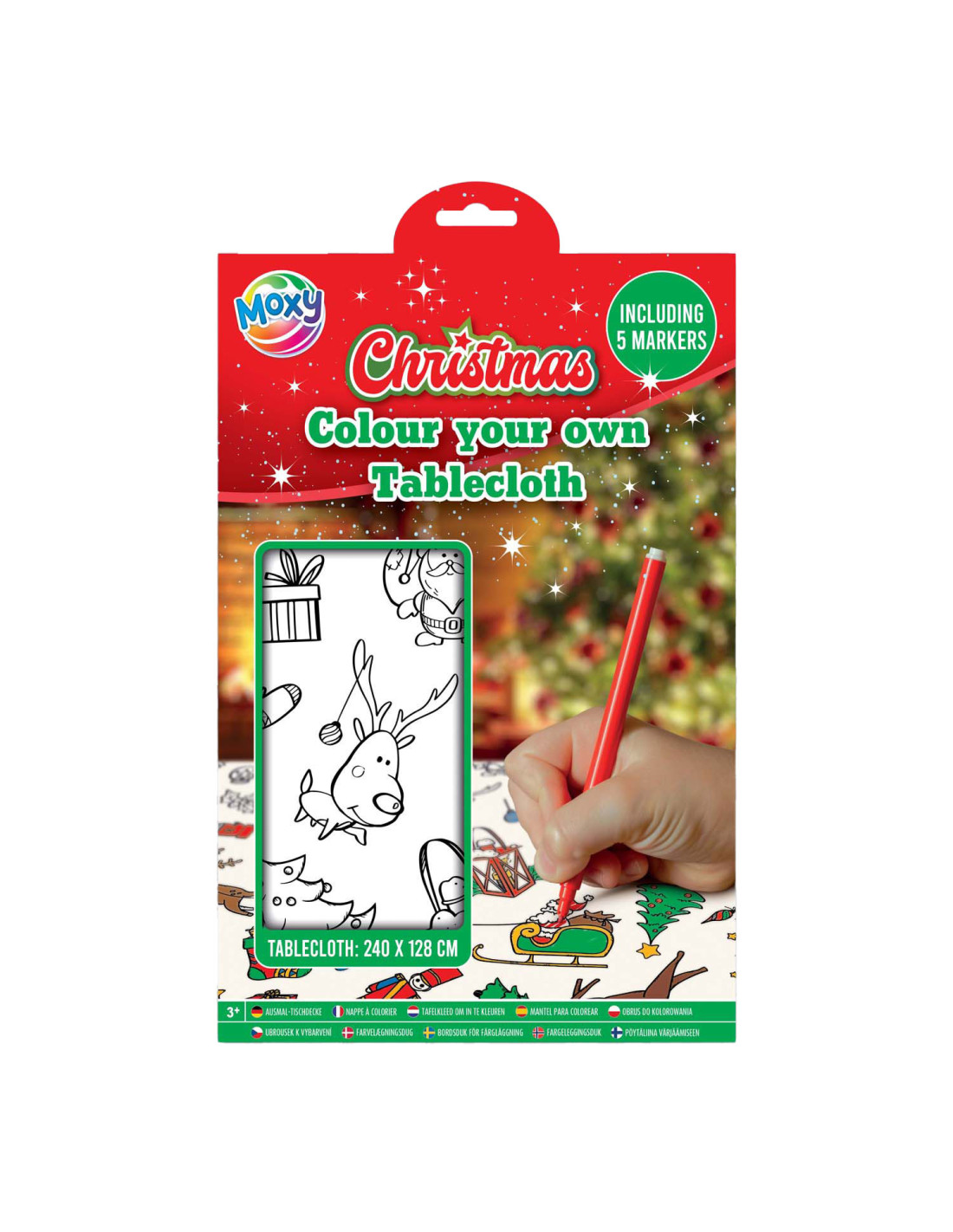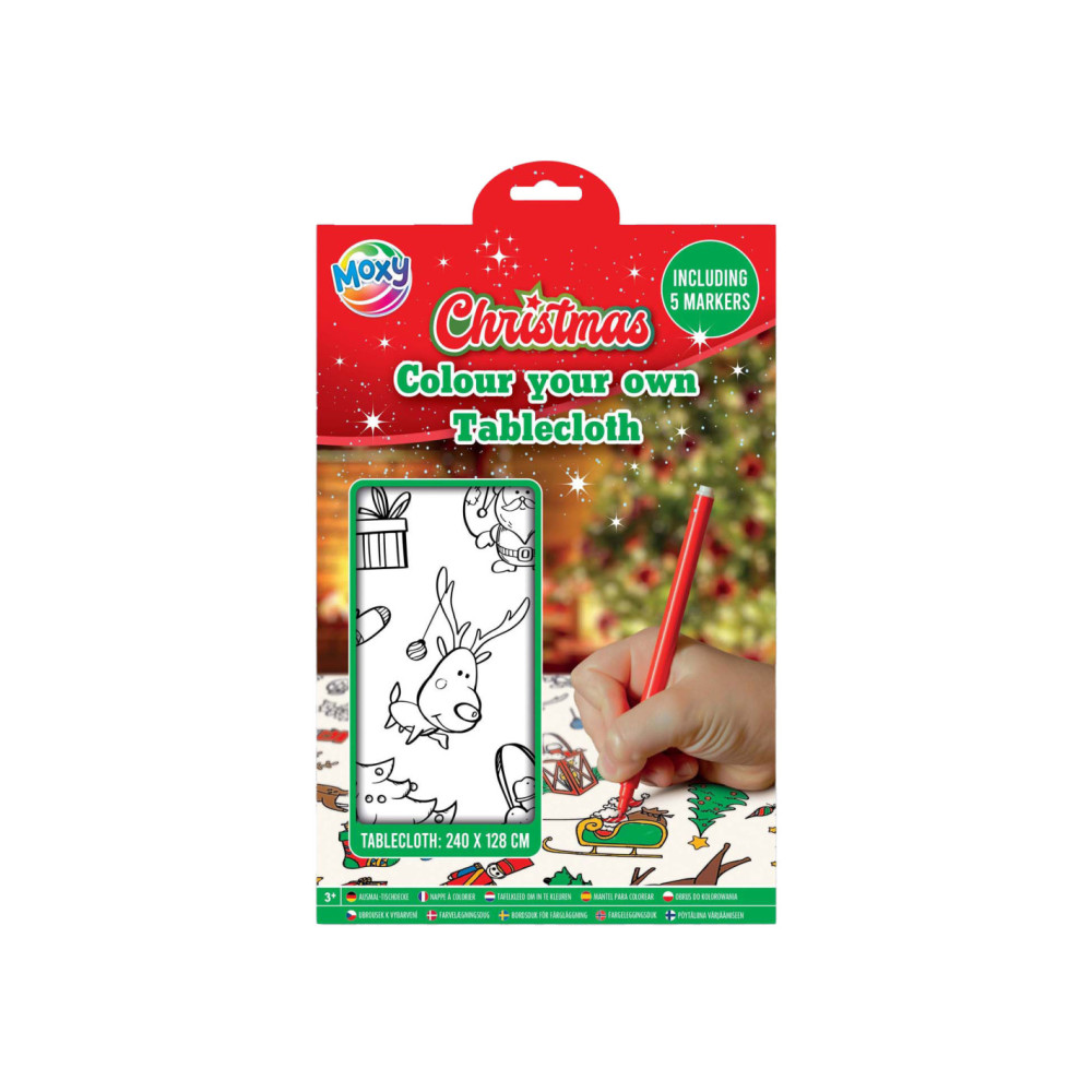 Kleur je eigen tafelkleed met kerstafbeeldingen! Geschikt voor kinderen vanaf 3 jaar. Het tafelkleed is 240 x 128 cm groot en wordt geleverd met 5 stiften.