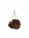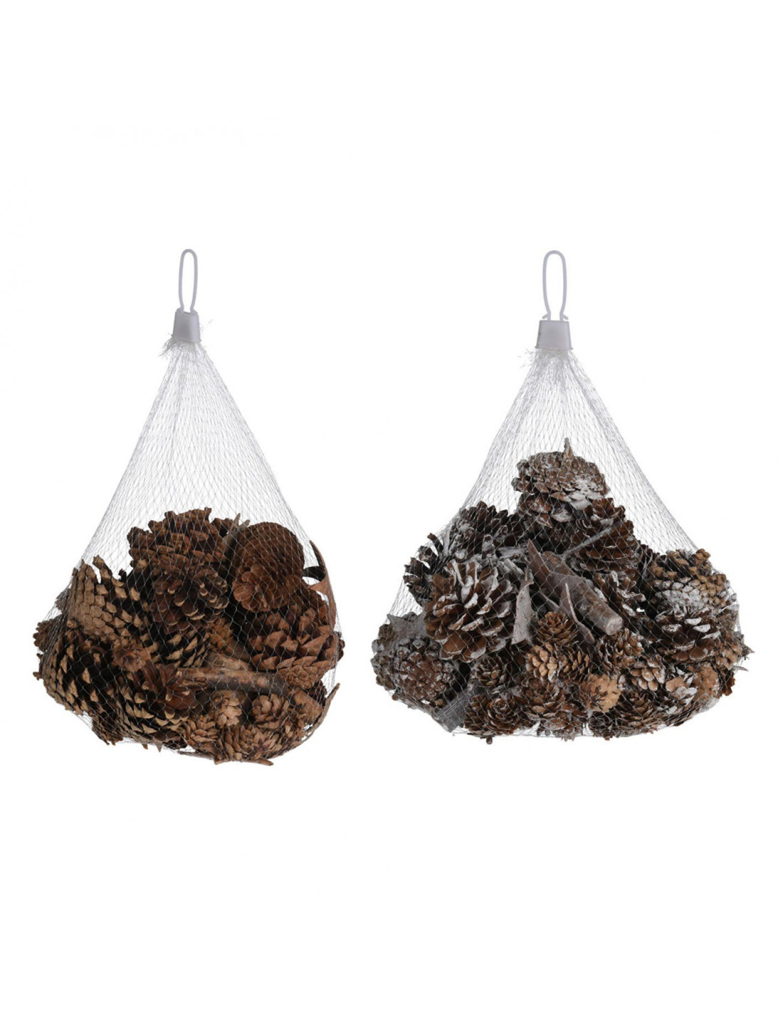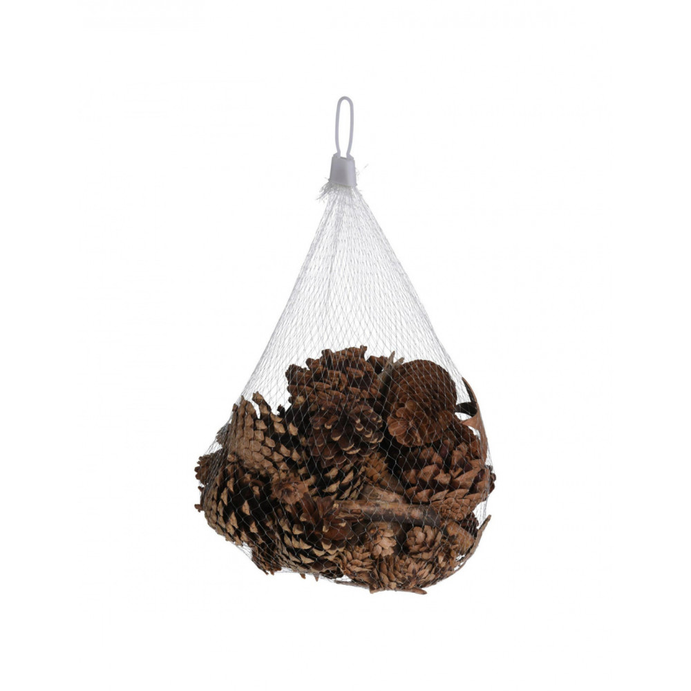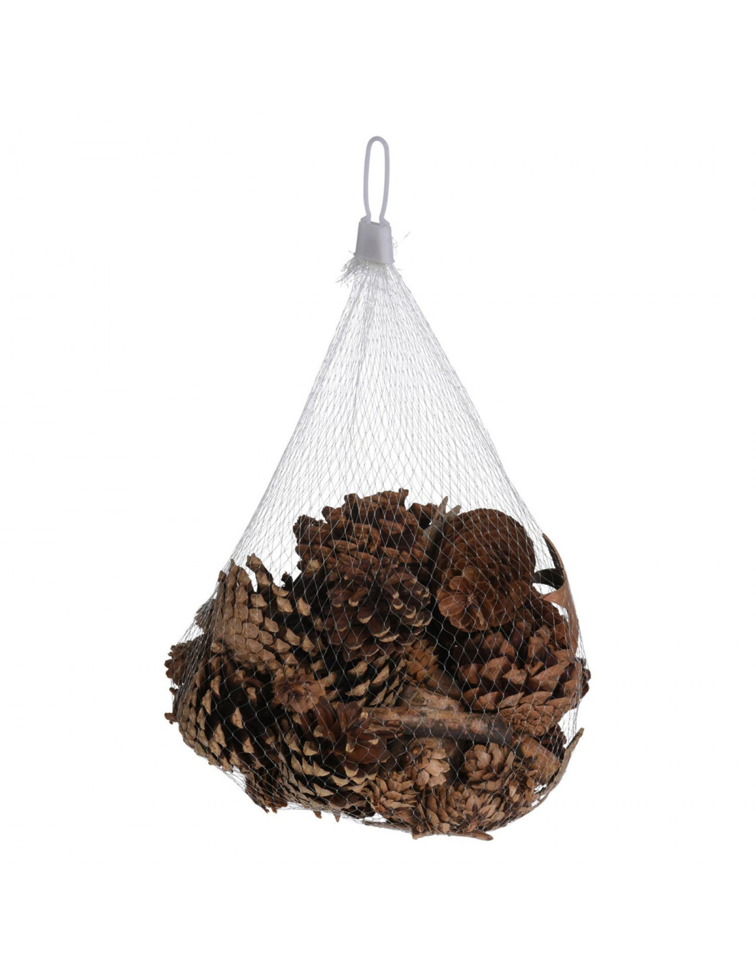Zak met dennenappels ter decoratie of te gebruiken voor knutselmaterialen. In de zak zitten dennenappels van verschillende formaten, stukken tak en stukken boomschors in de vorm van sterren.