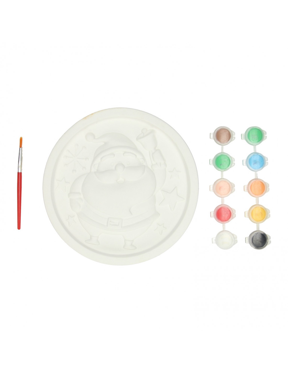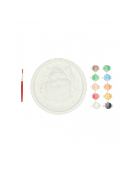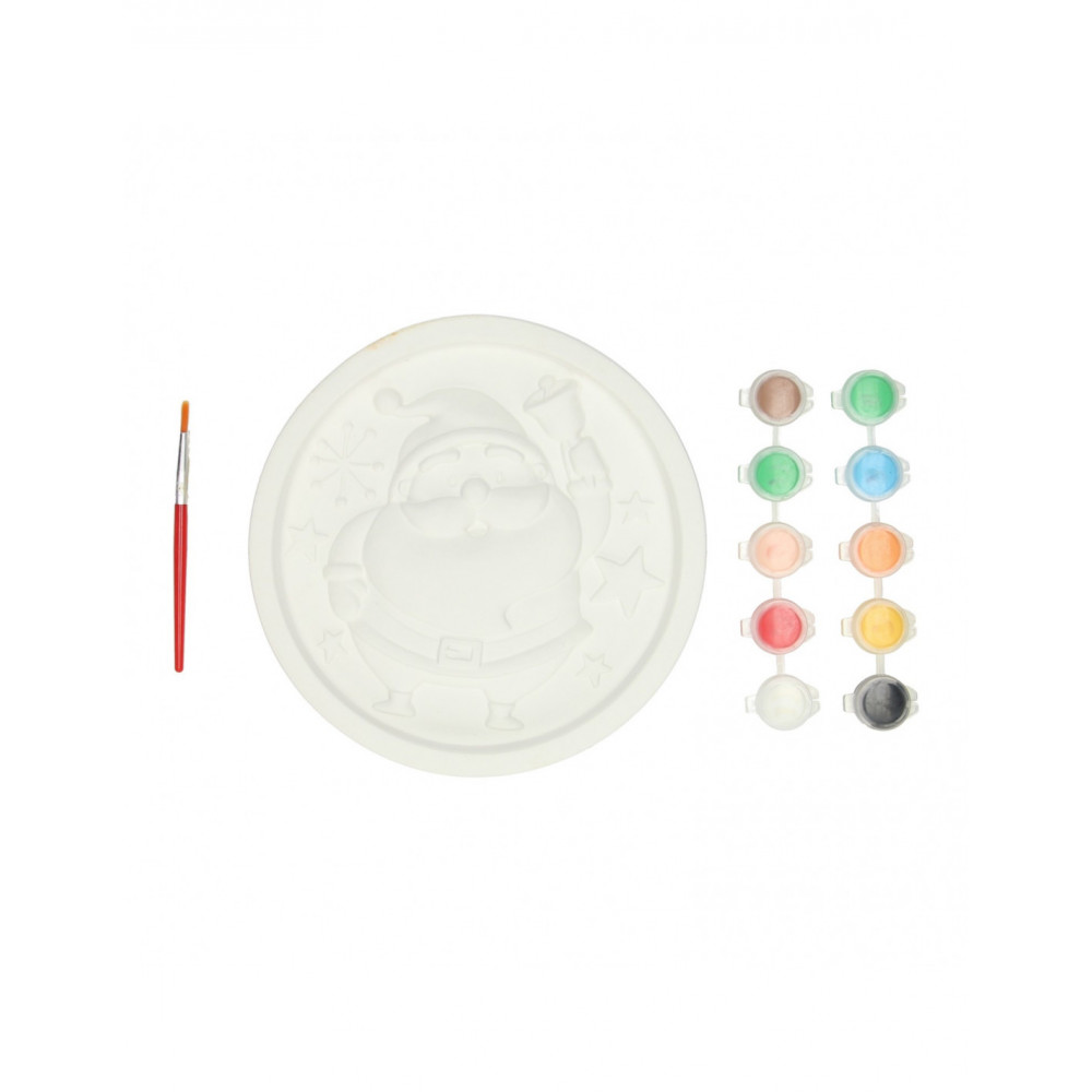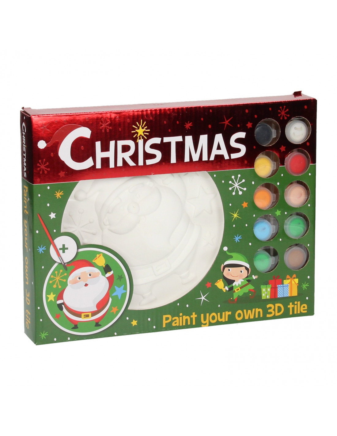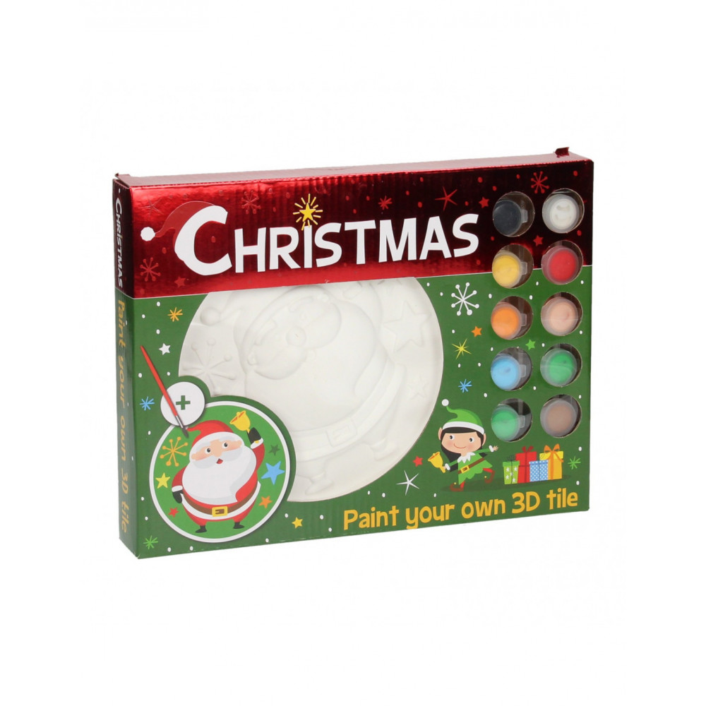 Knutselsetje voor het beschilderen van een 3D-kersttegel van gips. Inclusief 10 verpotjes en verfkwastje. Doorsnede: 17,5 centimeter. Niet geschikt voor kinderen onder de 3 jaar oud.