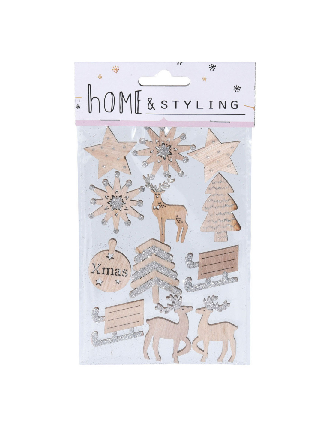 Houten kerststickers met glitter, 12 stuks. Met figuren zoals sterren, kerstbomen en rendieren. Niet geschikt voor kinderen jonger dan 3 jaar.