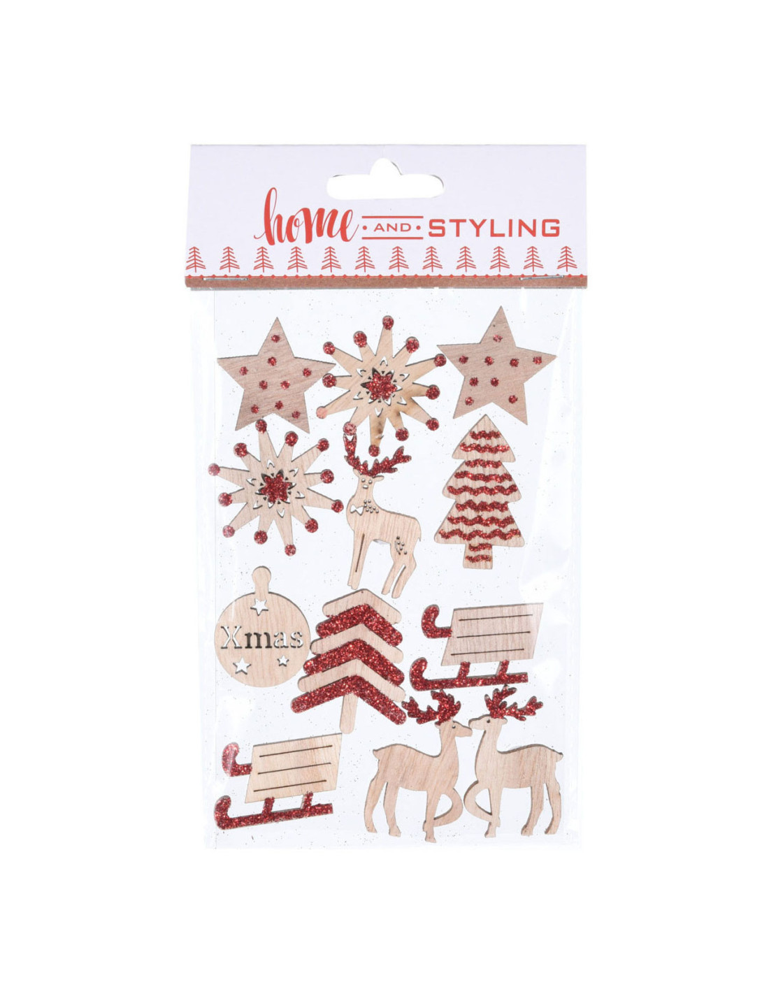 Houten kerststickers met glitter, 12 stuks. Met figuren zoals sterren, kerstbomen en rendieren. Niet geschikt voor kinderen jonger dan 3 jaar.
