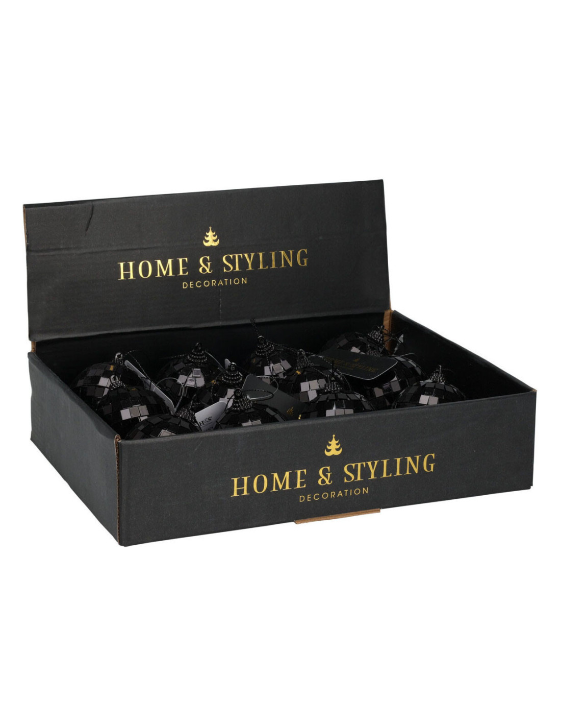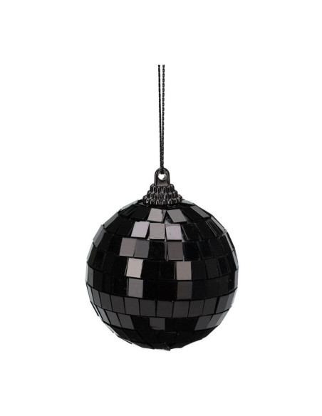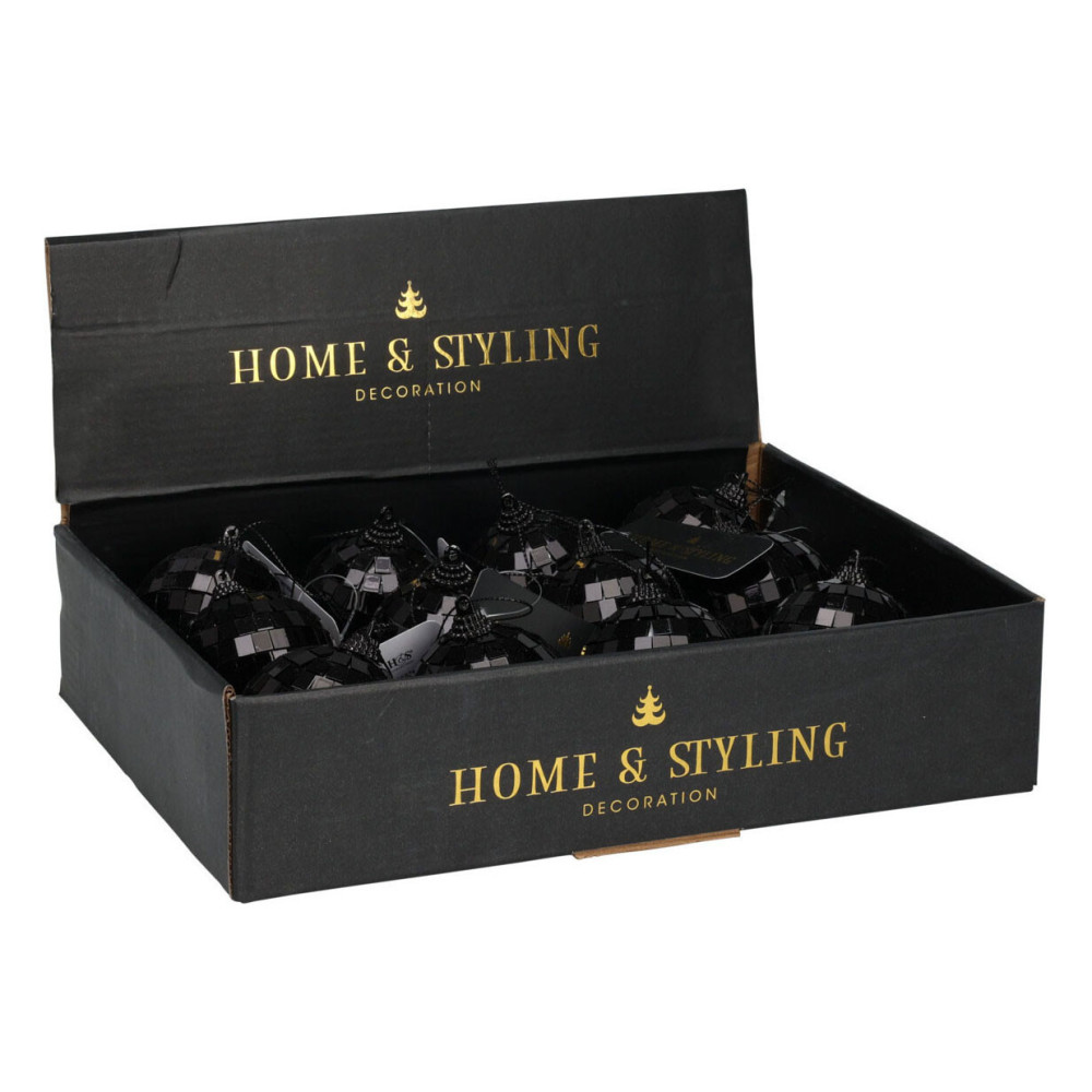 Set met 12 kerstballen in de vorm van zwarte discobollen.