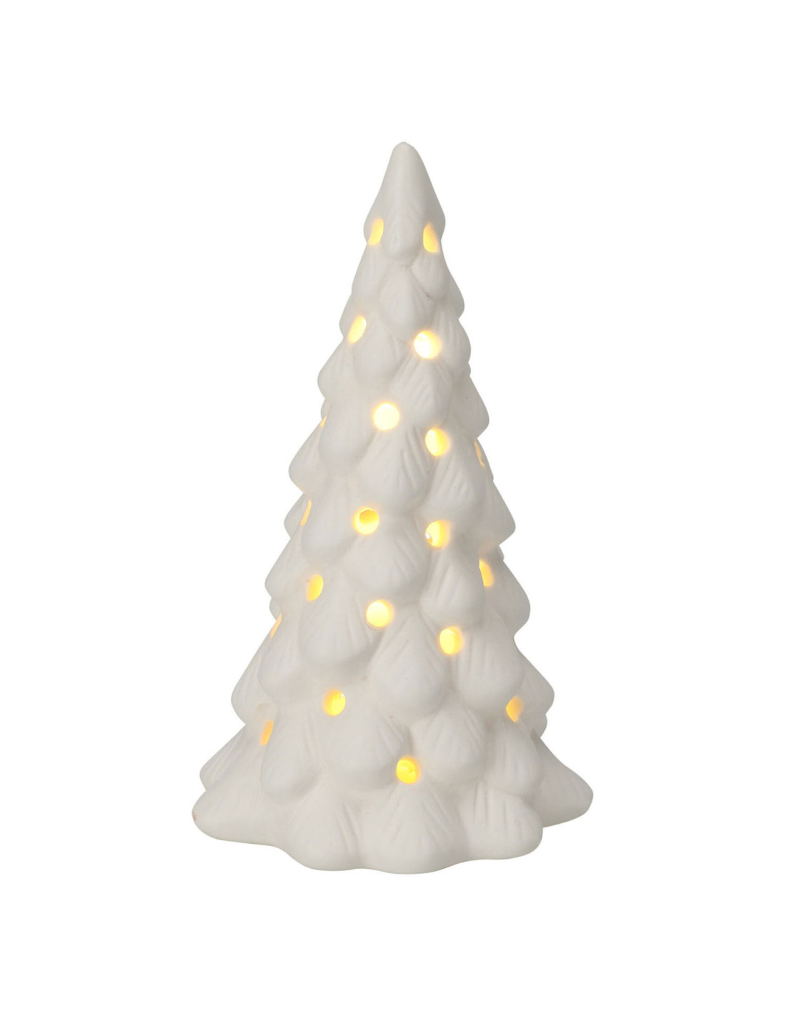 Porseleinen kerstboom van 11 centimeter groot met warm ledlicht. In de set zitten 6 kerstbomen. Een mooie accessoire voor op de kast, op tafel of op je bureau!