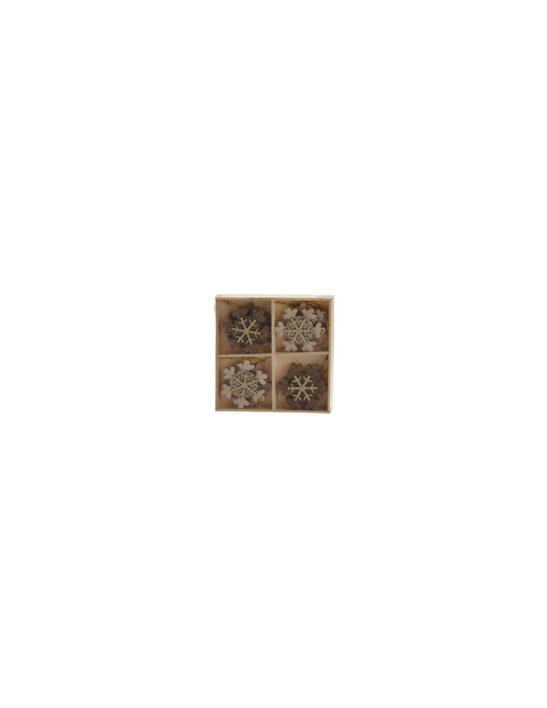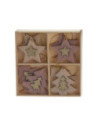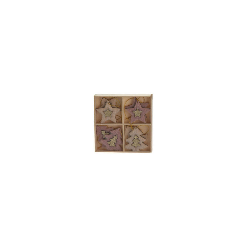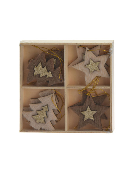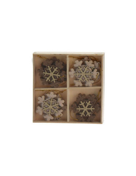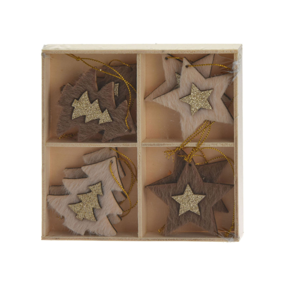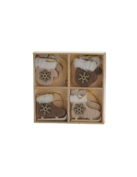 Set van 8 houten hangdecoraties voor kerst in houten opbergdoosje (13x13cm). De kersthangers hebben typische kerstfiguren met een glitterende, gouden applicatie in het midden. Inclusief ophangkoordjes. Verkrijgbaar als sneeuwvokken, kerstbomen/sterren en schaatsen/wanten.