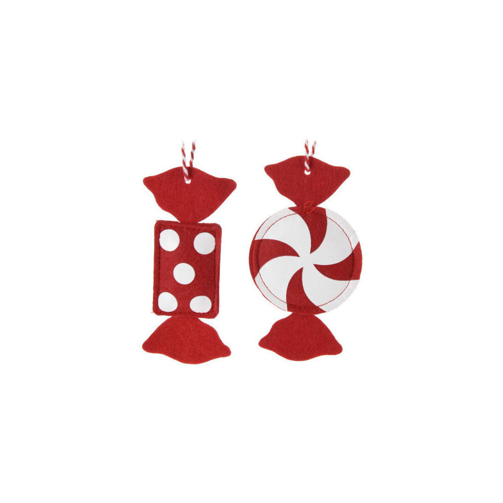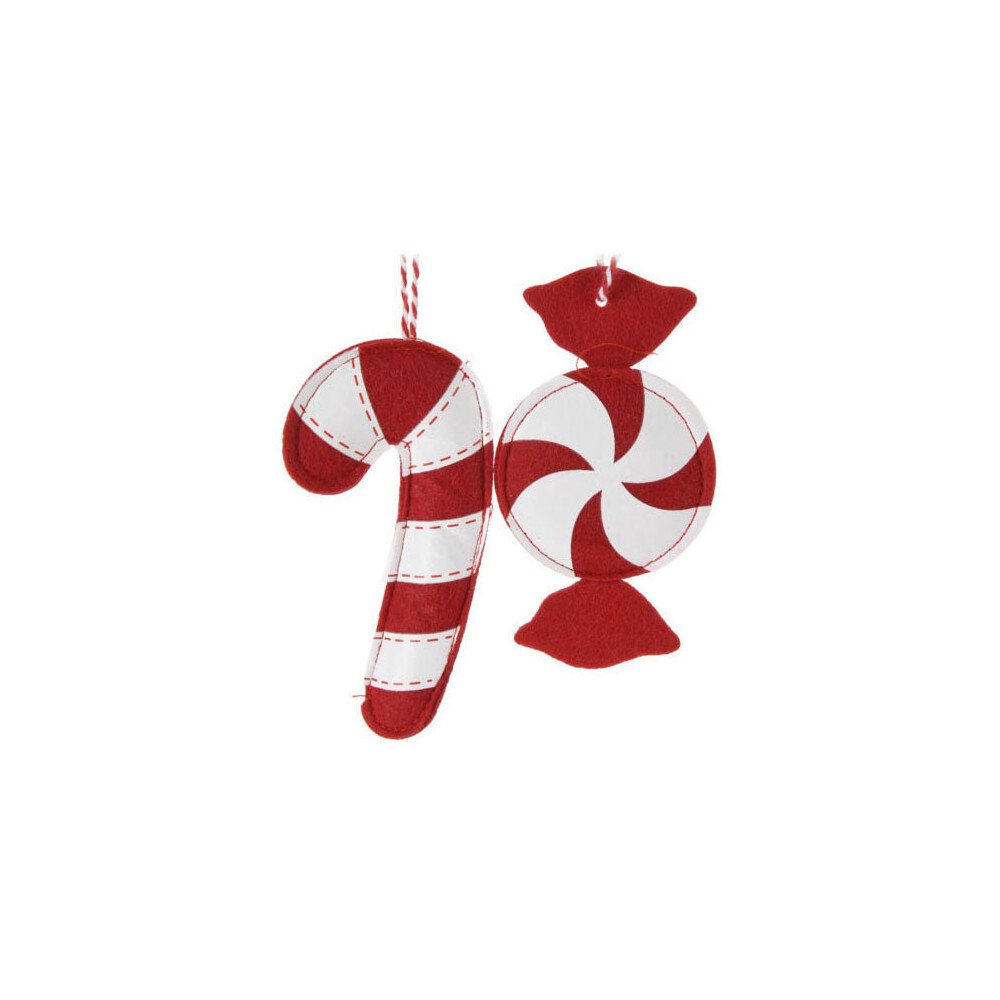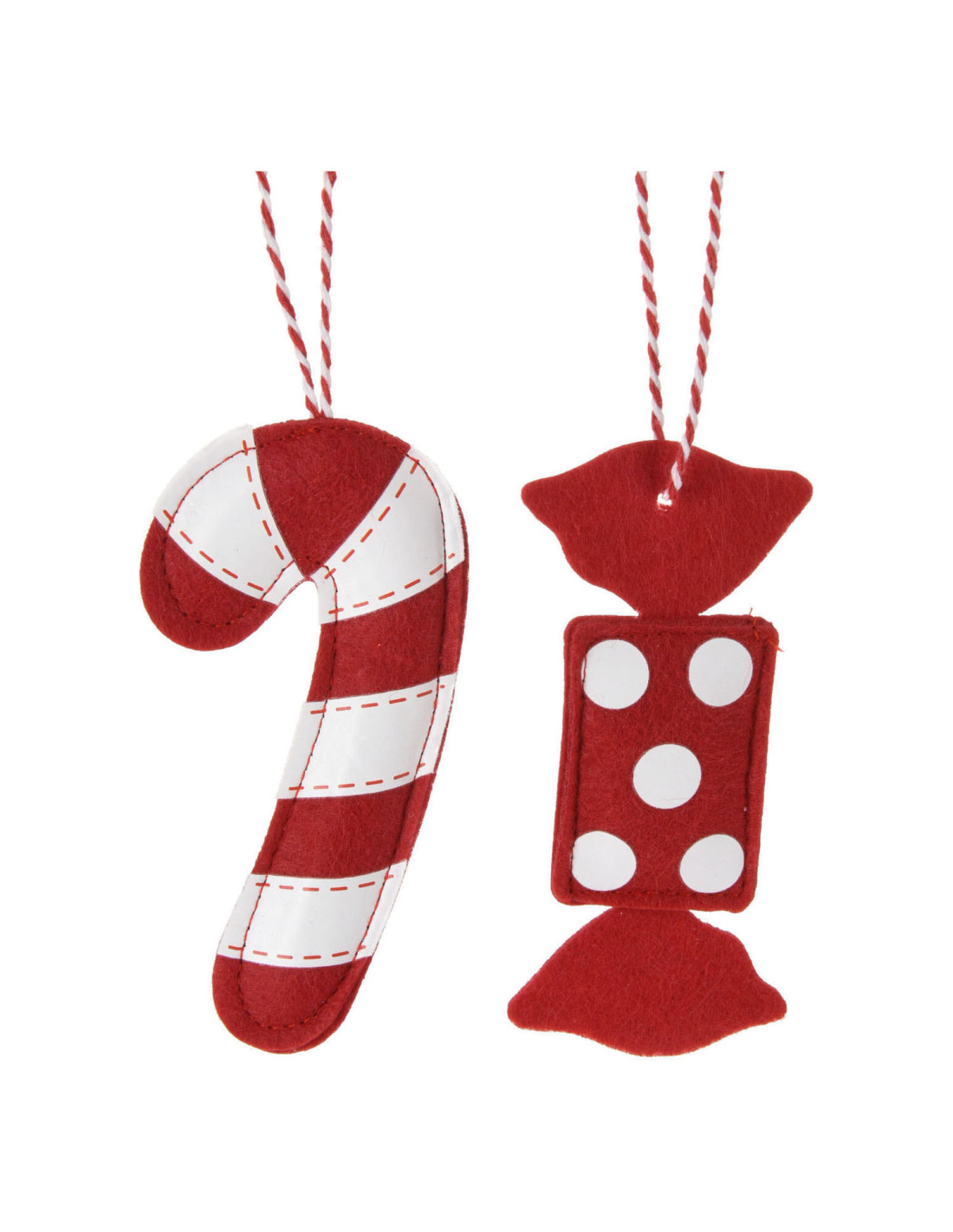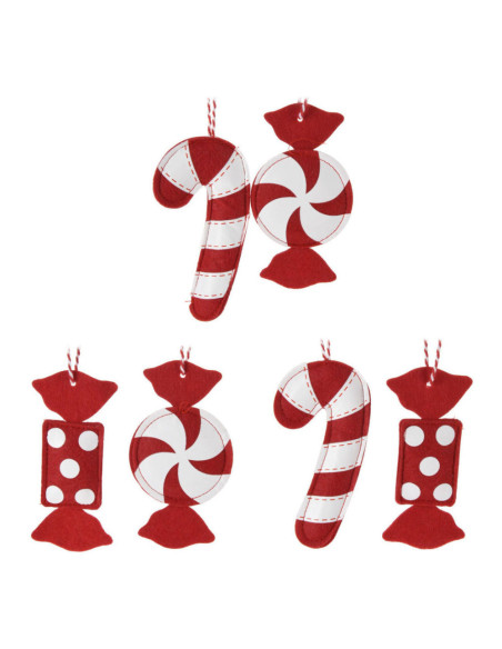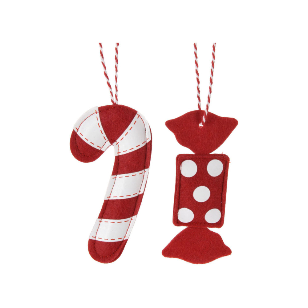 Set van 12 vilten hangdecoraties in de vorm van rood/witte kerstsnoepjes. Inclusief bijpassend rood/wit ophangkoord.