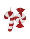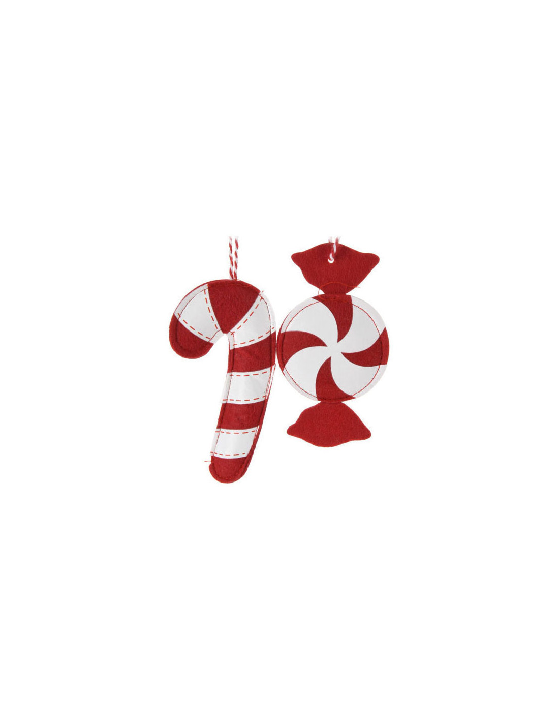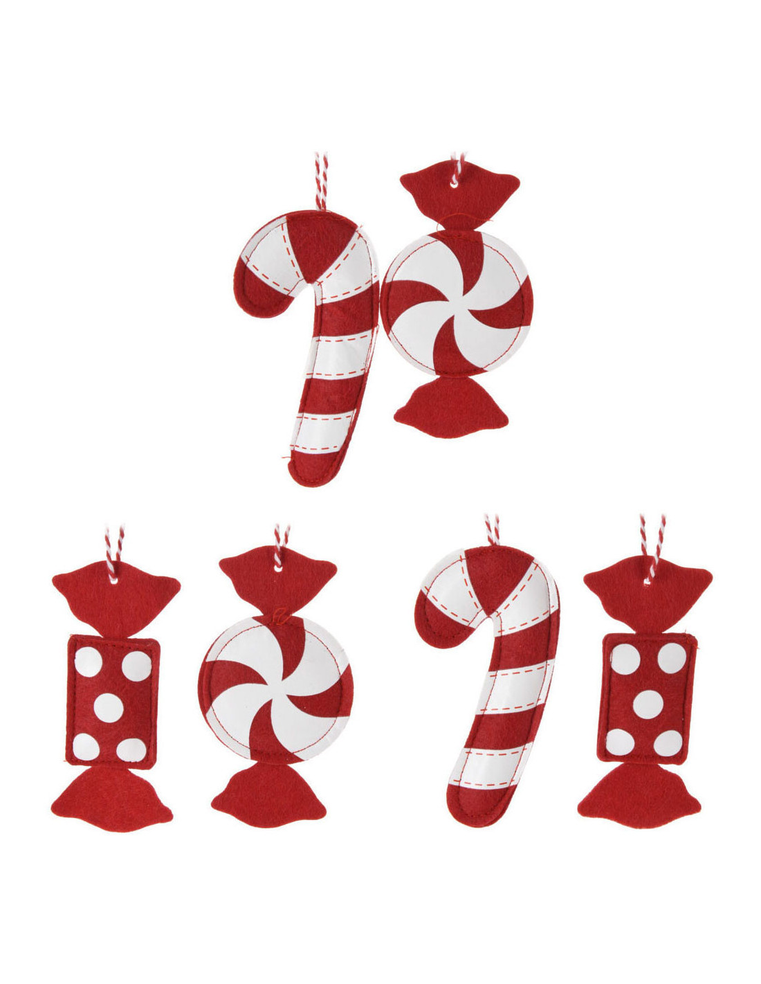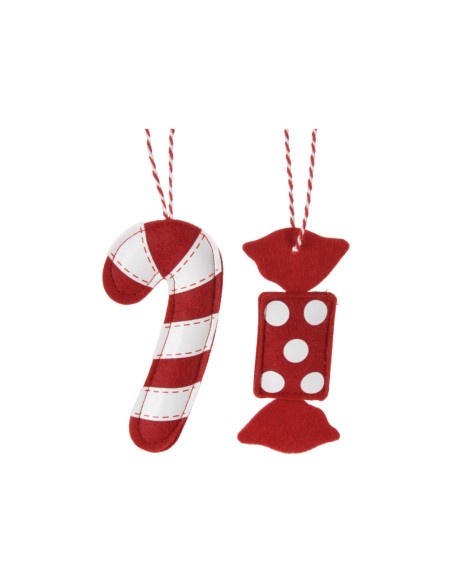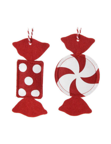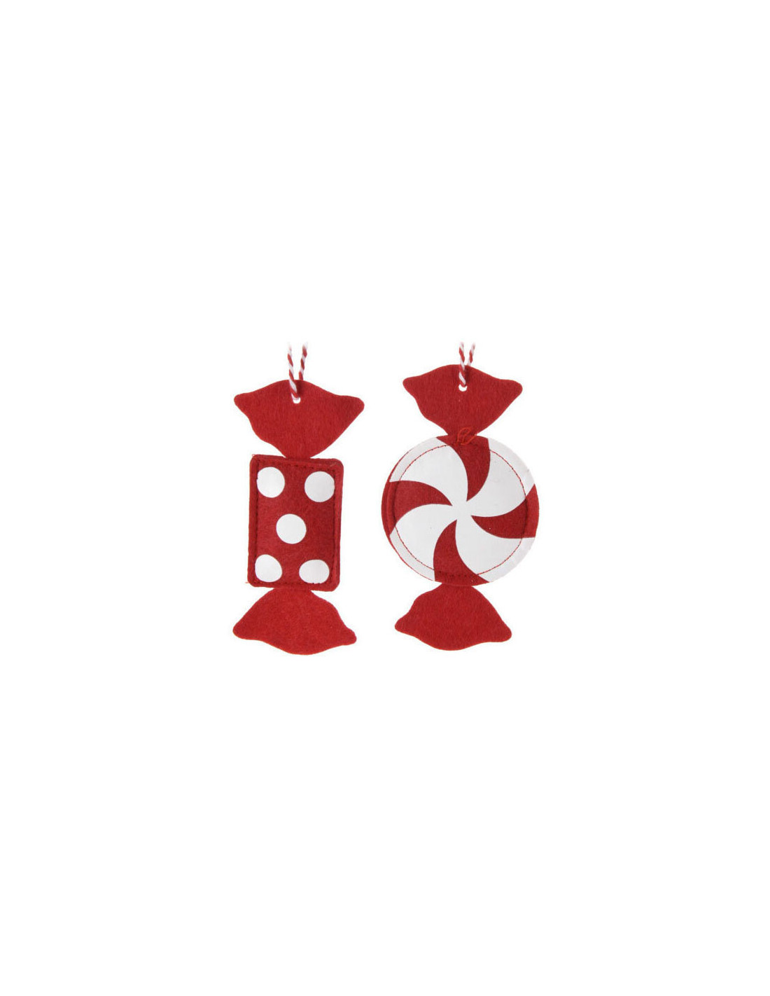 Set van 12 vilten hangdecoraties in de vorm van rood/witte kerstsnoepjes. Inclusief bijpassend rood/wit ophangkoord.