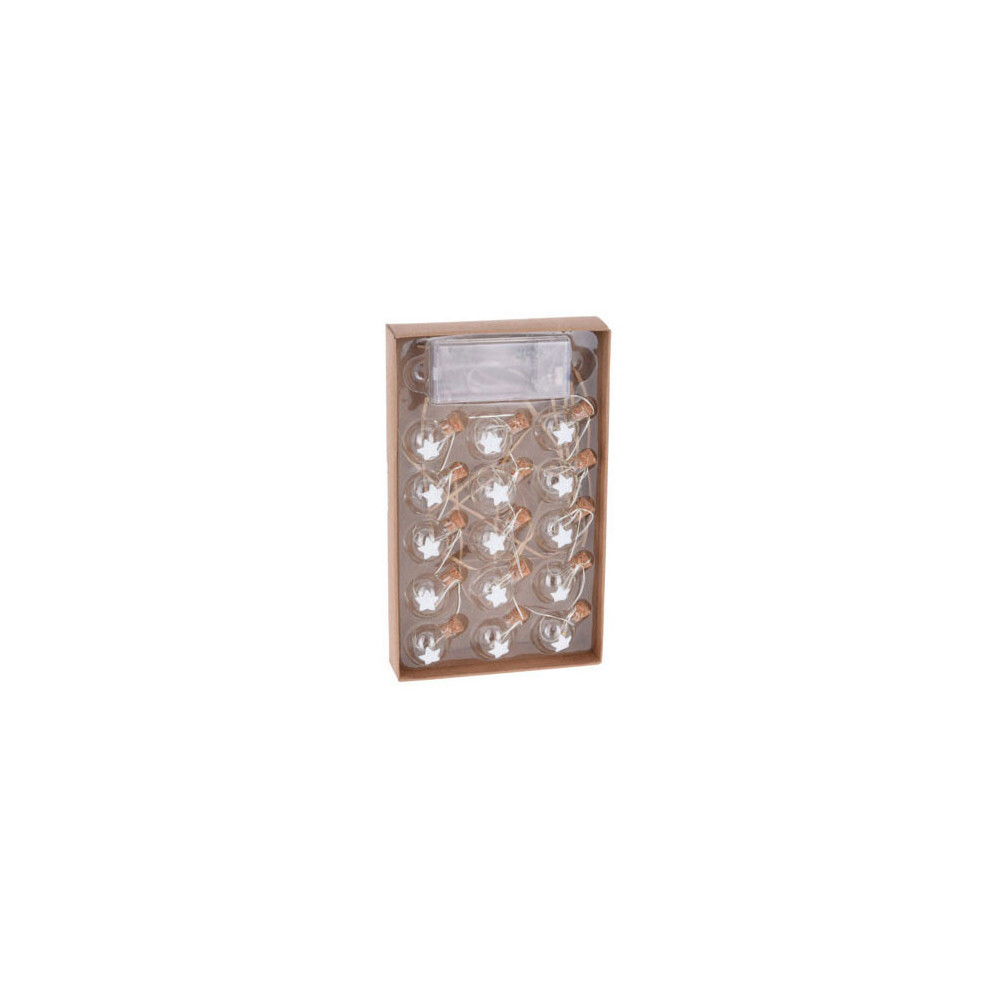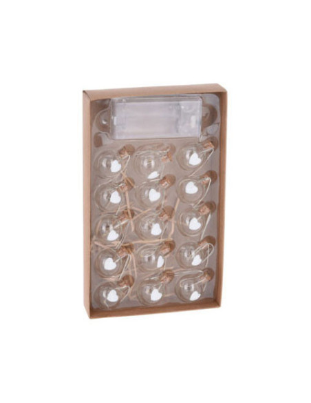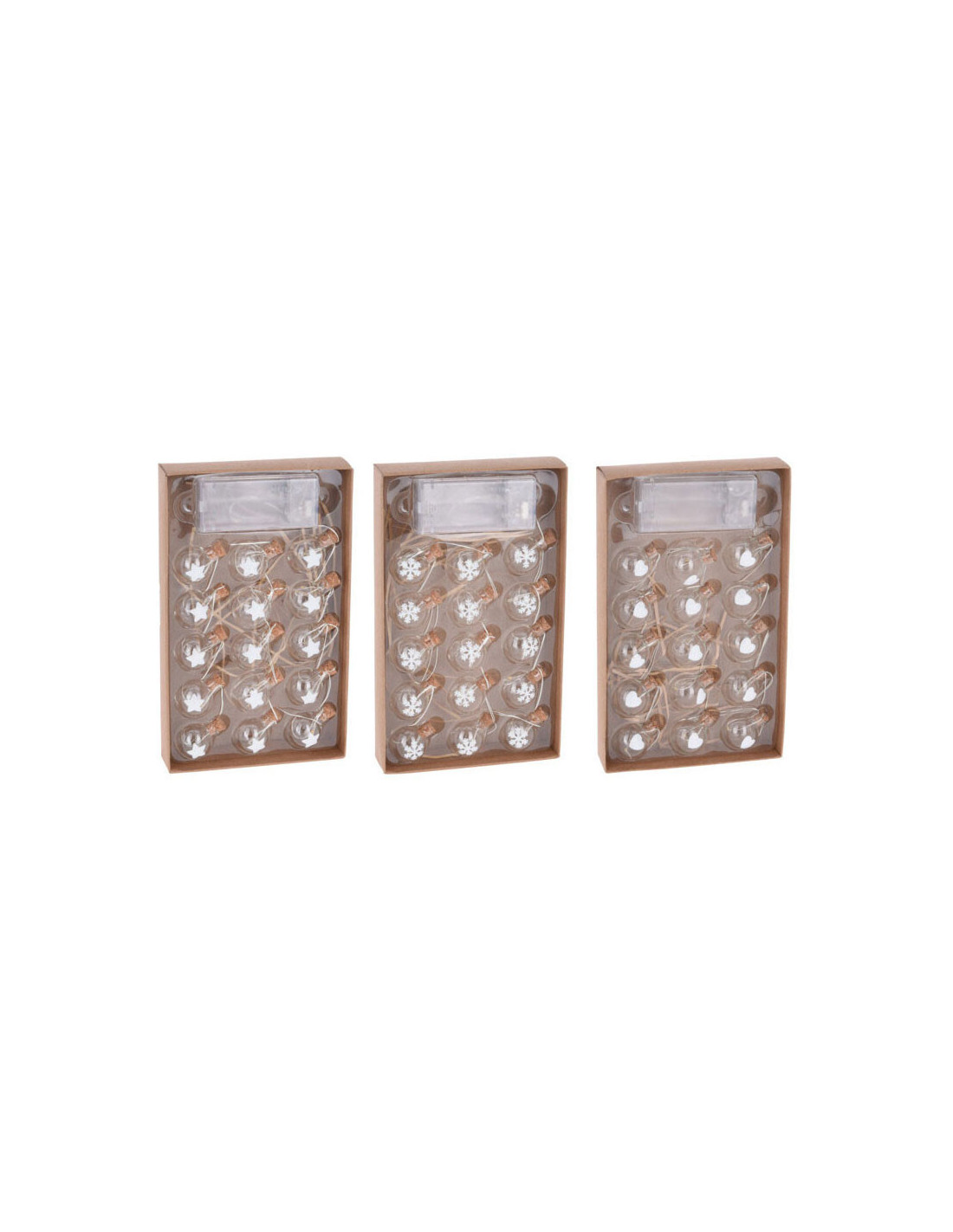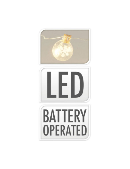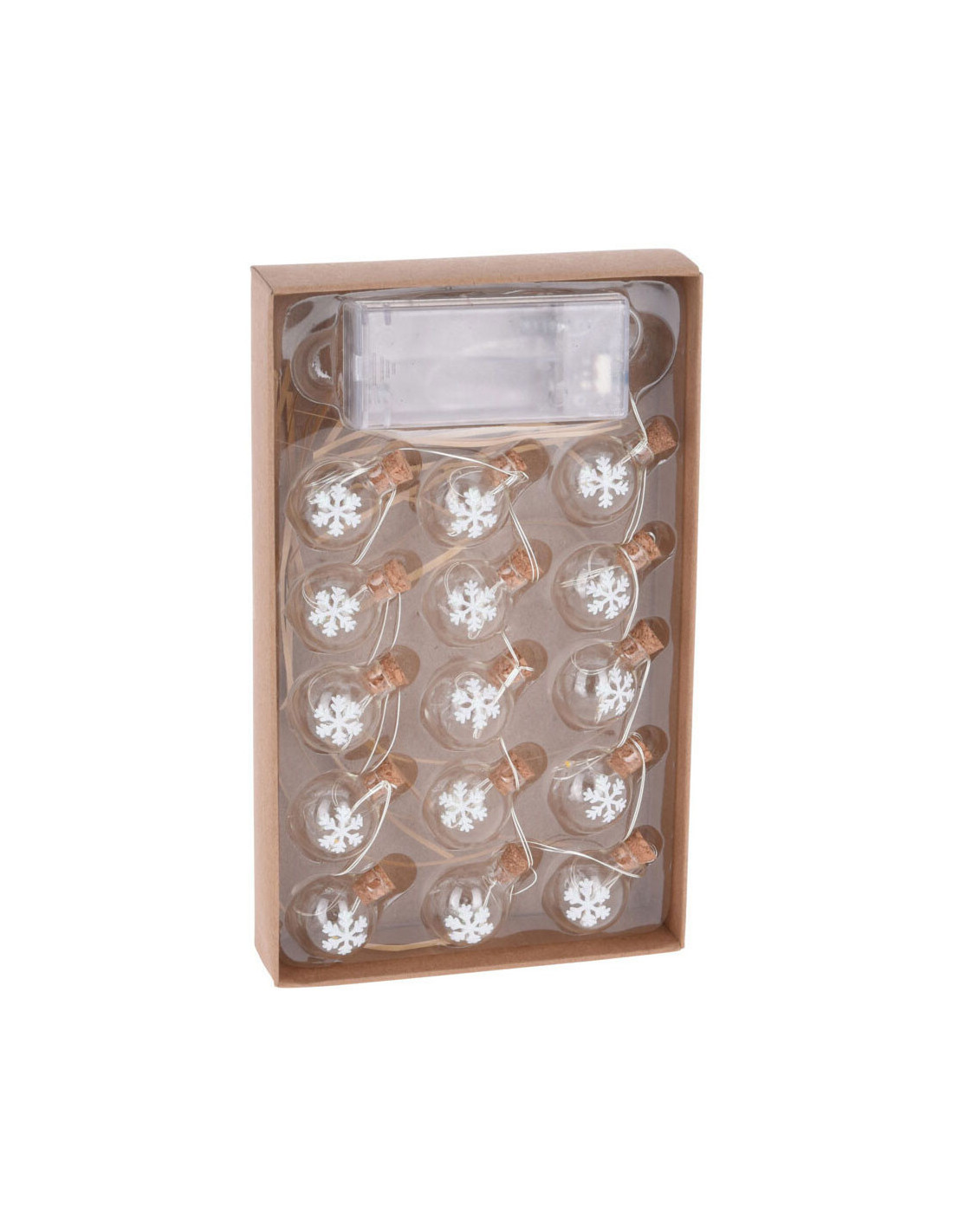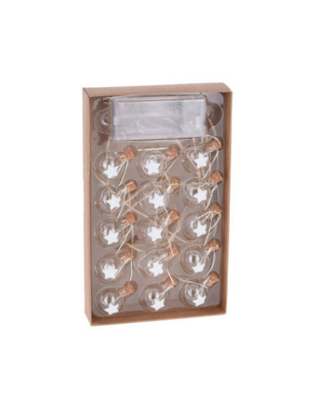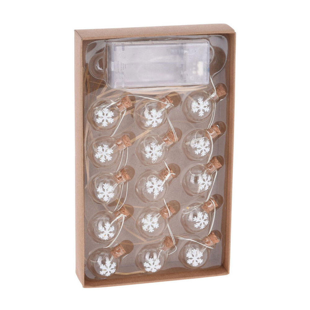 Draadslinger met 15 transparante kerstballetjes met kurk, met daarin ledlicht en kerstvormen. Een gezellige decoratie voor bijvoorbeeld in de kerstboom of bij het raam! Werkt op batterijen (2xAA, niet inbegrepen).