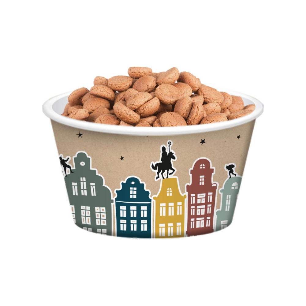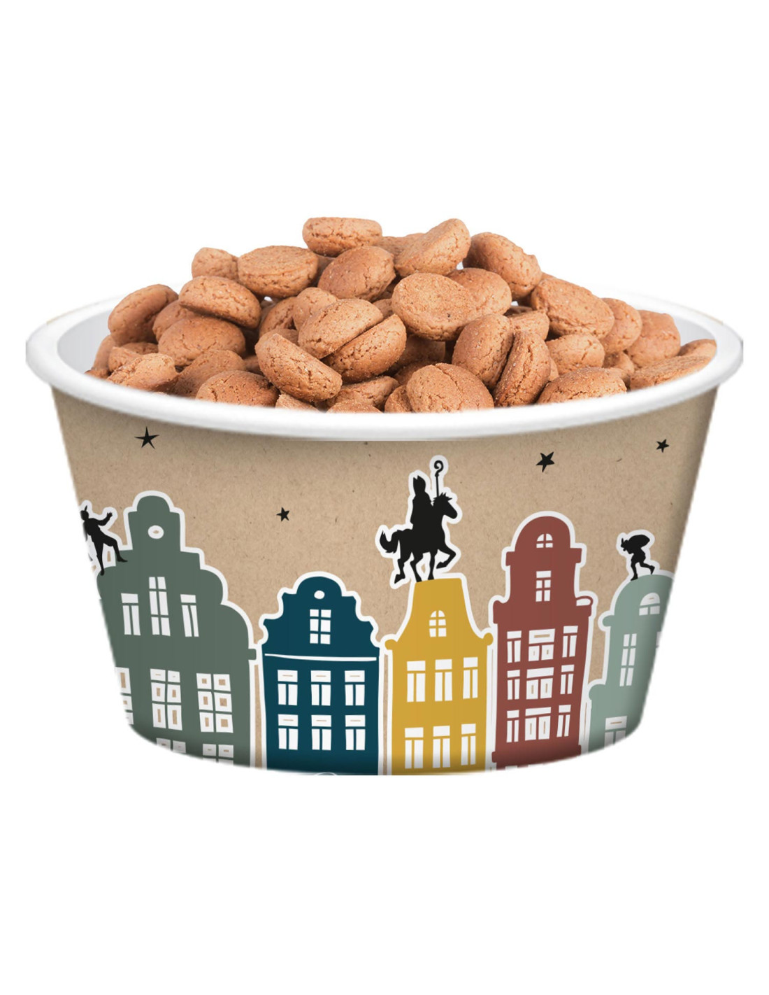 Met deze leuke papieren pepernootbakjes heeft iedereen zijn of haar eigen voorraadje pepernoten. Op de bruine bakjes staat een leuke print van oudhollandse huisjes met sint en zijn pieten erop.