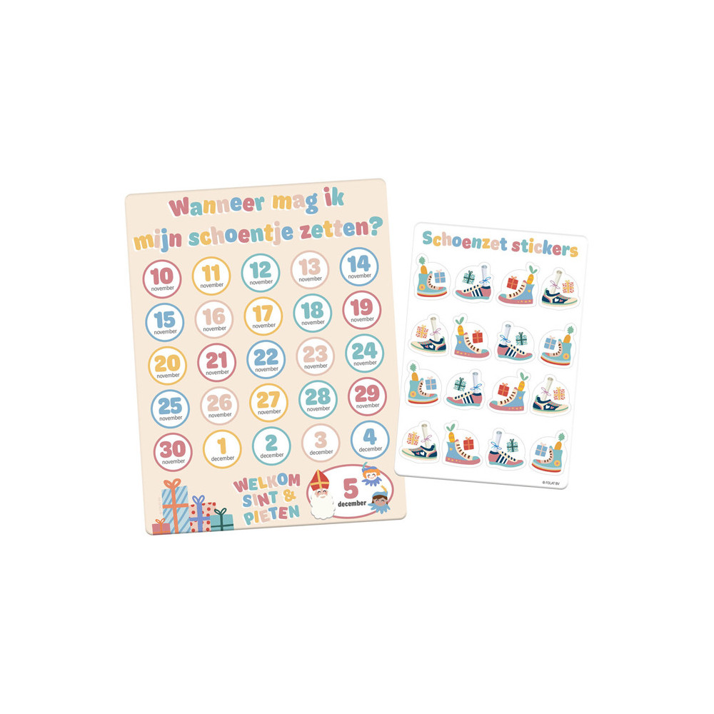Zet je schoentje vast klaar! Kalender 'Wanneer mag ik mijn schoentje zetten?'. Inhoud: 1 kalender en 1 stickervel.