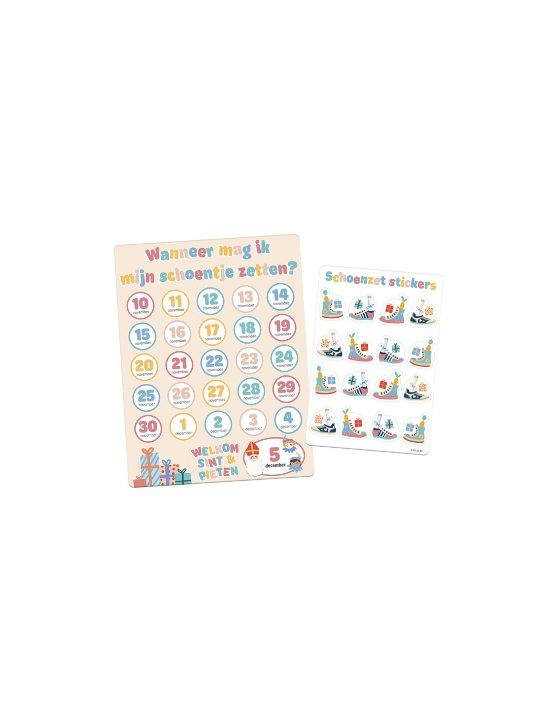 Een Sinterklaaskalender waarmee ouders met een "schoenzet sticker" kunnen laten zien op welke dagen er schoentjes gezet mogen worden en de kinderen kunnen zien hoeveel nachtjes slapen dat nog is. Tegelijkertijd zien ze ook over hoeveel nachtjes slapen het Pakjesavond is. Deze aftelkalender is 18 x 23,5 cm. Dit artikel is gemaakt van papier.