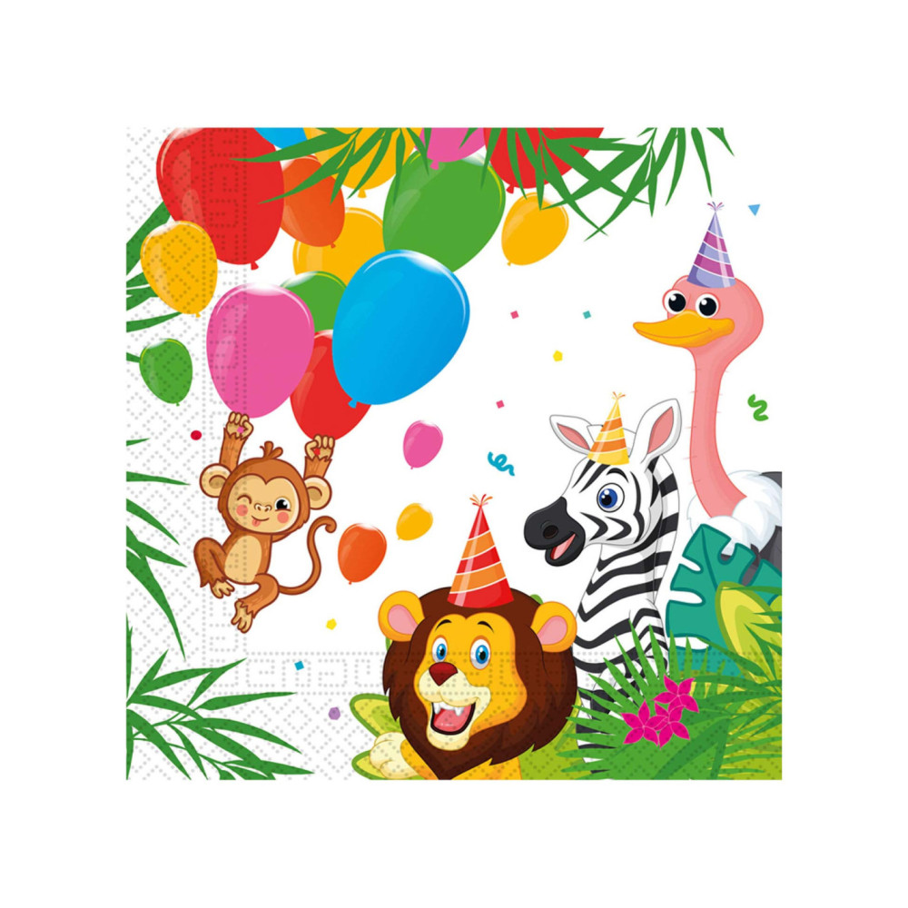 Set van 20 servetten in jungledierenthema, 33x33 cm groot. Gemaakt van FSC-papier.