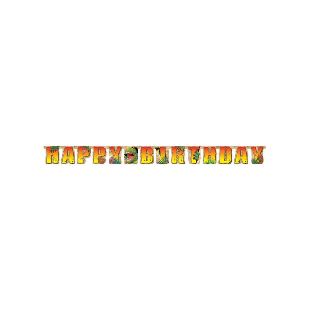 Kartonnen letterbanner in het thema 'dino blast'. De slinger heeft de tekst 'Happy Birthday' en heeft een lengte van 220 centimeter. Leuk om te combineren met andere feestartikelen uit de 'dino blast'-lijn!