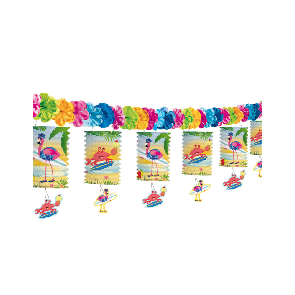 Maak je zomerse feestje compleet met deze flamingo lampionslinger. De slinger is 3,6 m lang en voorzien van kleurrijke bloemen. Aan de slinger hangen lampionnen. Op de lampionnen staan een zomers geklede flamingo en een surfende krab afgebeeld. Aan de lampionnen hangen ook dezelfde flamingo en krab als figuurtjes.