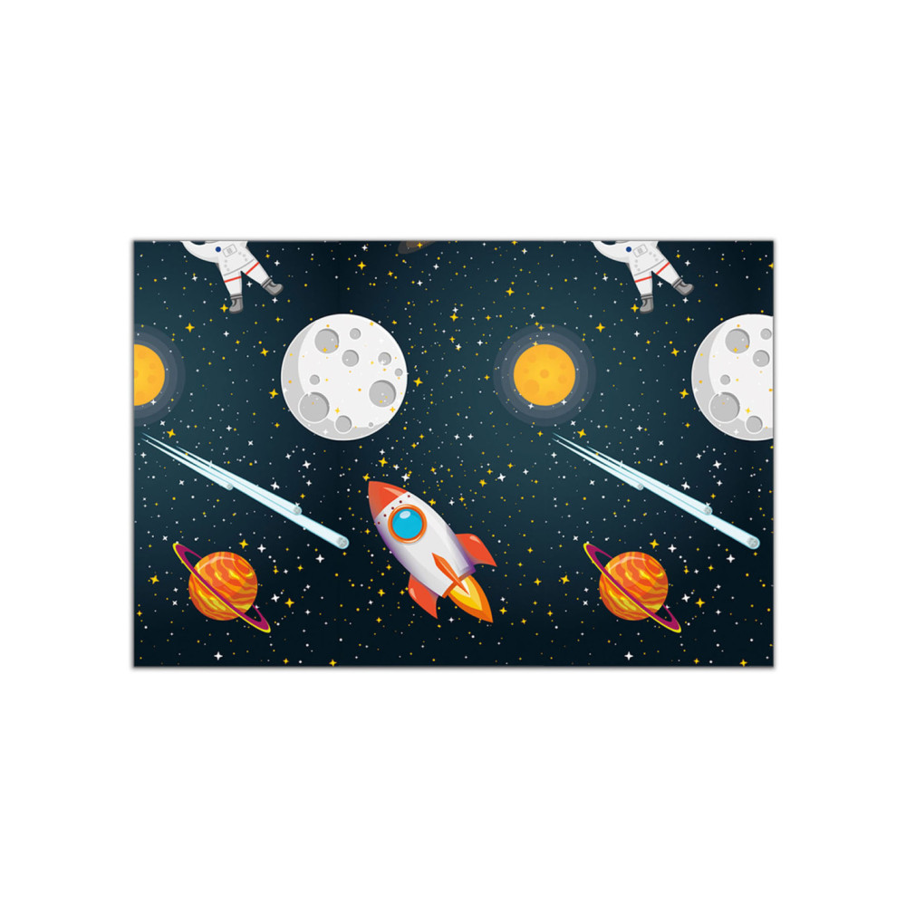 Plastic tafelzeil van 120x180 centimeter groot in raket-/ruimtethema. Geweldige accessoire voor een feestje van een kind dat gek is op de ruimte en planeten! Ook bijpassende feestartikelen verkrijgbaar, zoals borden, bekers en slingers.