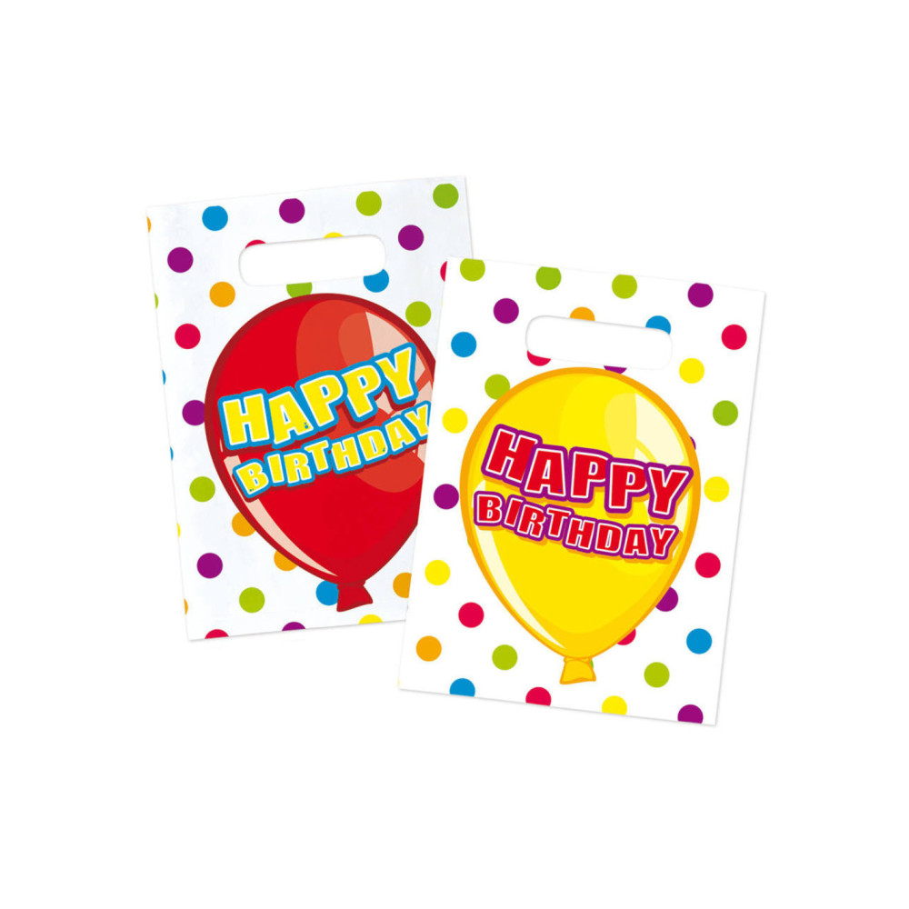Geef na afloop van je feestje een happy birthday uitdeelzakje mee naar huis met daarin wat snoepjes en een uitdeelcadeautje. Op de uitdeelzakjes staat een feestelijke print. Verpakt per 6 stuks.