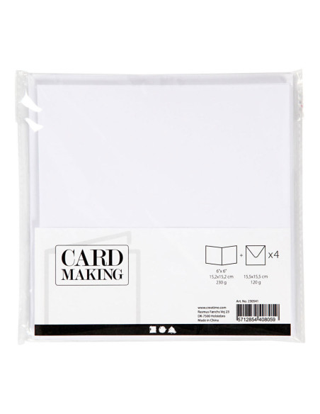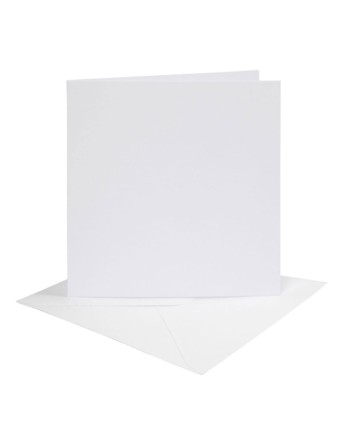 Dubbelzijdige kaarten gemaakt van stevig karton. Voorzien van een bijpassende papieren envelop met opnieuw bevochtigbare gom op de flap (bevochtig om de envelop te verzegelen).Gewone kaarten die kunnen worden gebruikt voor alle soorten kaartdecoratie en technieken voor het maken van kaarten. Versier met stickers, papier of kaartponsjes, tape, 3D-motieven en nog veel meer.