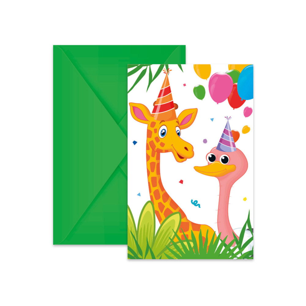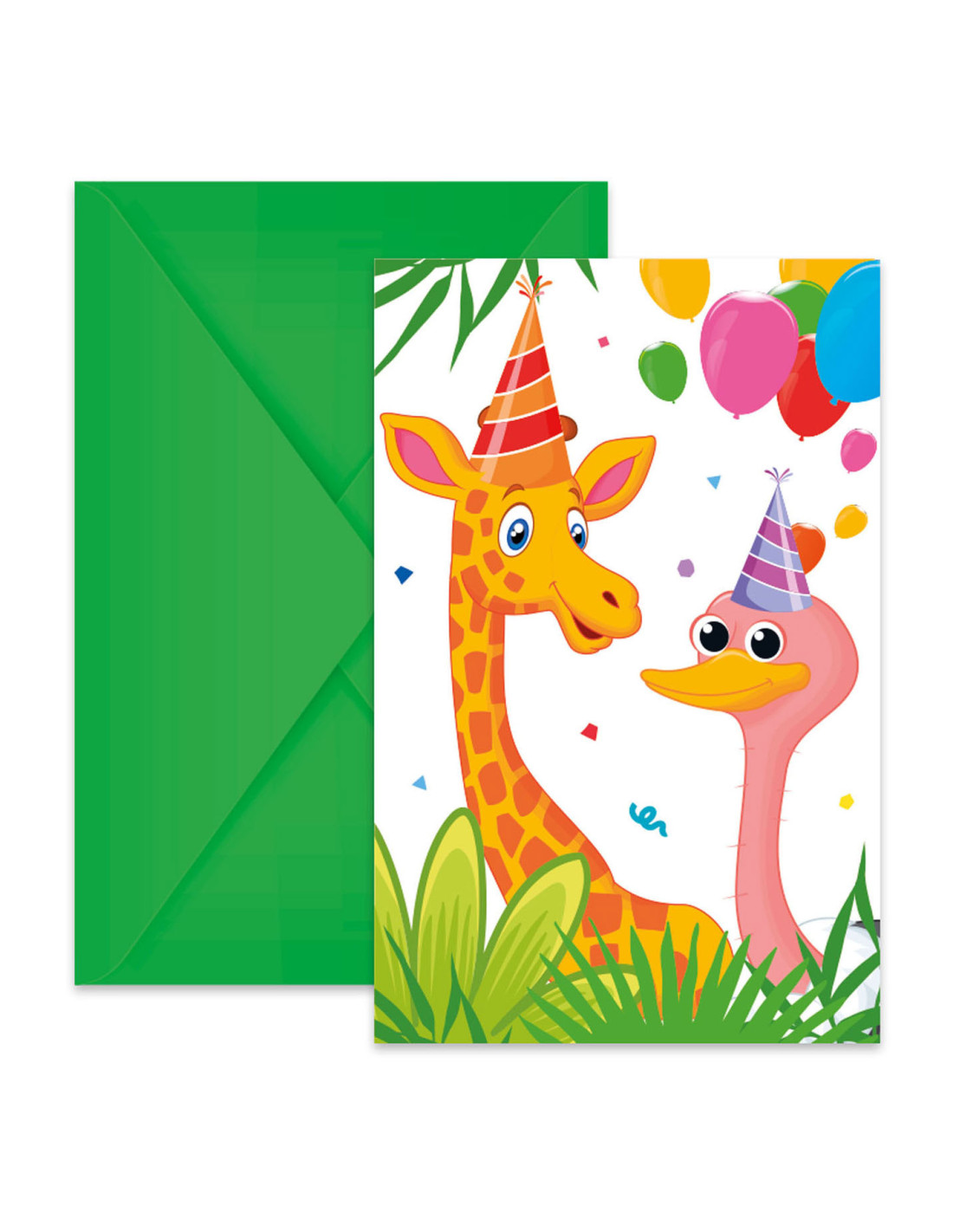 Set van 6 uitnodigingen voor een kinderfeestje met een vrolijke print van jungledieren en ballonnen. De uitnodigingen worden geleverd met junglegroene enveloppen en zijn gemaakt van FSC-gecertificeerd papier. Ook bijpassende feestversiering zoals slingers, feestzakjes en papieren bordjes verkrijgbaar. Leuk voor een kinderfeestje met dieren- of junglethema!