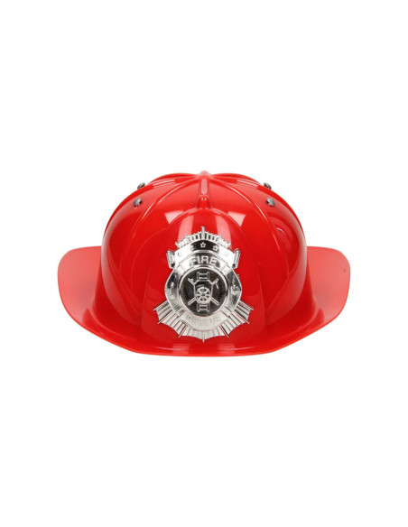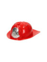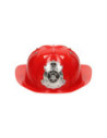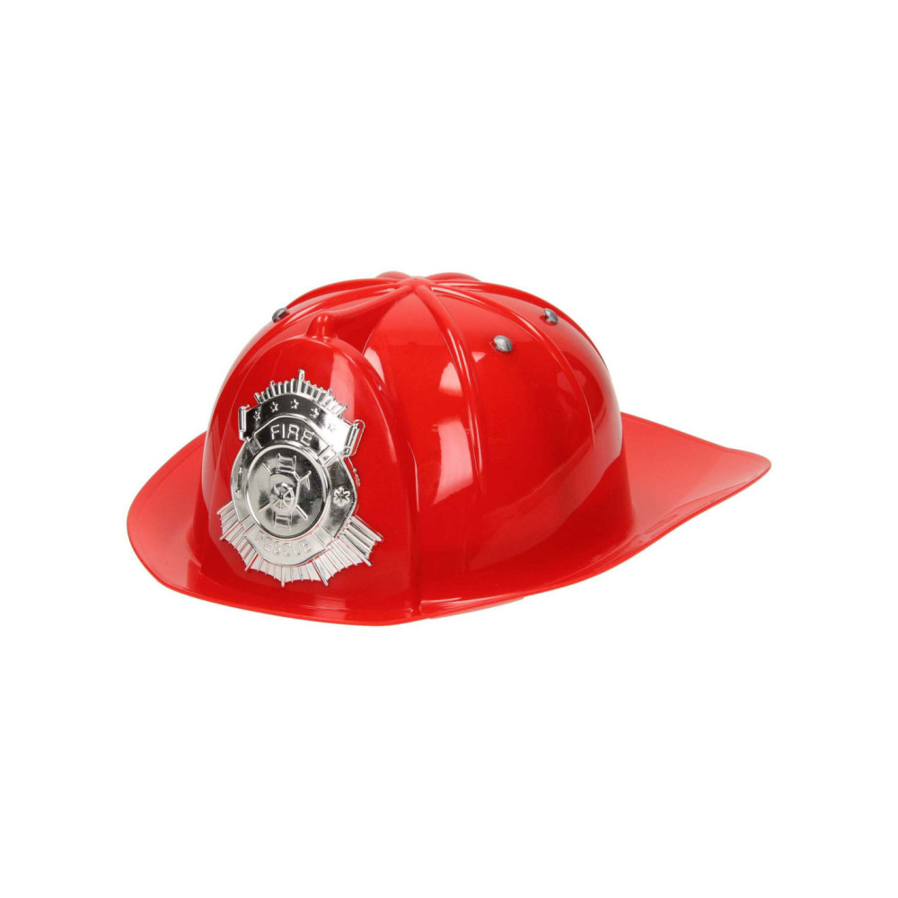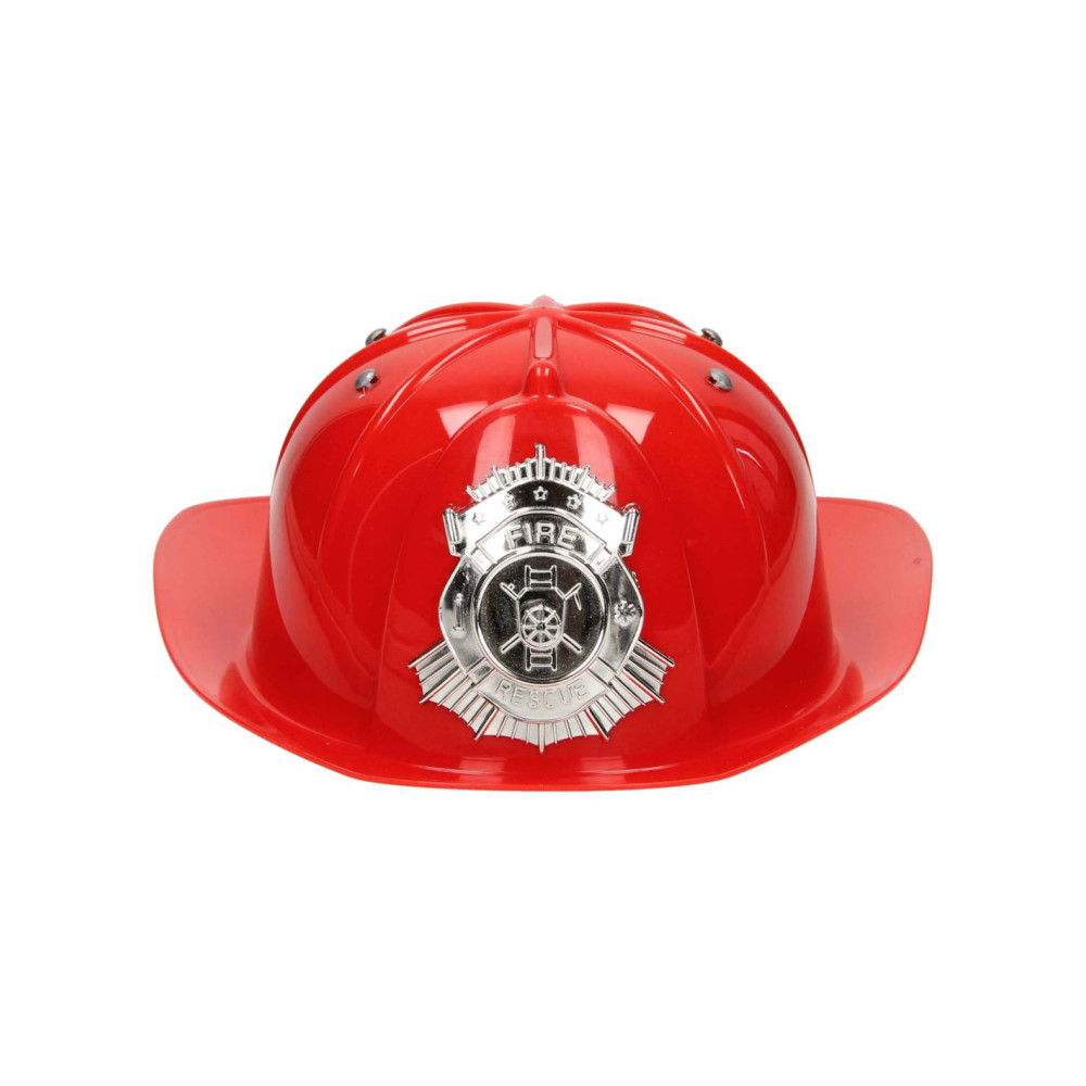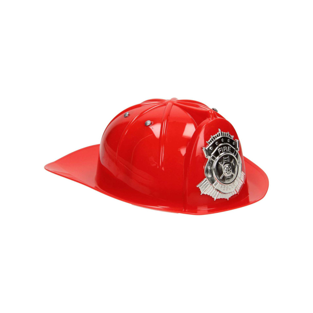 Rode brandweerhelm van kunststof, met daarop een embleem en de tekst 'Fire Chief'.
