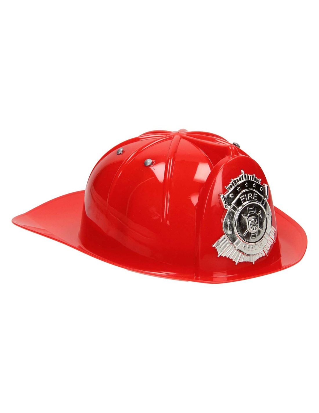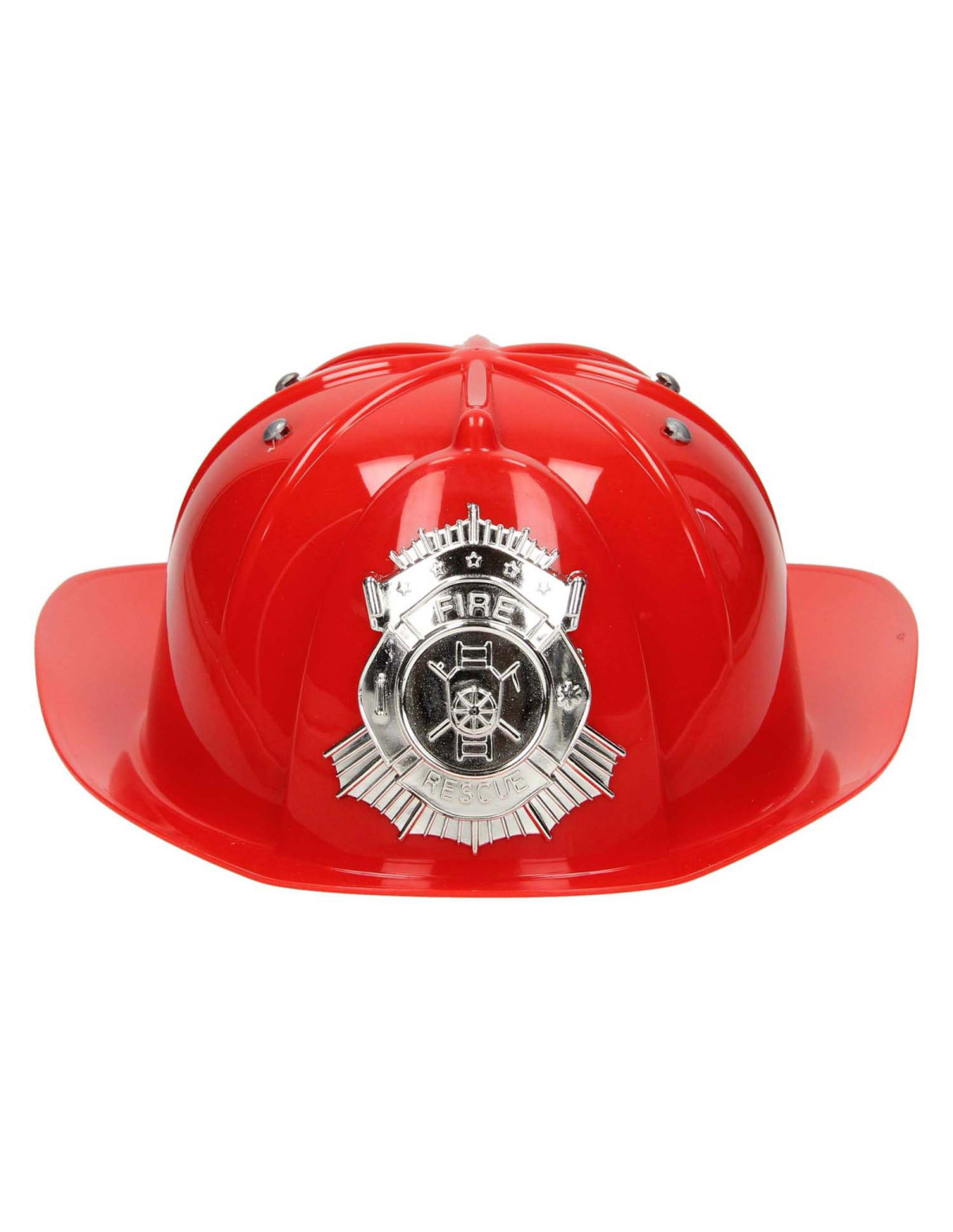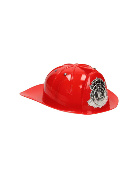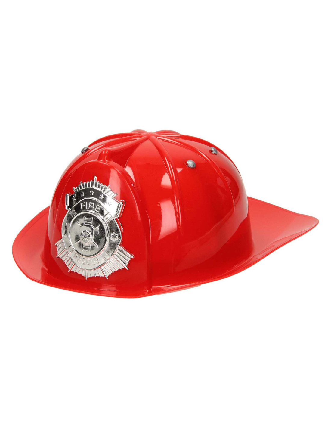 Rode brandweerhelm van kunststof, met daarop een embleem en de tekst 'Fire Chief'.