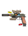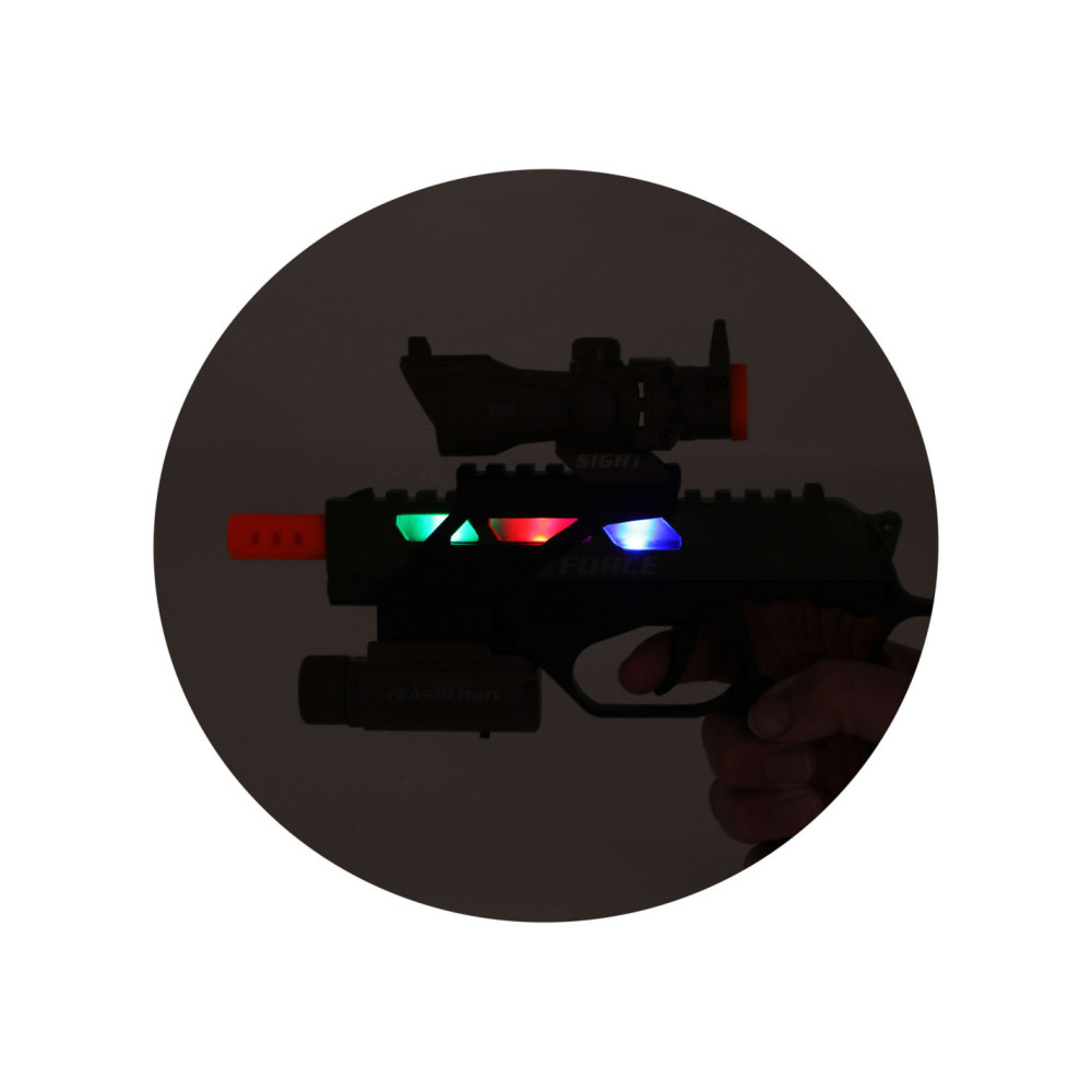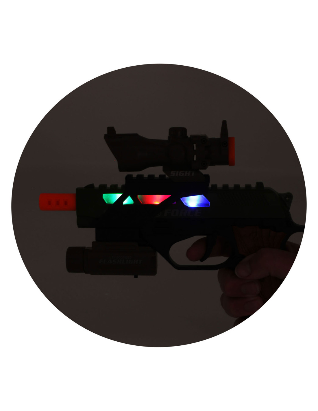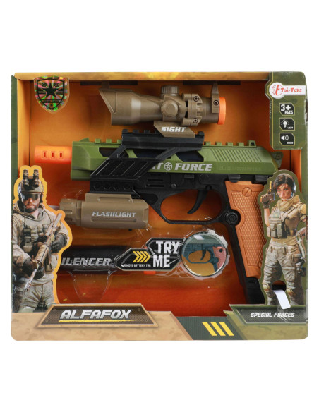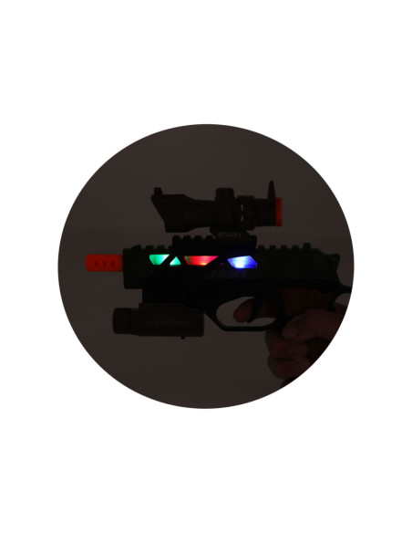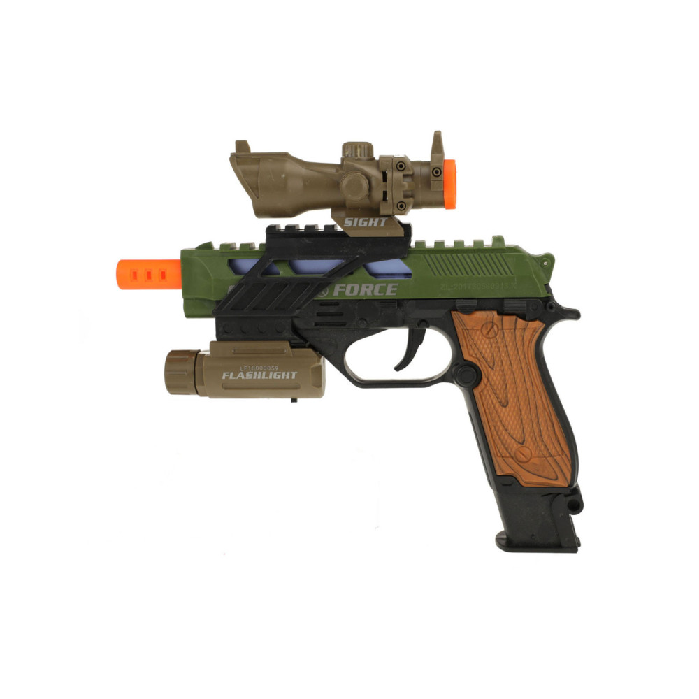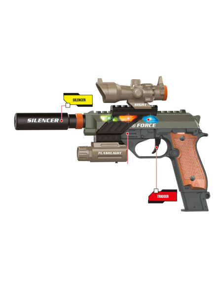 Droom je van een leven bij de ‘special forces’? Dit speelgoed legerpistool heeft coole licht- en geluidfuncties en een demper, trekker, zaklamp en vizier. Het geweer is gemaakt van kunststof en wordt geleverd inclusief batterijen. Afmetingen: 23 x 20 centimeter groot. Geschikt voor kinderen van 3 jaar en ouder.