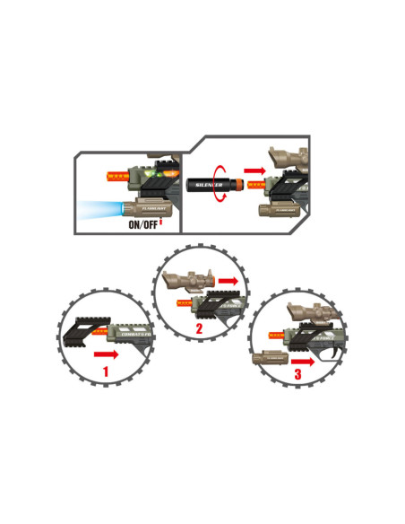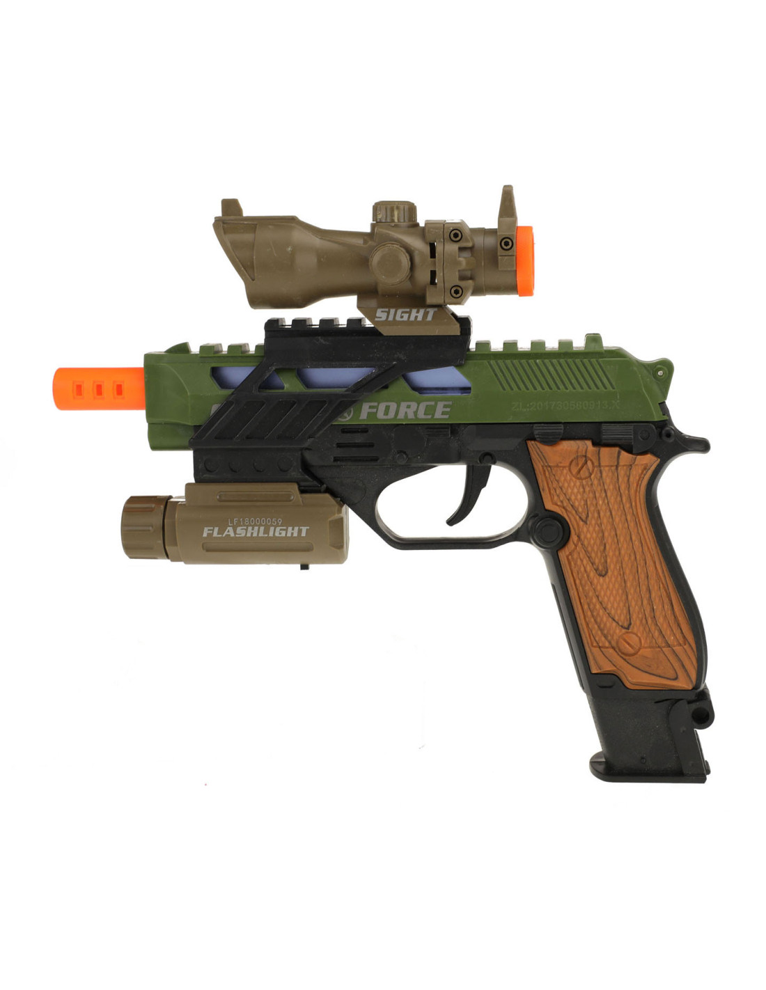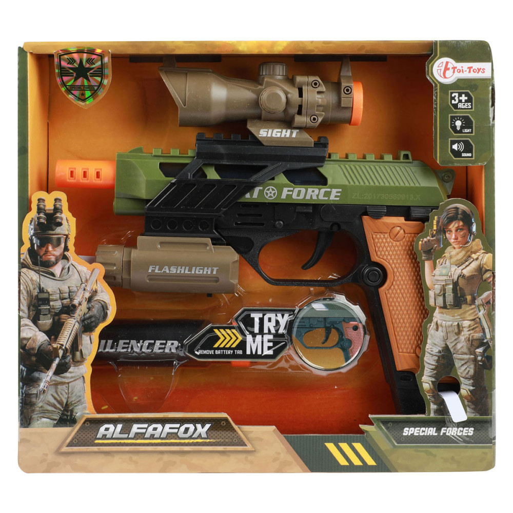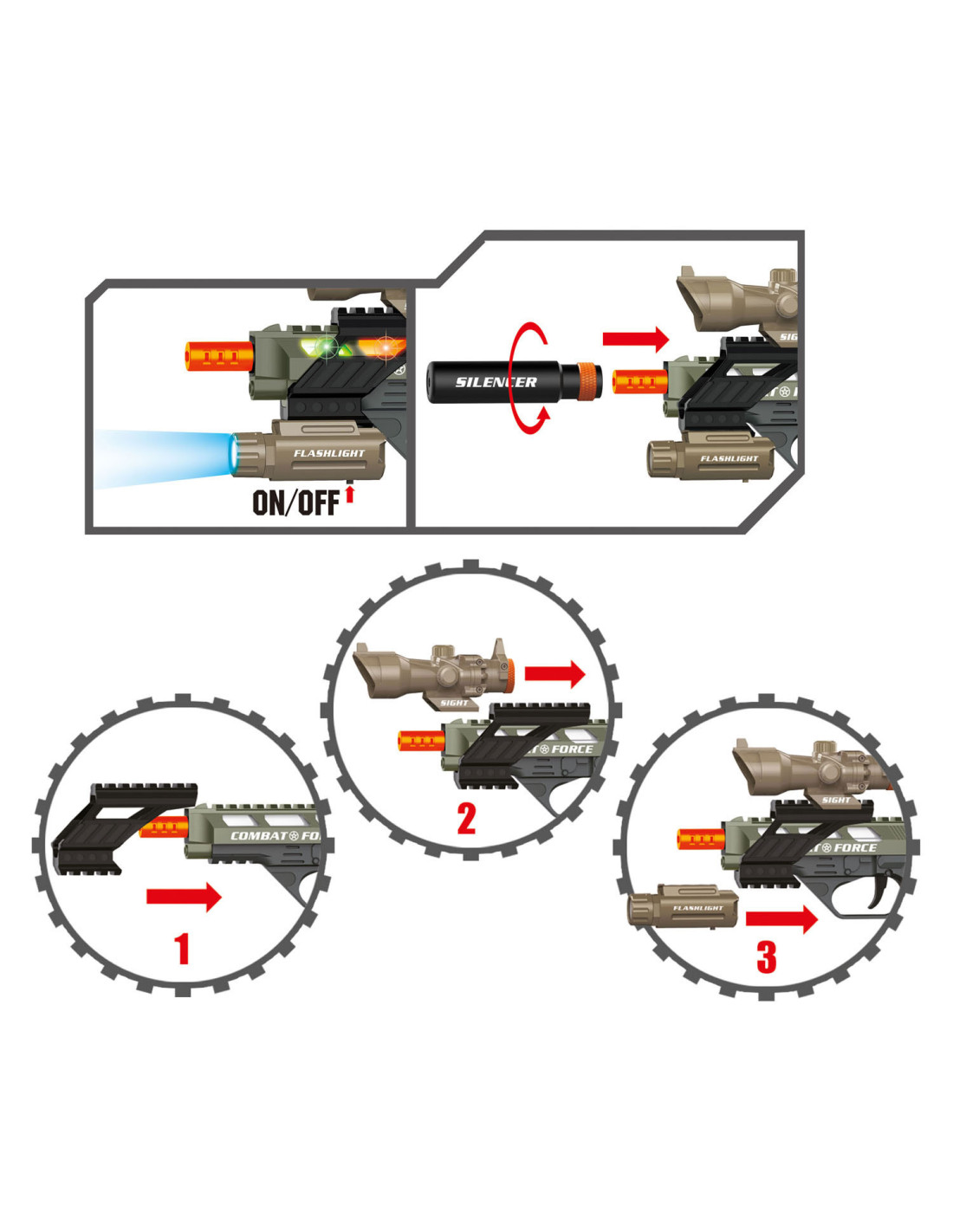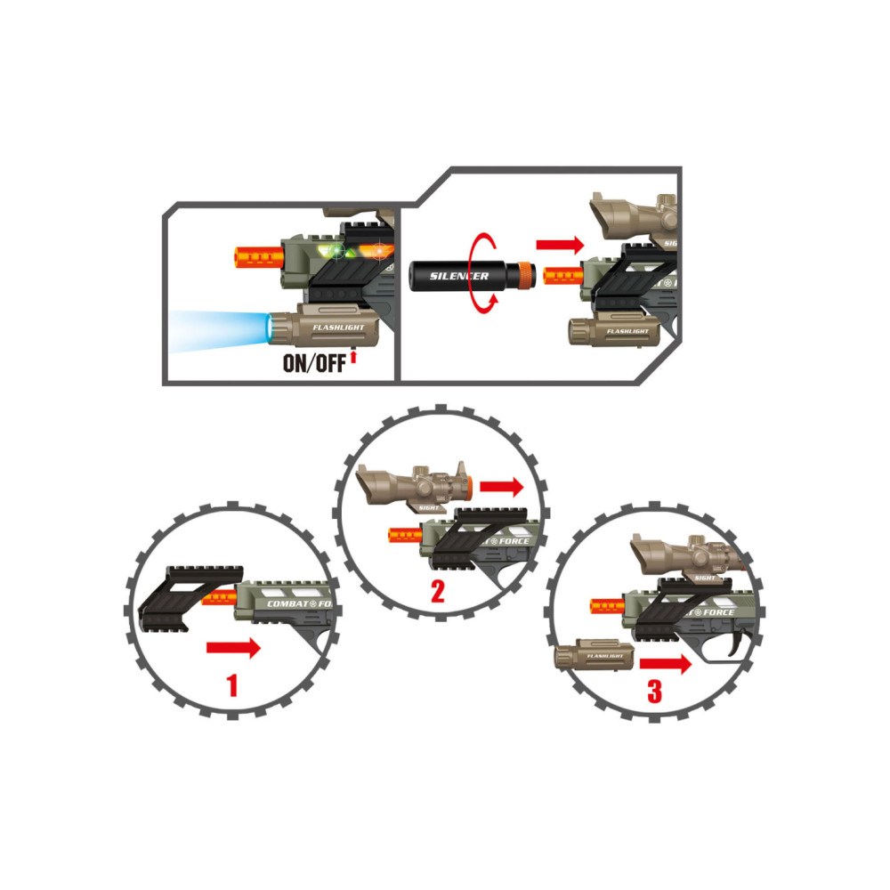 Droom je van een leven bij de ‘special forces’? Dit speelgoed legerpistool heeft coole licht- en geluidfuncties en een demper, trekker, zaklamp en vizier. Het geweer is gemaakt van kunststof en wordt geleverd inclusief batterijen. Afmetingen: 23 x 20 centimeter groot. Geschikt voor kinderen van 3 jaar en ouder.