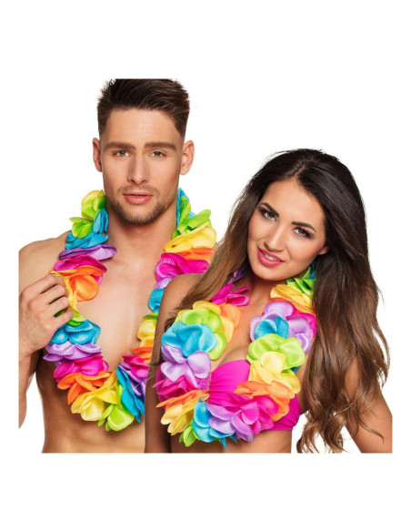 Deze XL bloemenkrans in regenboogkleuren is gemaakt van polyester en ideaal voor tropische themafeesten. Lichtgewicht en geschikt voor volwassenen.