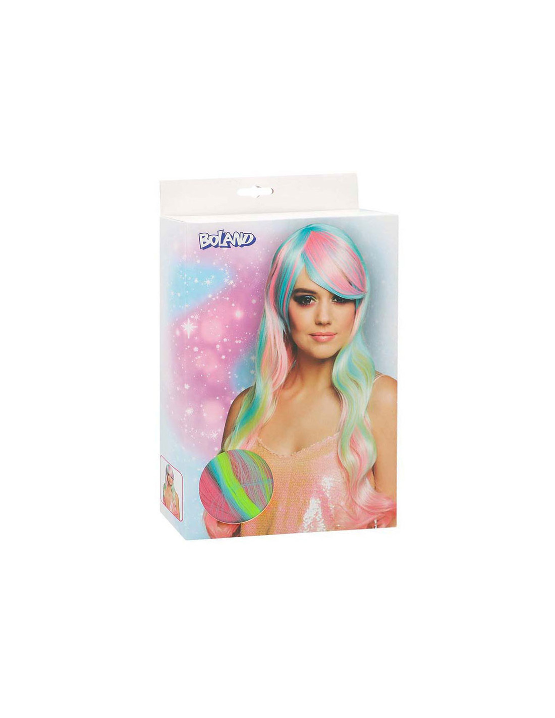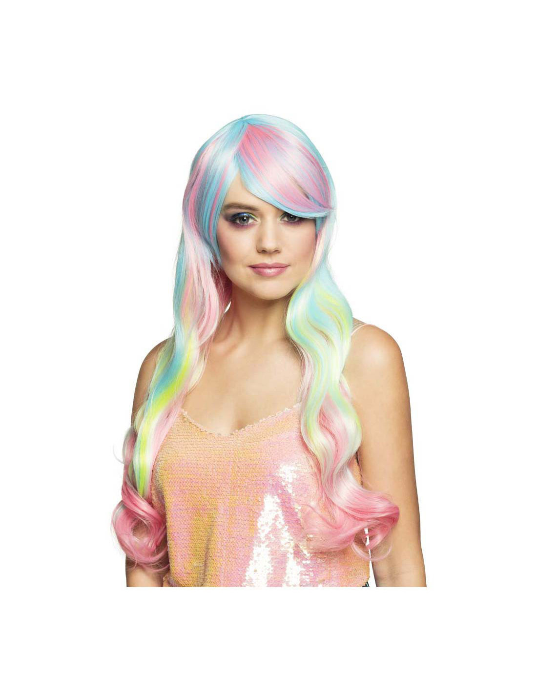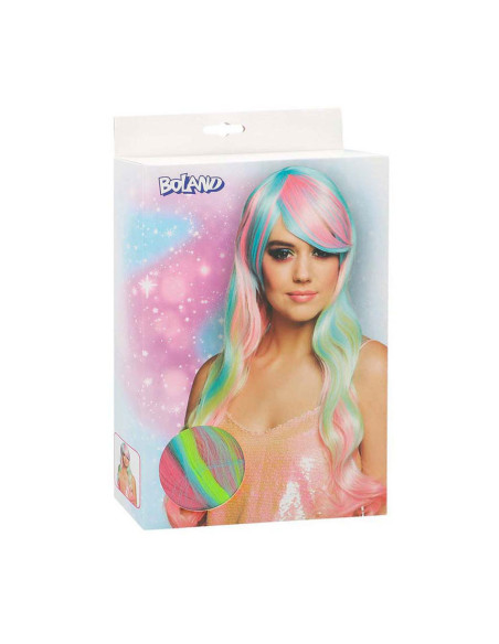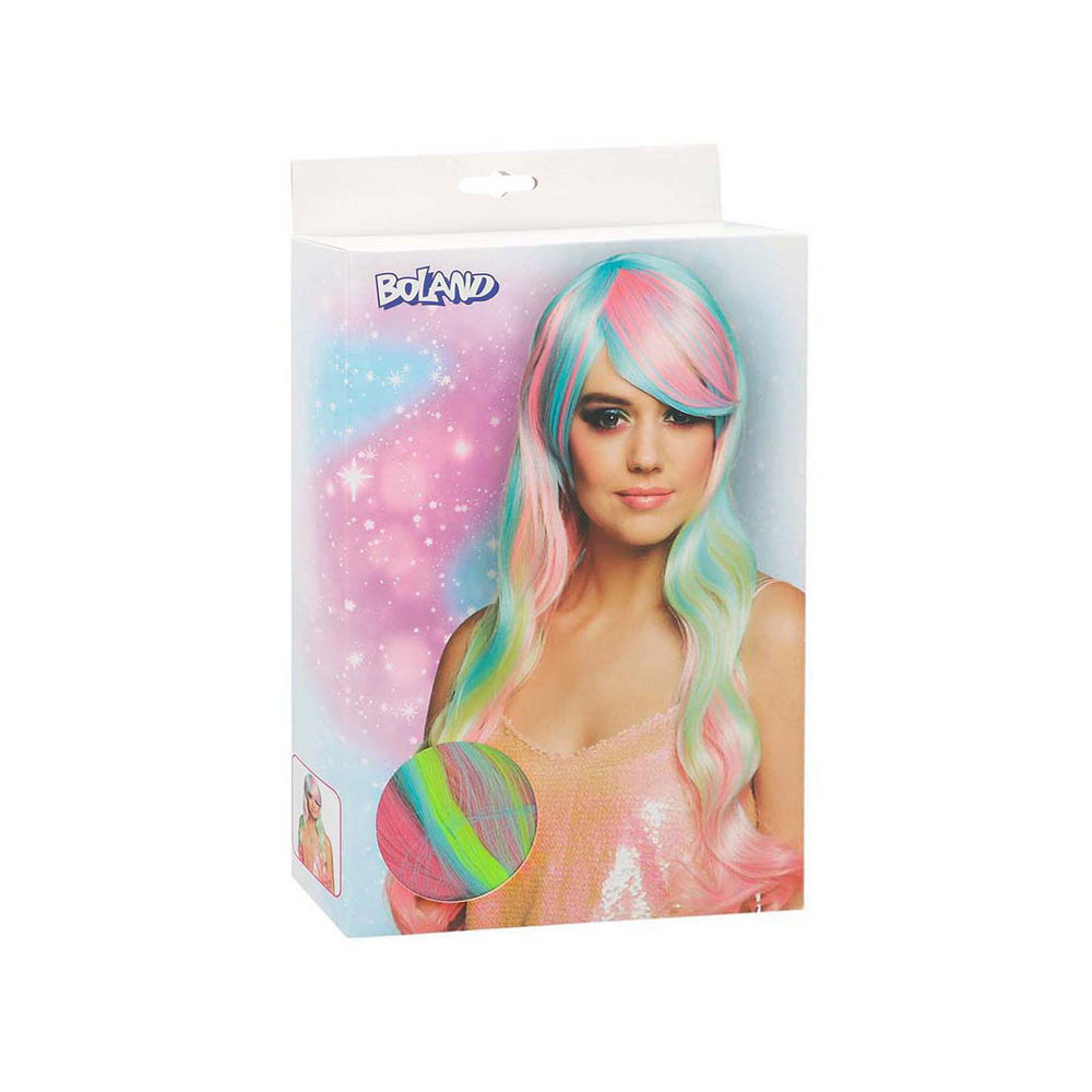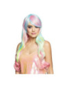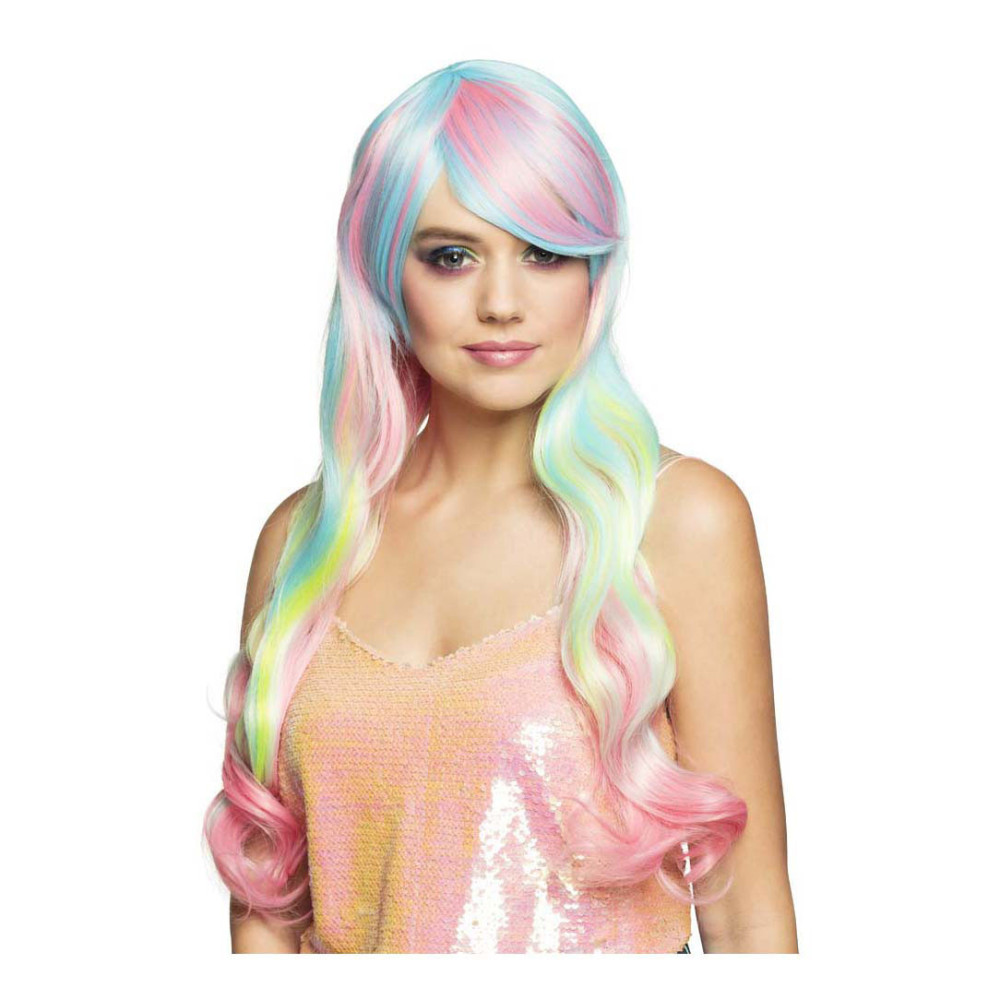 Lange, pastel regenboog damespruik met steil haar en schuine pony, gemaakt van synthetisch materiaal. Geschikt voor volwassenen met een hoofdomtrek van circa 58 cm. Niet wasbaar en niet geschikt voor kinderen onder de 14 jaar.