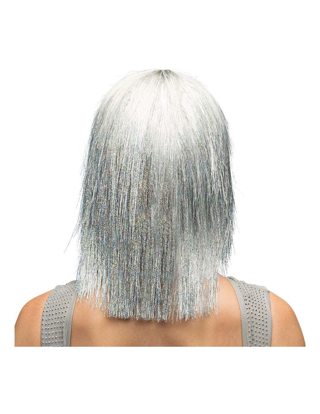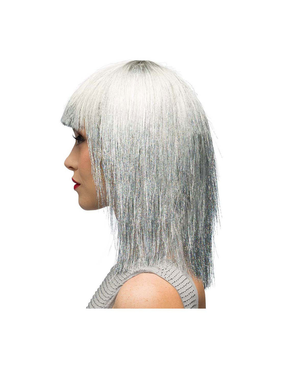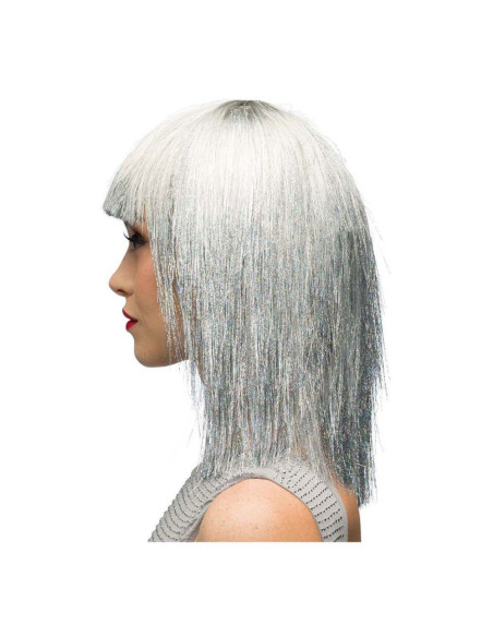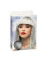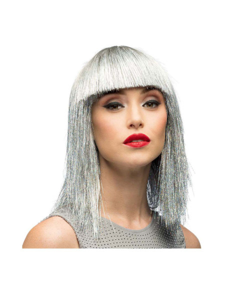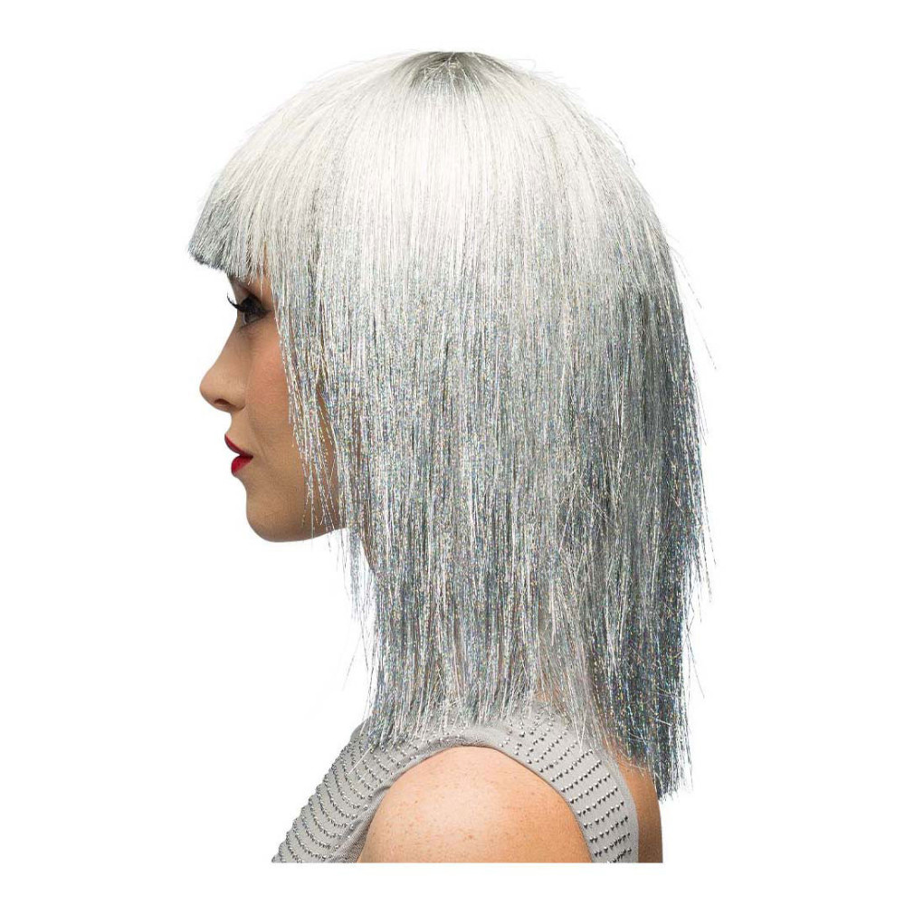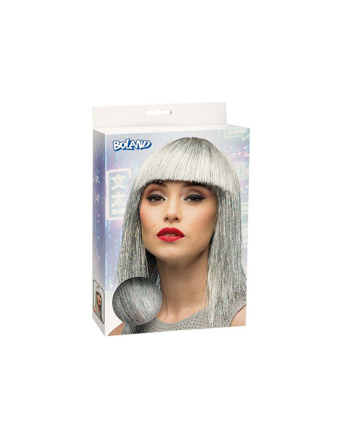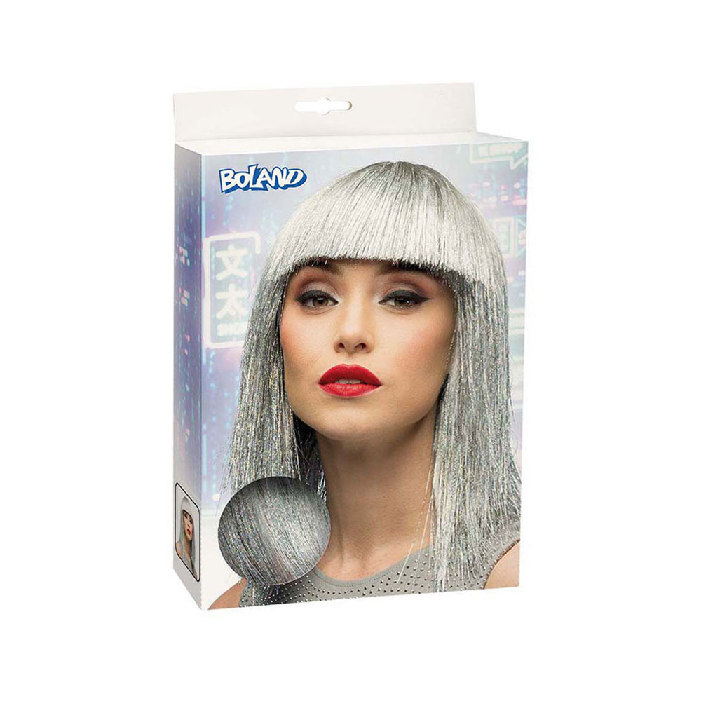 Halflange, metallic zilveren damespruik met steil haar en rechte pony, gemaakt van kunststof. Comfortabele pasvorm voor volwassenen met een hoofdomtrek van circa 58 cm. Niet wasbaar en niet geschikt voor kinderen onder de 14 jaar.