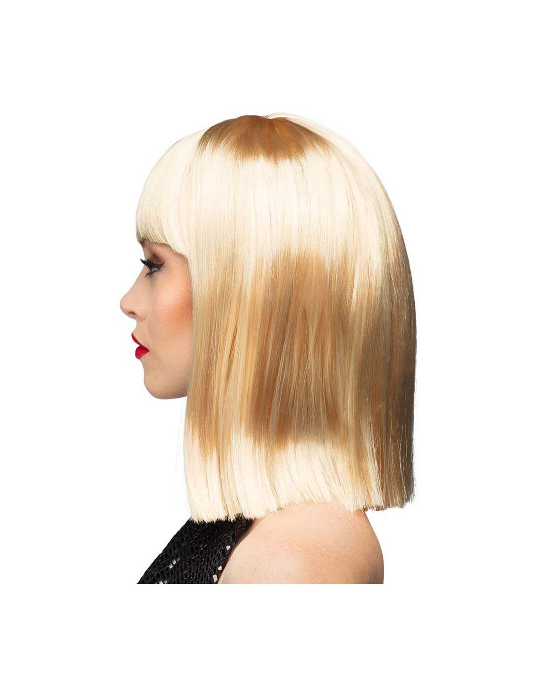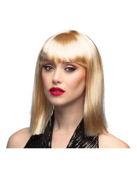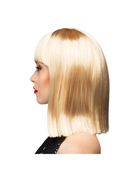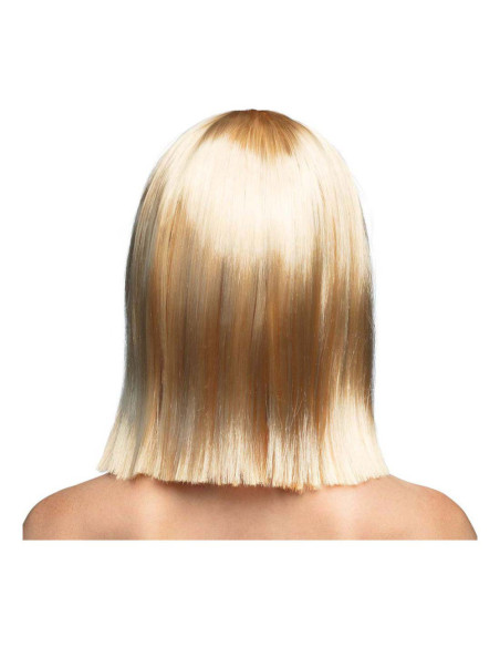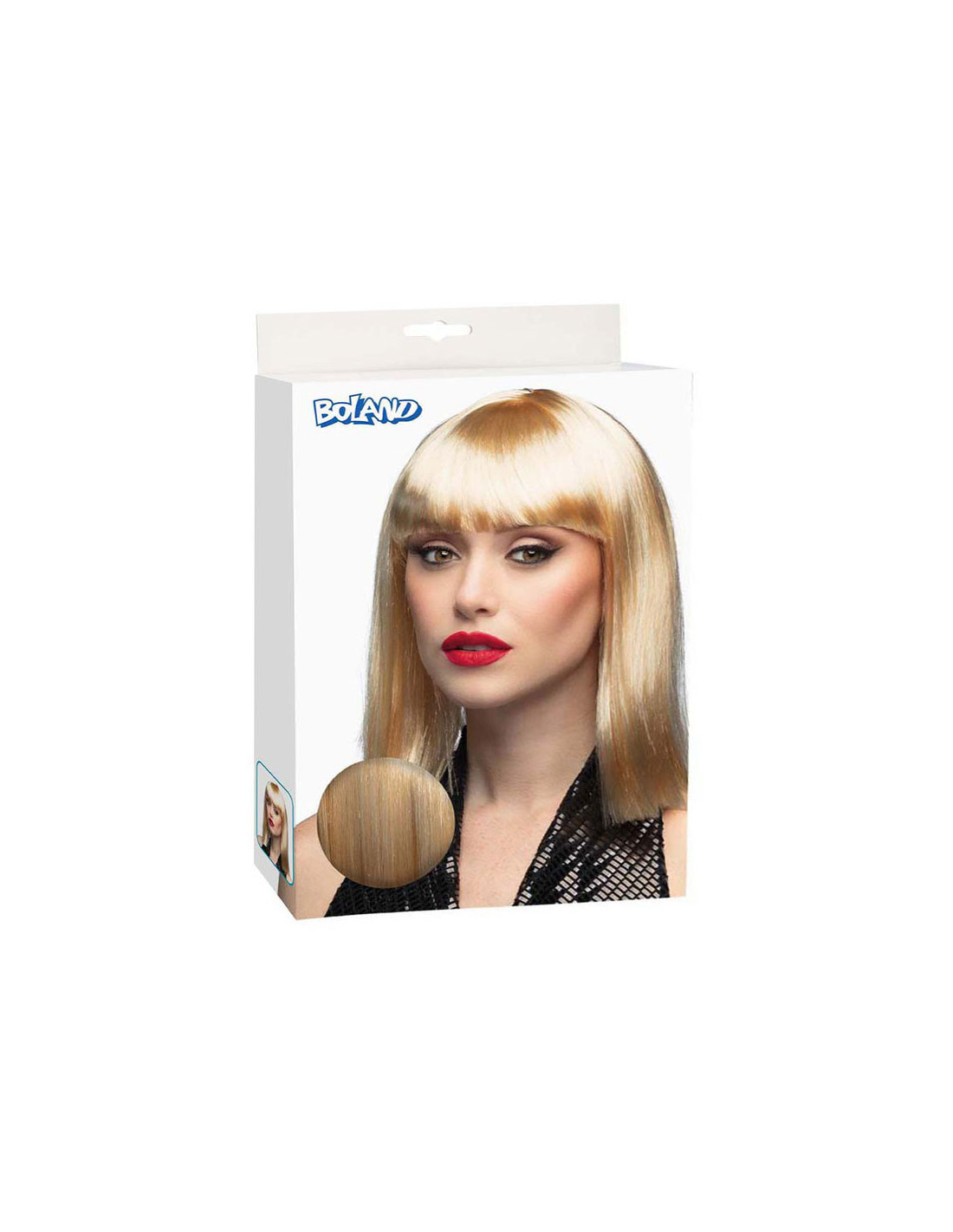Halflange, blonde damespruik met steil haar en rechte pony, gemaakt van synthetisch materiaal. Geschikt voor volwassenen met een hoofdomtrek van circa 59 cm. Niet wasbaar en niet geschikt voor kinderen onder de 14 jaar.