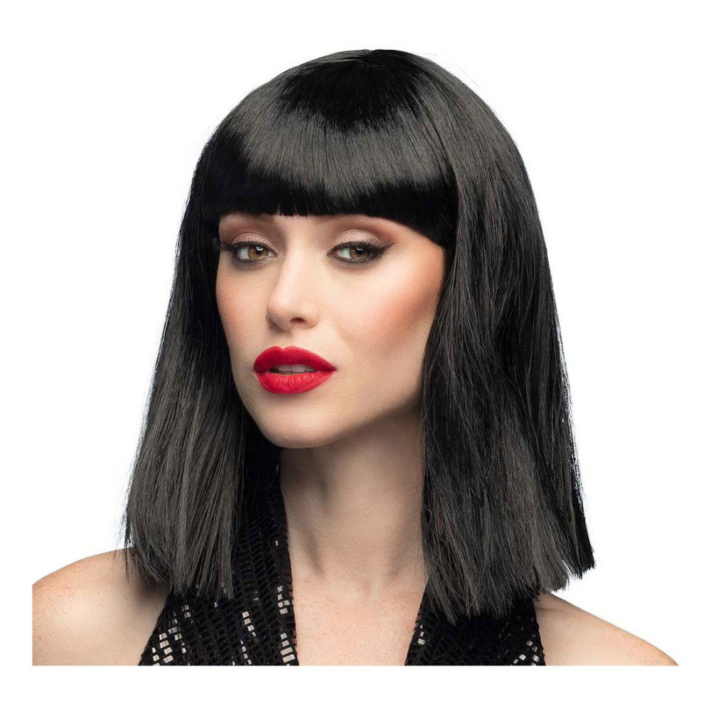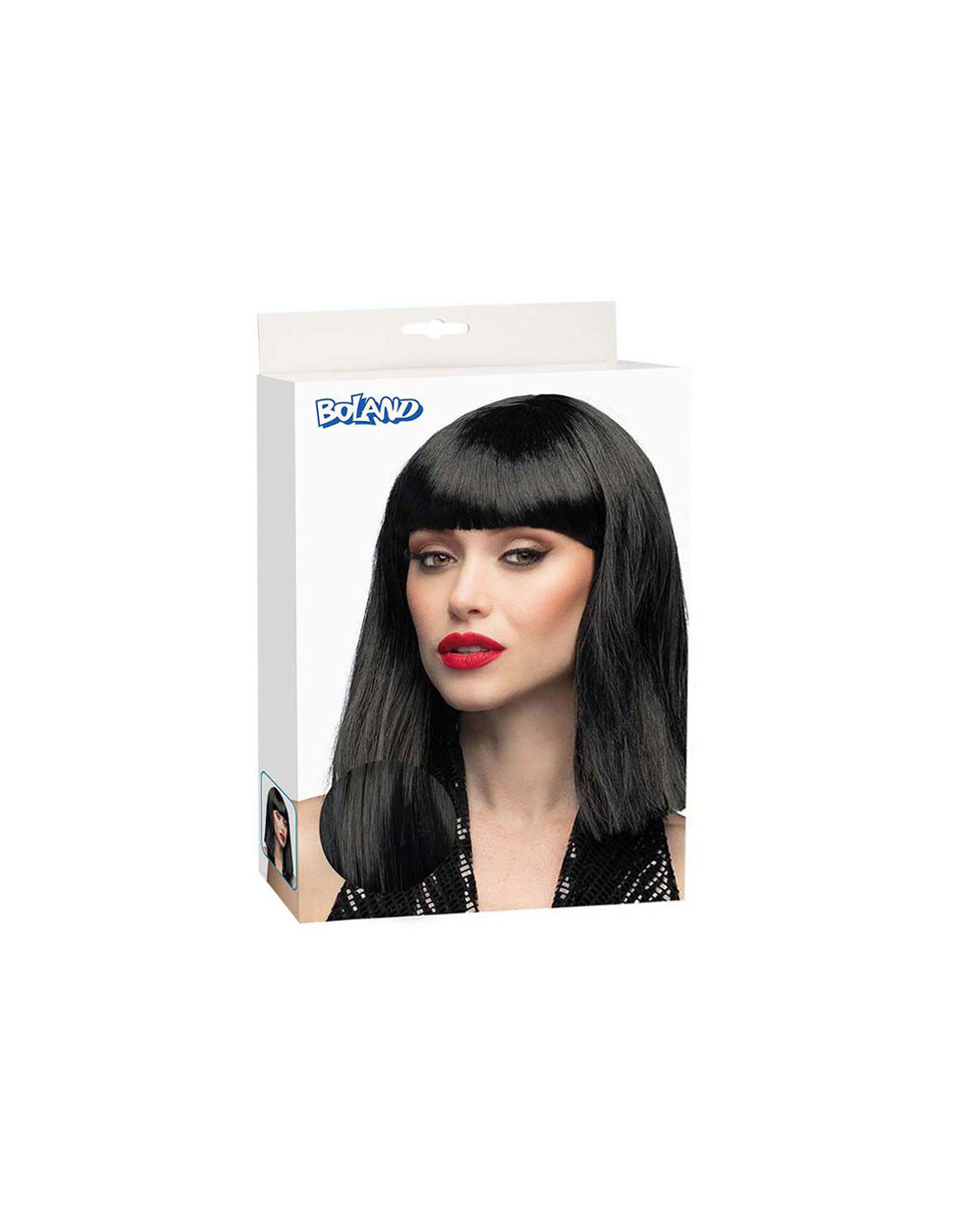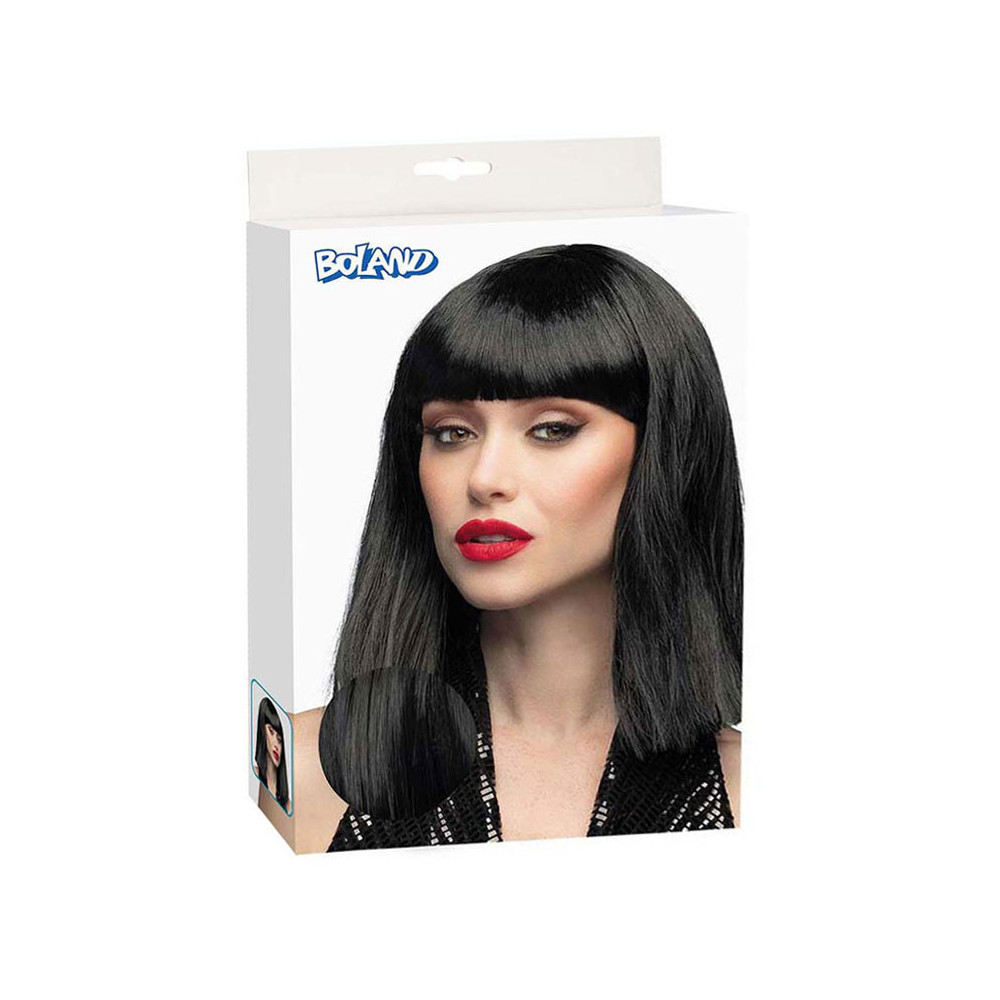 Halflange, blonde damespruik met steil haar en rechte pony, gemaakt van synthetisch materiaal. Geschikt voor volwassenen met een hoofdomtrek van circa 59 cm. Niet wasbaar en niet geschikt voor kinderen onder de 14 jaar.