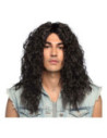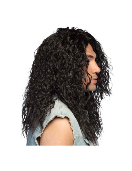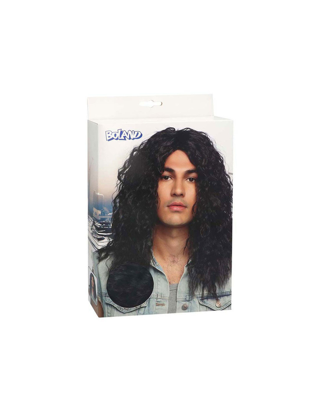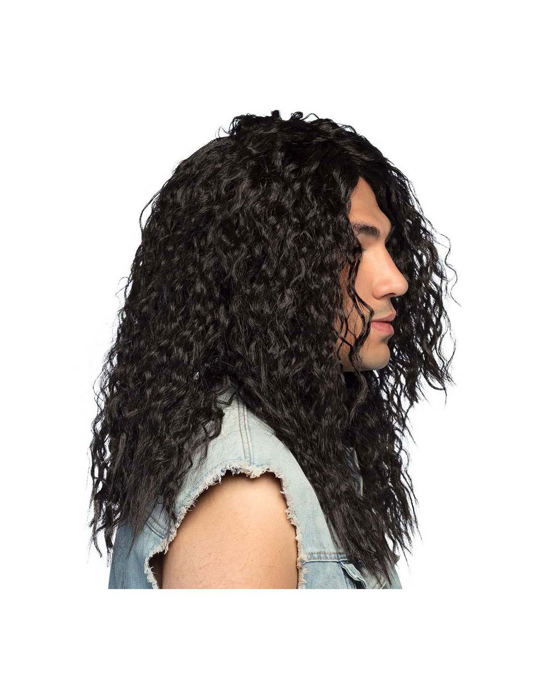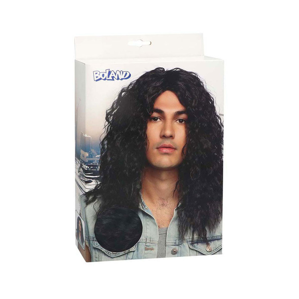 Zwarte herenpruik met lang, golvend haar, geschikt voor volwassenen. Perfect voor jaren '80 themafeesten of als rock-'n-roll look. Gemaakt van synthetisch materiaal voor een realistische uitstraling.