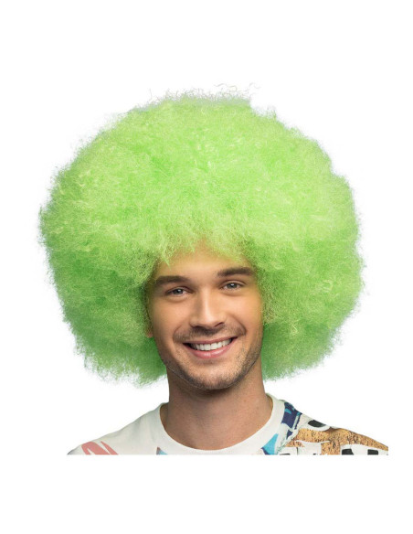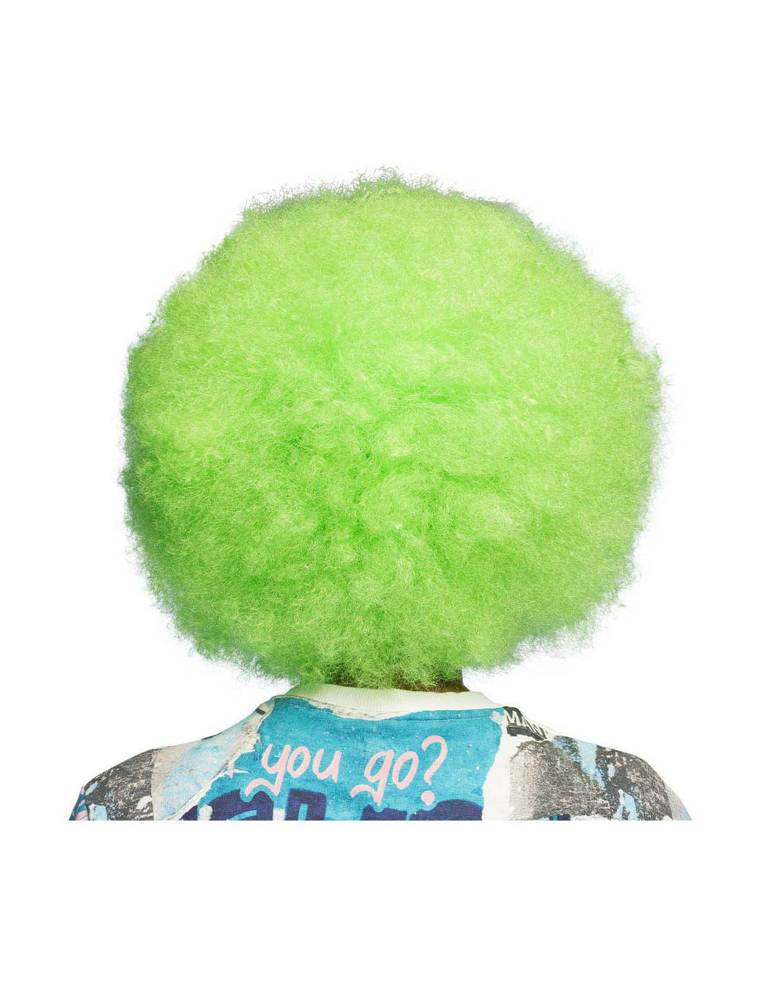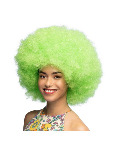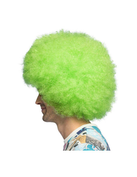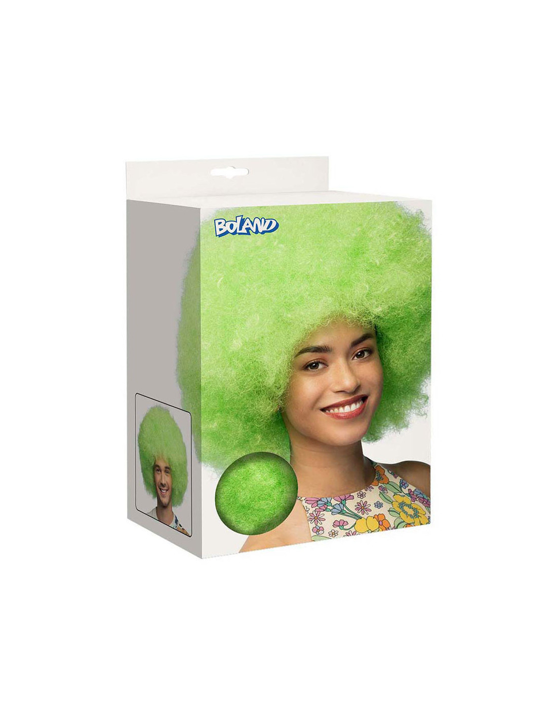 Korte, neongroene pruik met afrohaar, gemaakt van synthetisch materiaal. Geschikt voor volwassenen met een hoofdomtrek van circa 59 cm. Niet wasbaar en niet geschikt voor kinderen onder de 14 jaar.