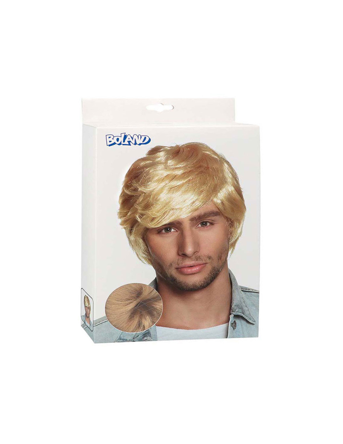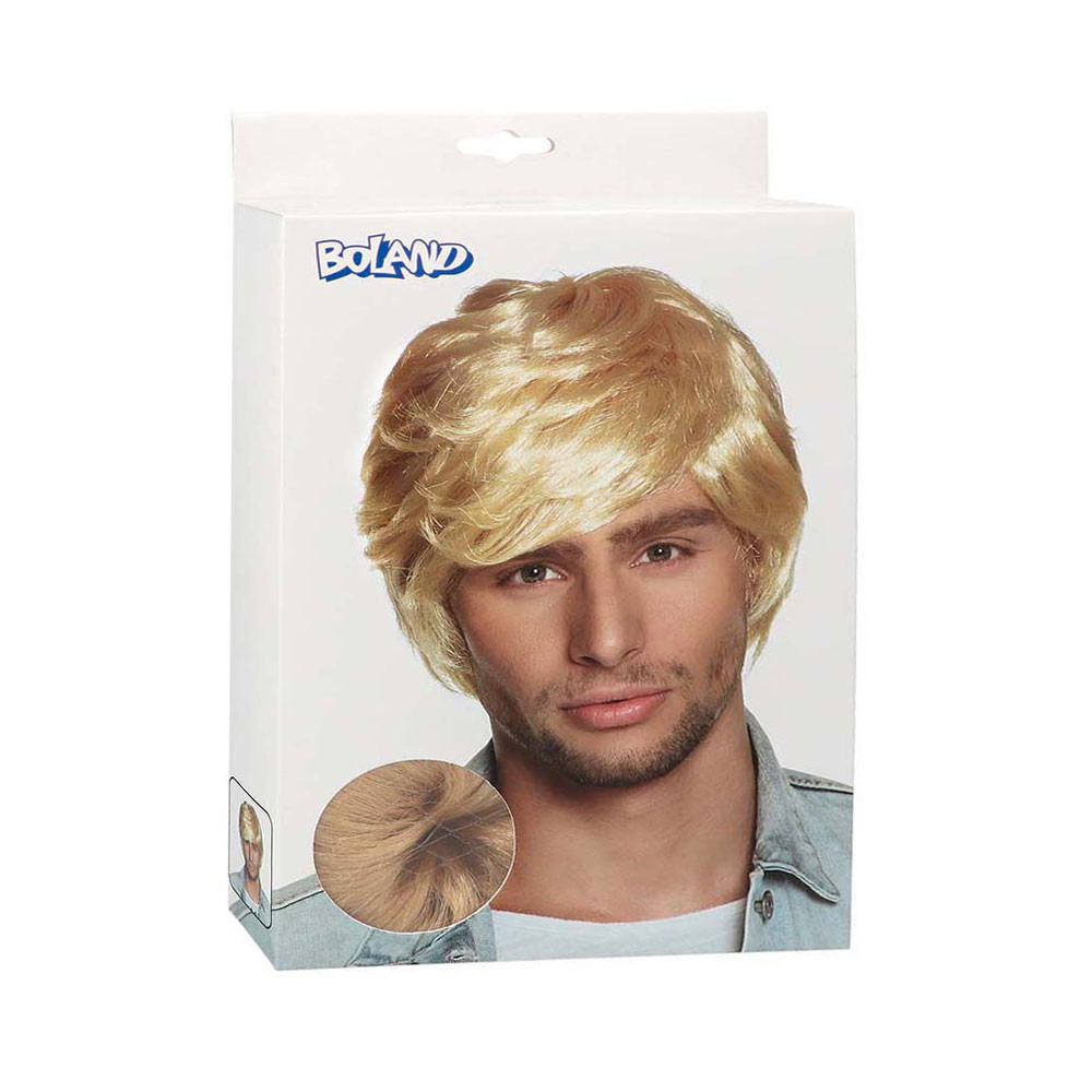 Steile, korte blonde herenpruik, geschikt voor volwassenen. Perfect voor themafeesten of als retro-accessoire. Gemaakt van synthetisch materiaal voor een realistische uitstraling.