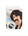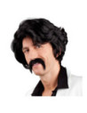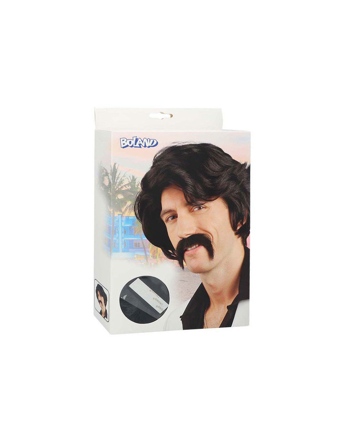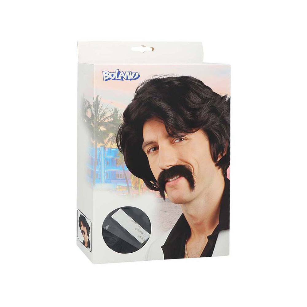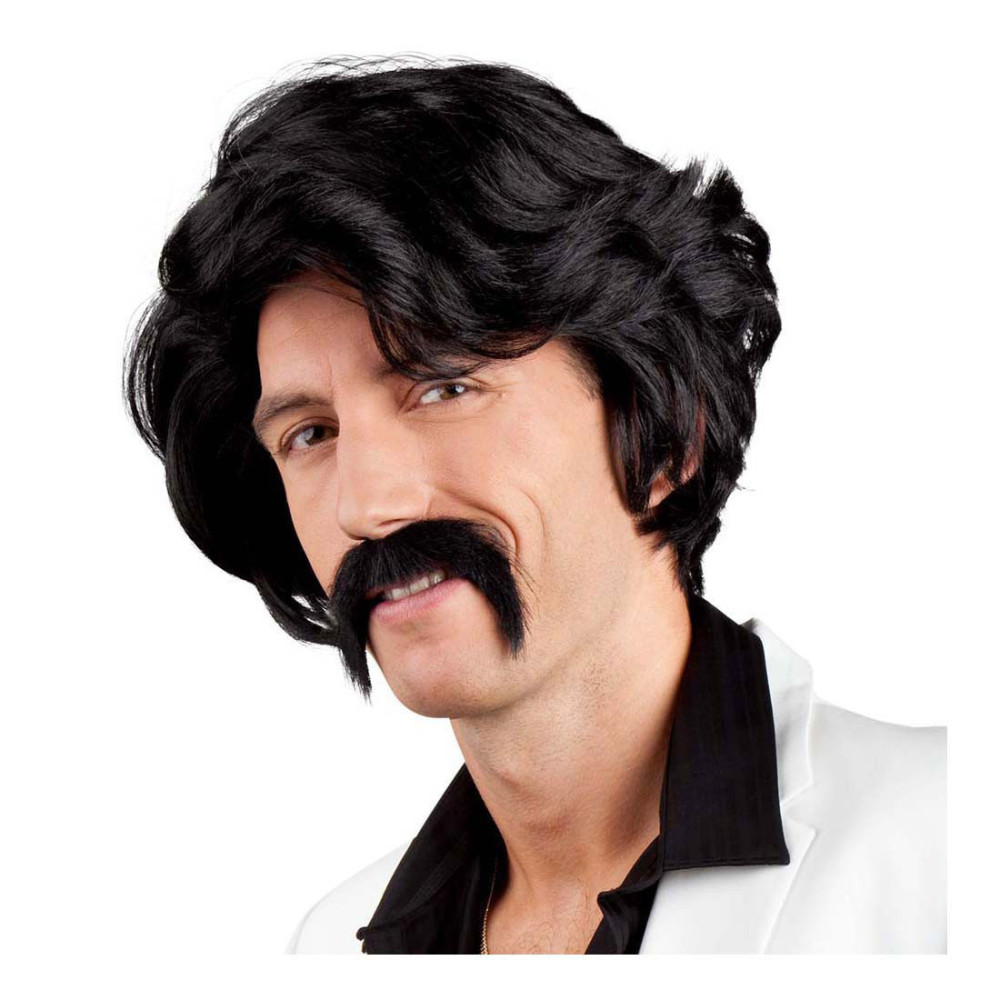 Steile, halflange zwarte herenpruik met bijpassende snor, geschikt voor volwassenen. Perfect voor jaren '80 themafeesten of als retro-accessoire. Gemaakt van synthetisch materiaal voor een realistische uitstraling.