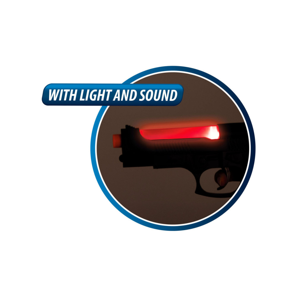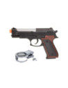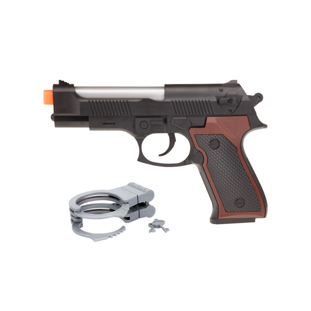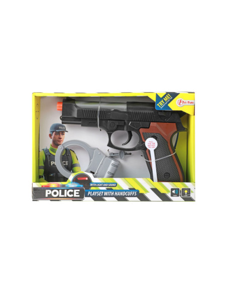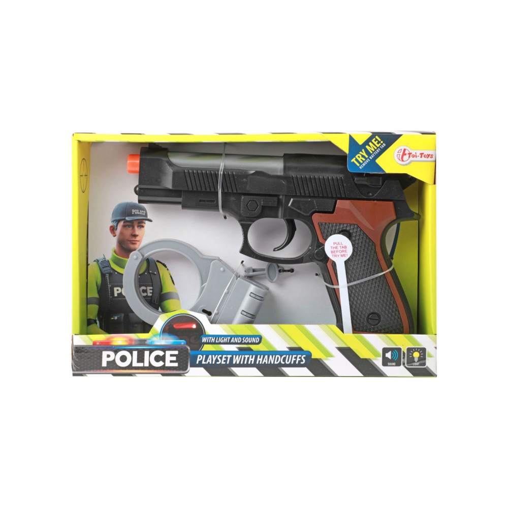 Speelgoed politieset met 1 speelgoedpistool en een paar handboeien, inclusief sleuteltje. Het pistool heeft een cool licht- en geluidseffect. Geschikt voor kinderen van 3 jaar en ouder.