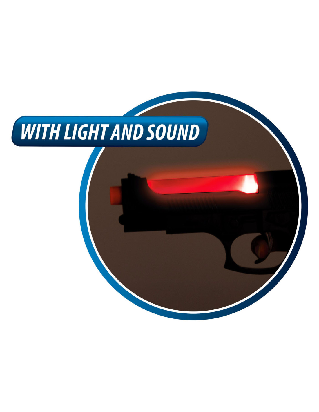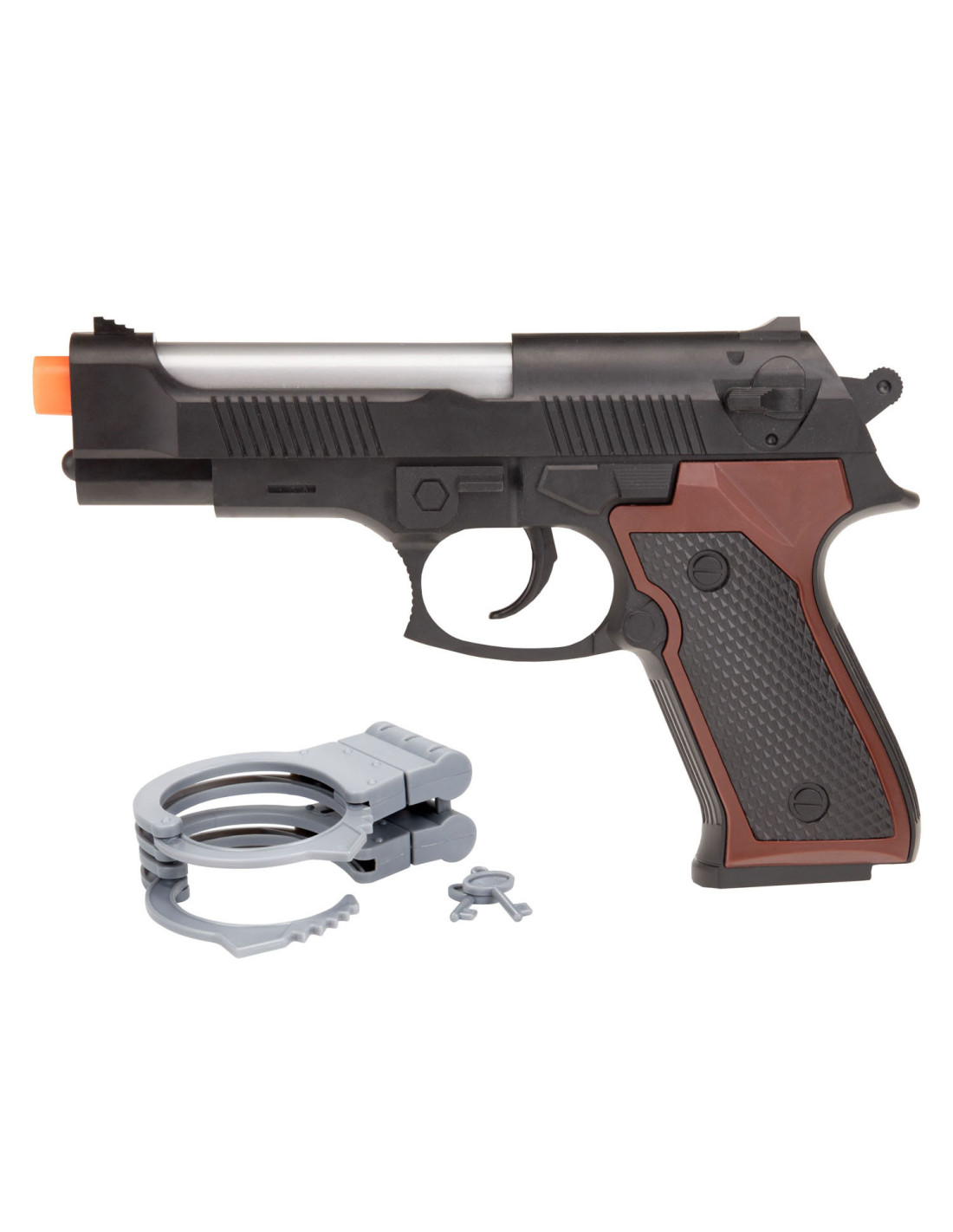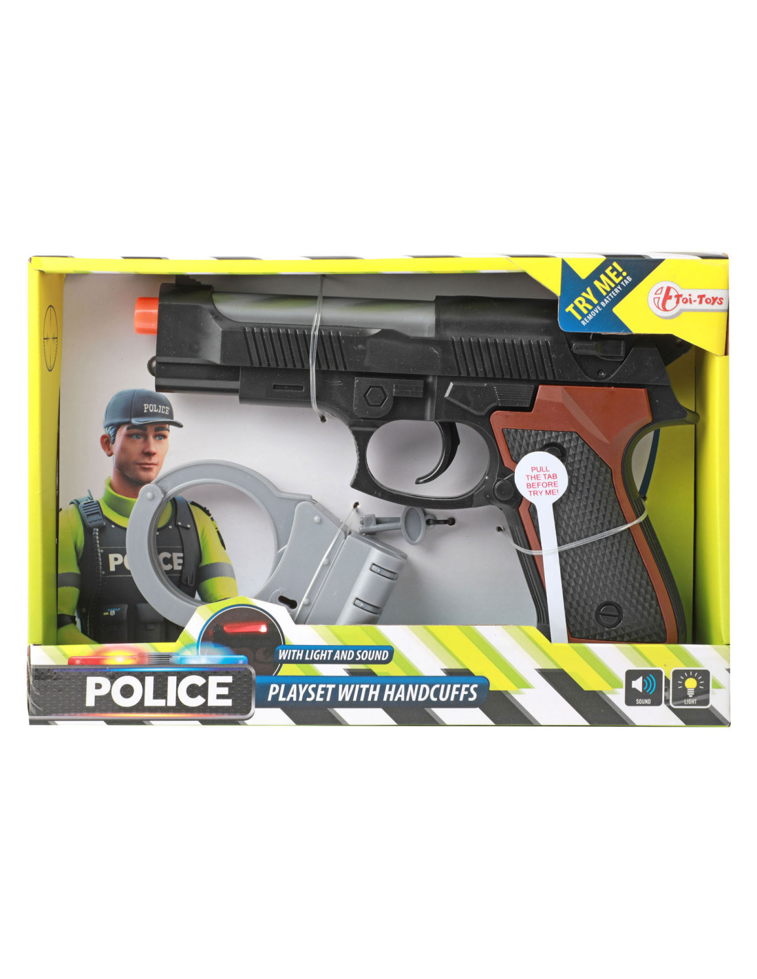 Speelgoed politieset met 1 speelgoedpistool en een paar handboeien, inclusief sleuteltje. Het pistool heeft een cool licht- en geluidseffect. Geschikt voor kinderen van 3 jaar en ouder.