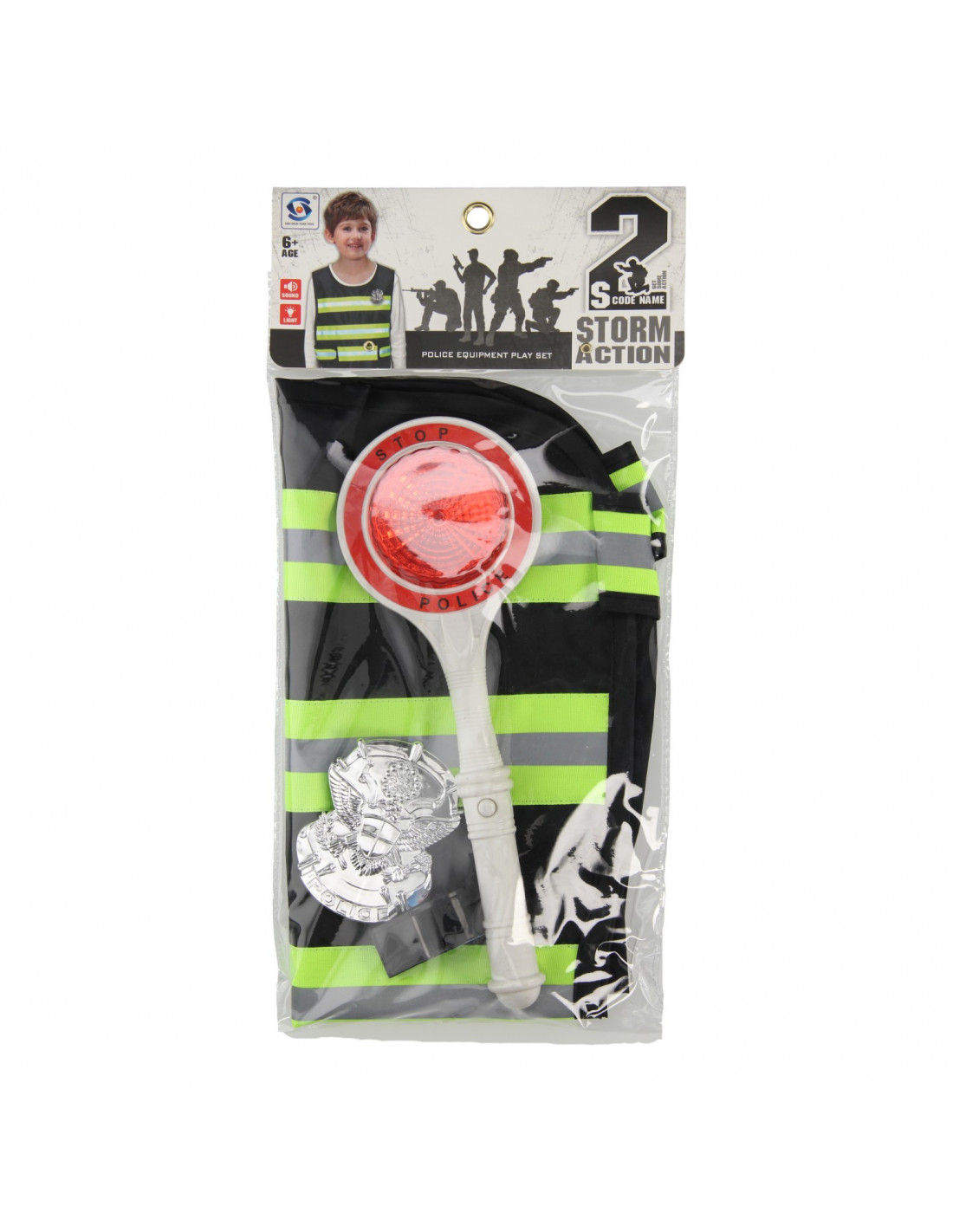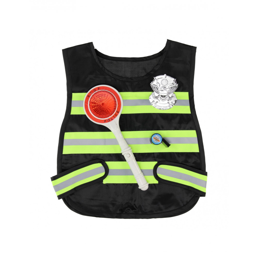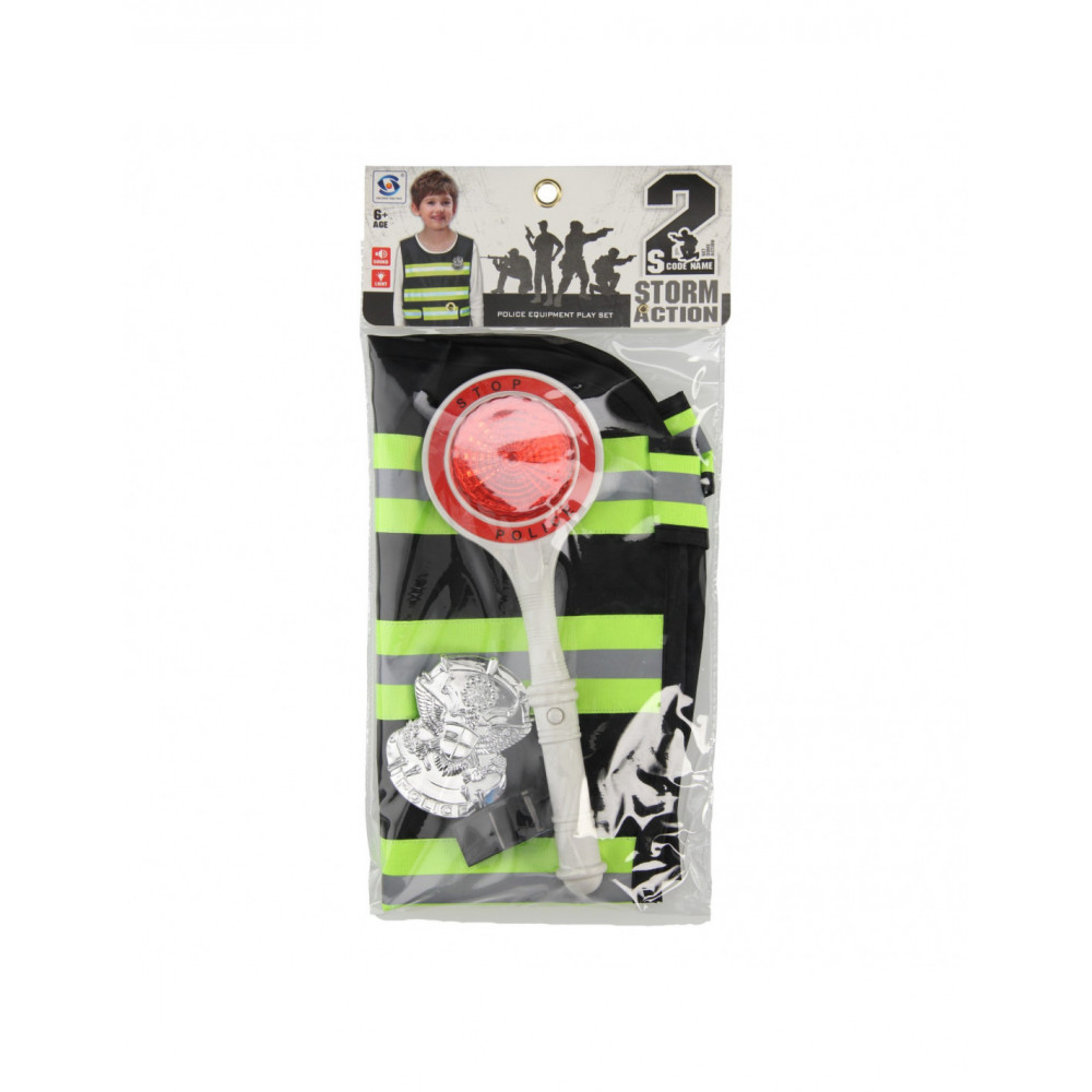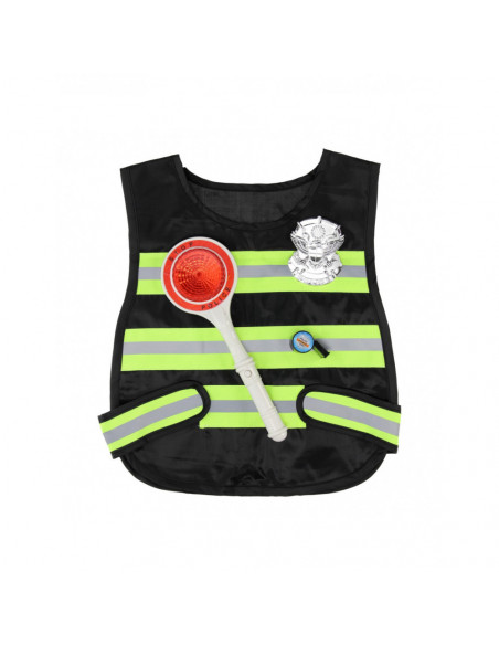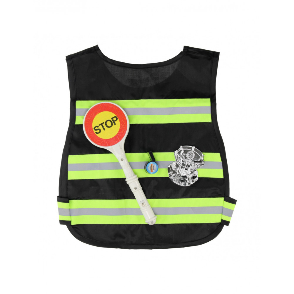 Werken de stoplichten niet meer? Tijd om in actie te komen! Met deze politie verkleedkleding set ben je helemaal klaar om de chaos in het verkeer op te lossen. Trek je politie hesje aan en speld je politiebadge op om er professioneel uit te zien. Deze set bevat een stopbord, een fluit, een badge en een politie hesje. Het stopbord geeft licht en maakt geluid, wat het extra leuk en realistisch maakt. De benodigde batterijen zijn inbegrepen, zodat je direct aan de slag kunt.